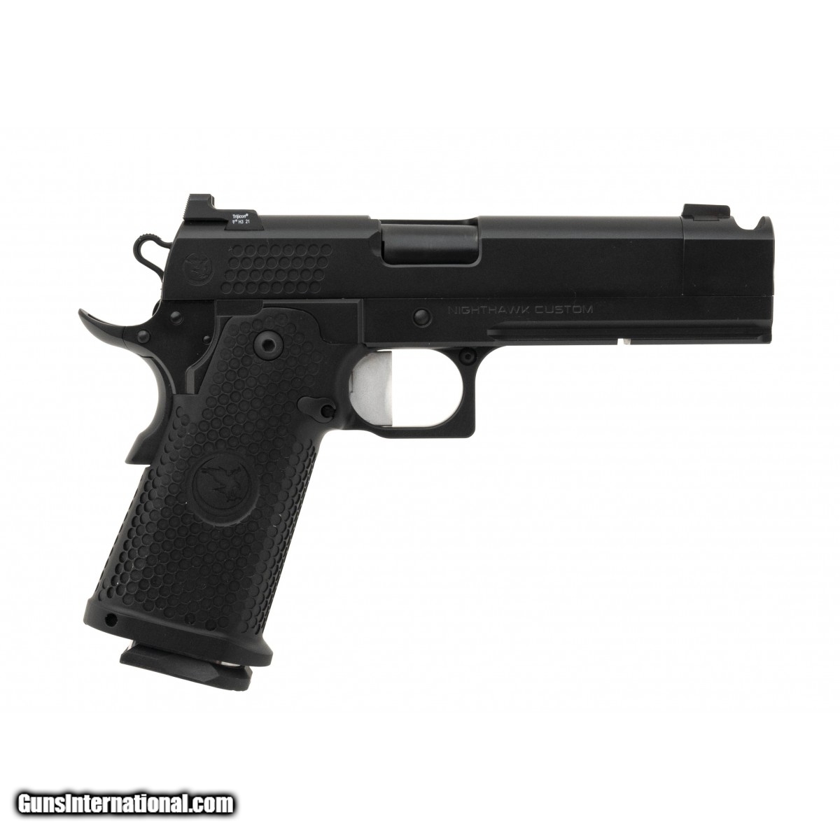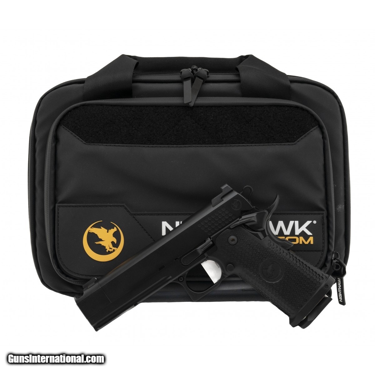 SN:NDS00884 Modern production. Nighthawk Custom TRS Comp. 5"" barrel with integrated compensator chambered in 9mm. Trijicon tritium night sights. Excellent condition. Comes with soft case and 1 magazine.