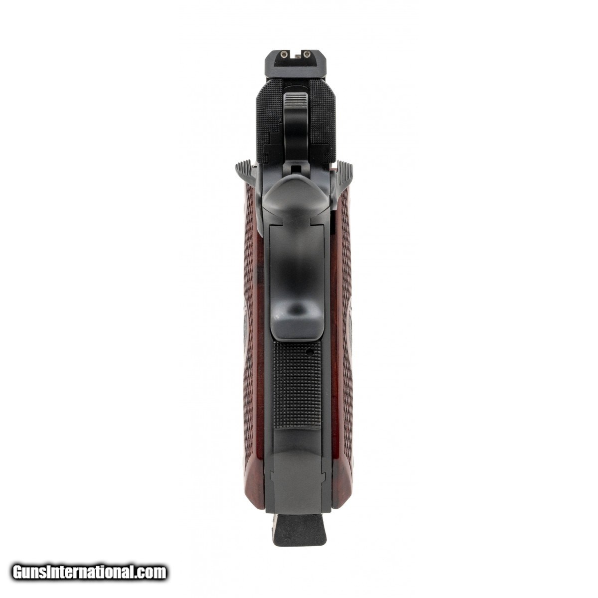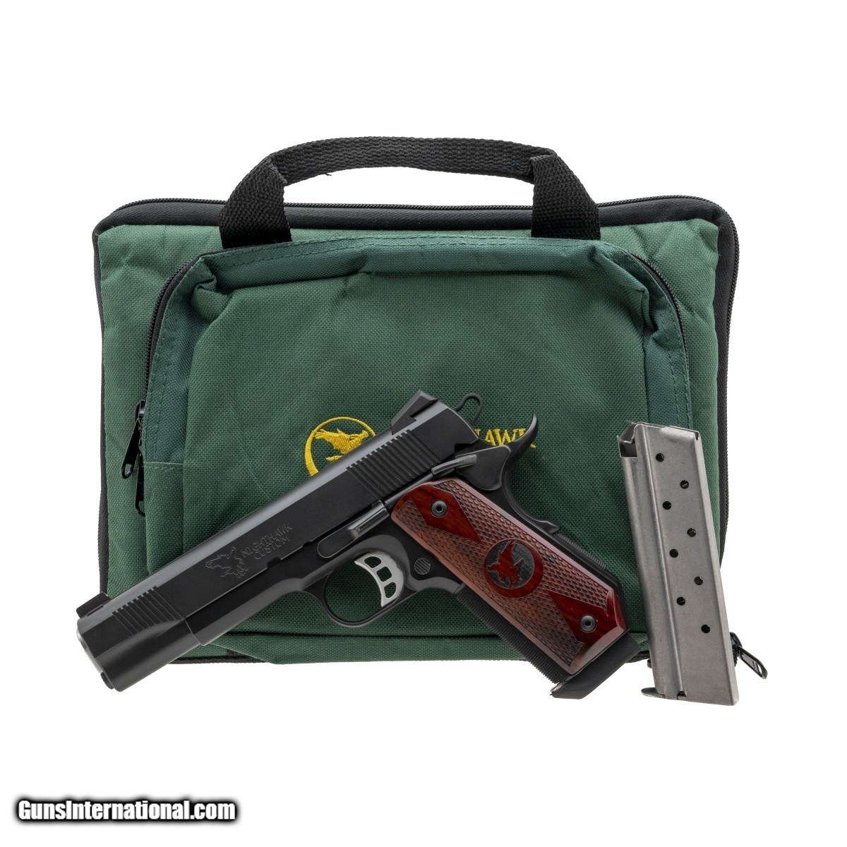 Description: " SN:NCP11134. Modern production, 9x19mm parabellum with a 5"" barrel. Bore is in excellent condition. full size 1911 frame with Novak Trijicon front-rear night sight. diamond pattern wood grips and front and rear slide serration. Overall condition is excellent. Comes with nighthawk bag. SOLD |
