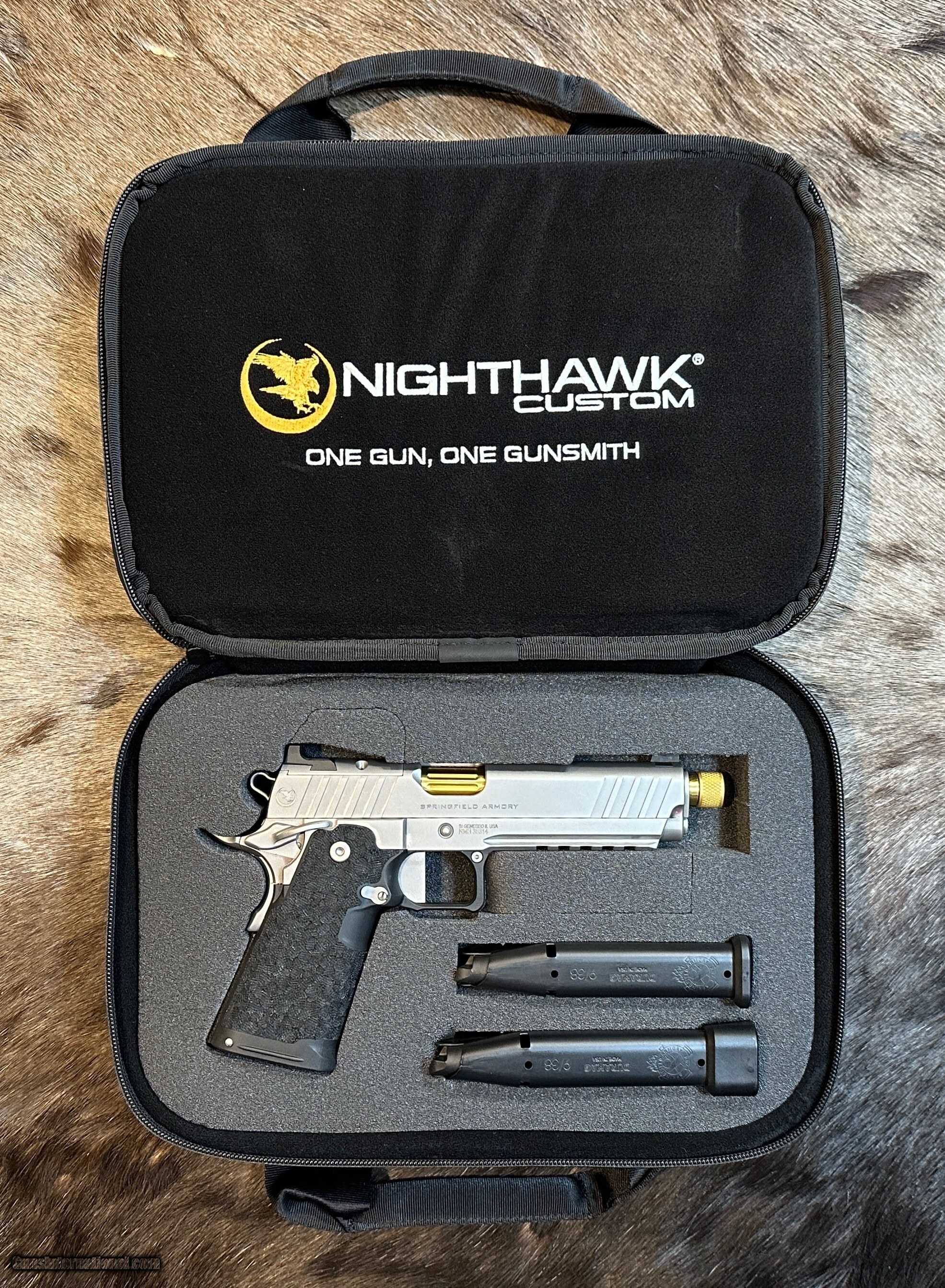 From the mind of John Browning, produced by Springfield Armory, and perfected by Nighthawk. From Nighthawk's Custom Shop comes a DOUBLE STACK 1911 PRODIGY AOS perfect for your carry needs. This pistol started life as a new Made-In-The-USA Springfield 1911 DS Prodigy AOS and has received just about every possible combat driven, performance-enhancing, and reliability upgrades from a master gunsmith in Nighthawk's Custom Shop. When you put all these features in one package, you come up with one of the finest carry double stack 1911 pistols you can own.