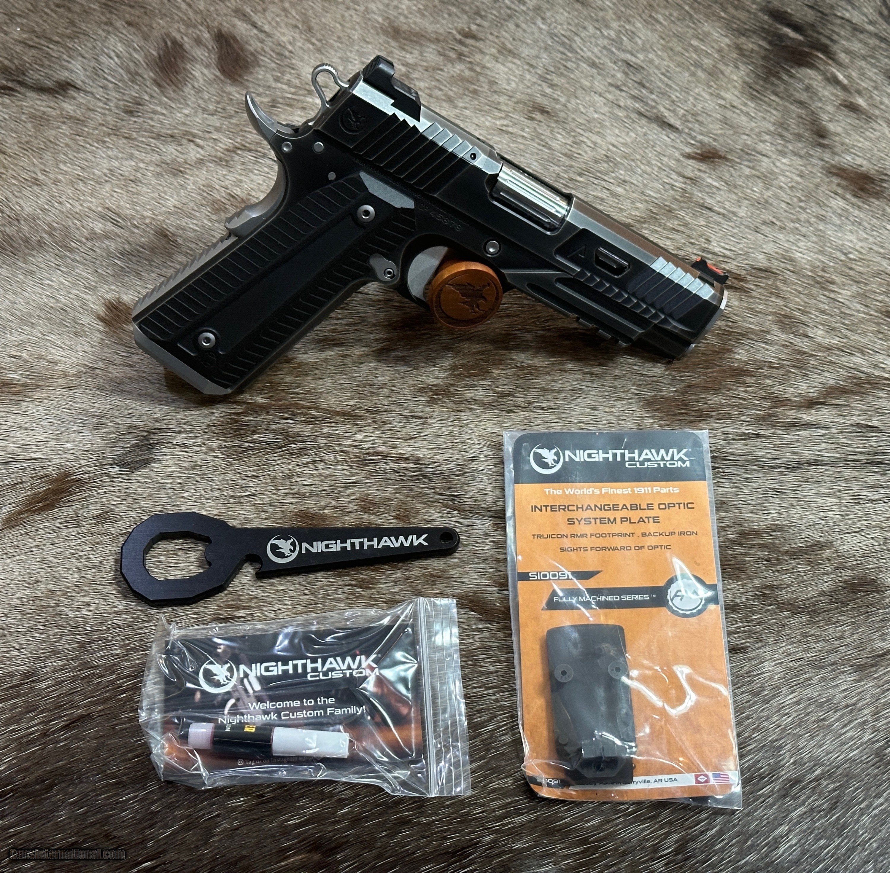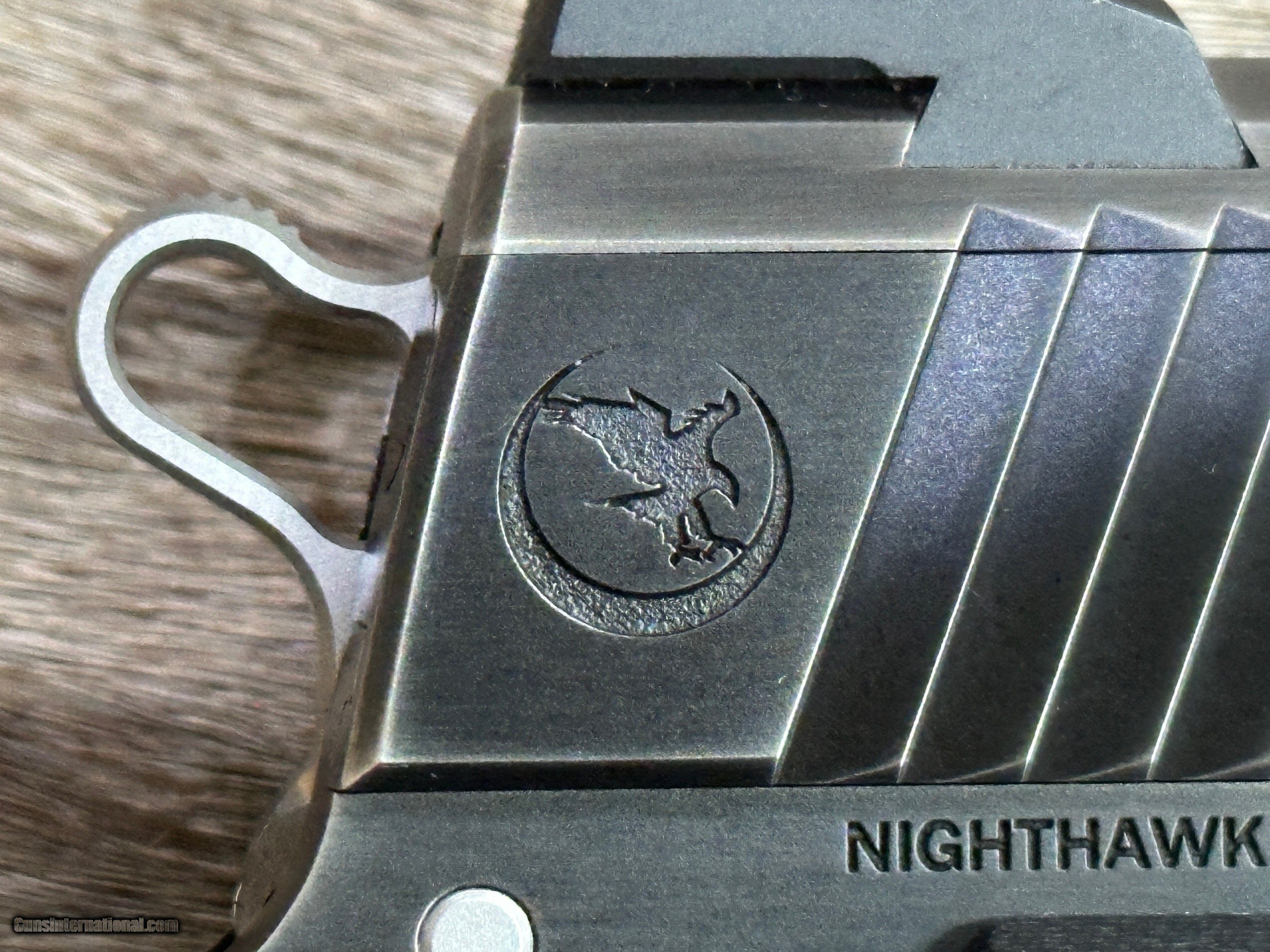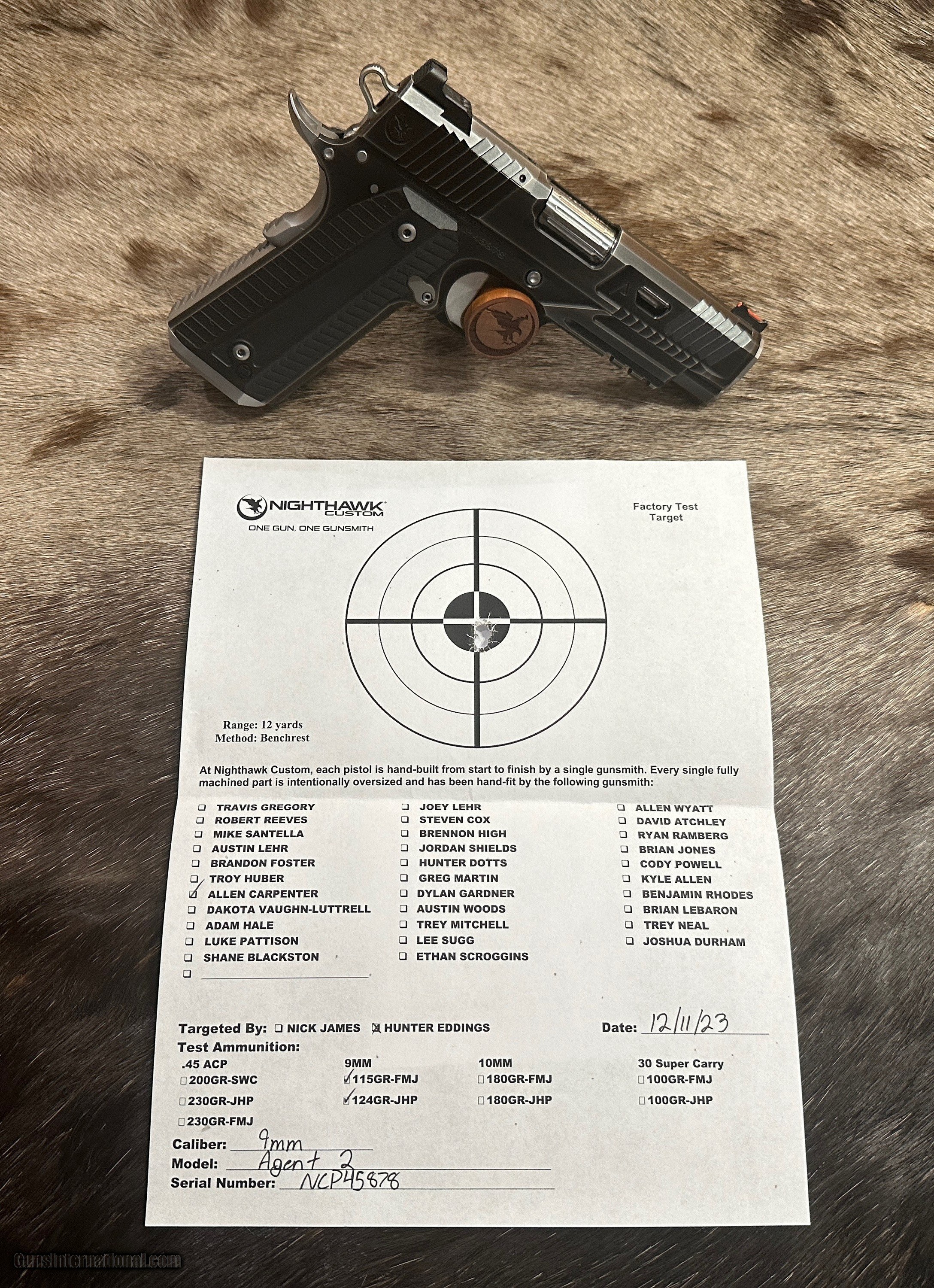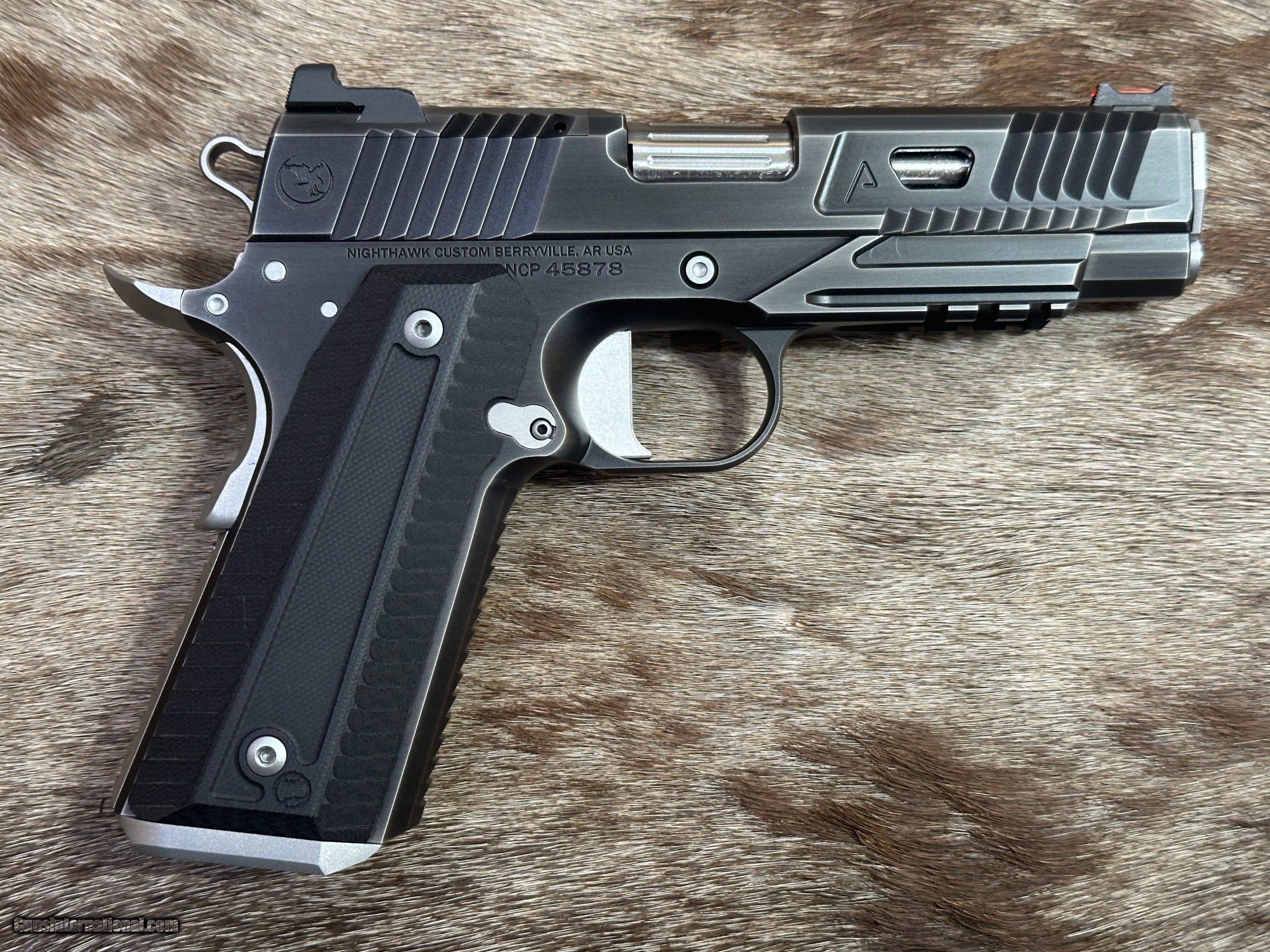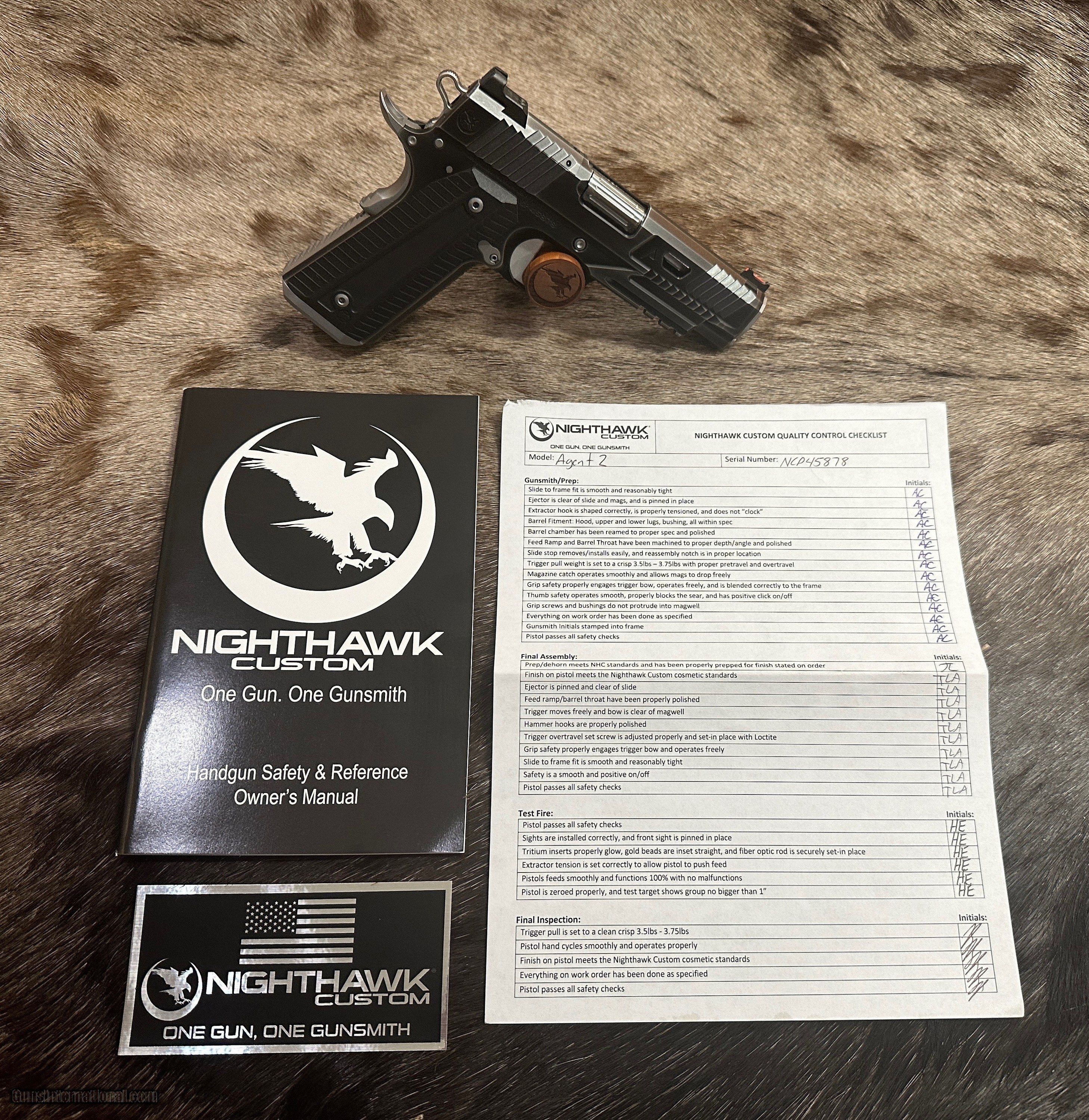 Description: NEW NIGHTHAWK CUSTOM AGENT 2 COMMANDER RECON 1911 9MM LUGER PISTOL WITH UPGRADES - LAYAWAY AVAILABLE Meticulously crafted and designed down to the last detail, the Nighthawk Custom Agent 2 is the next evolution of collaboration between Nighthawk Custom and Agency Arms. Utilizing the “One Gun, One Gunsmith” approach, Nighthawk Custom has taken the 1911 platform to an all-new level of innovation with the same hand-crafted quality and beauty. The Agent 2 was meticulously designed down to every detail to push the boundaries of the 1911 in both form and function. Combining gunsmith craftsmanship with modern machining techniques, the resulting pistol speaks for itself. As a truly unique and stunning firearm, the Agent 2 stands as the epitome of innovation. FEATURES OF THIS GREAT CUSTOM 1911 INCLUDE: