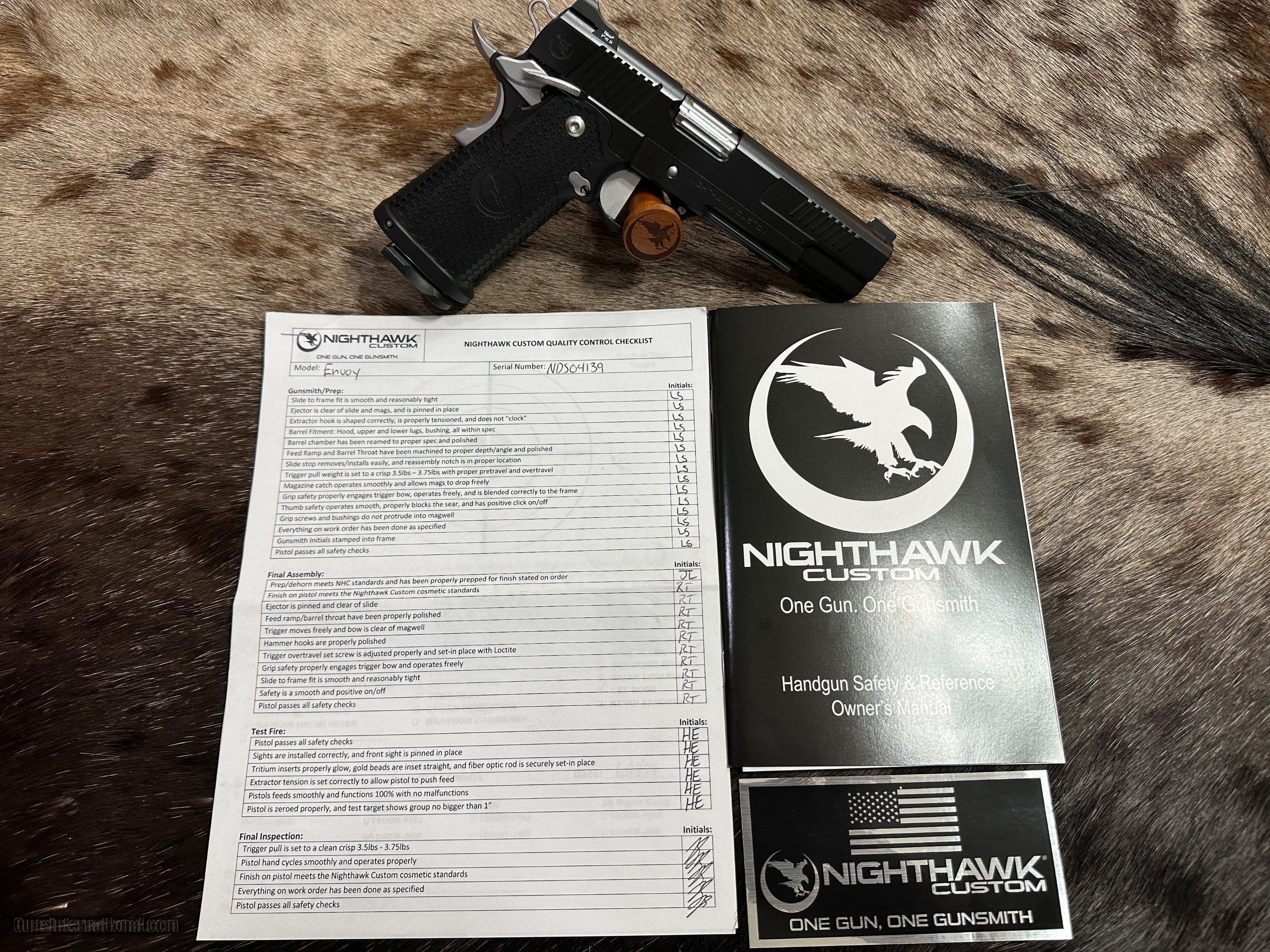 SOLD Handgun Caliber: 9x19mm Parabellum (9mm Luger, 9x19mm NATO) Manufacturer: Nighthawk Custom Model: Envoy Gov't Double Stack with Upgrades Serial Number: NDS04139 Barrel Length: 5 Condition: New |