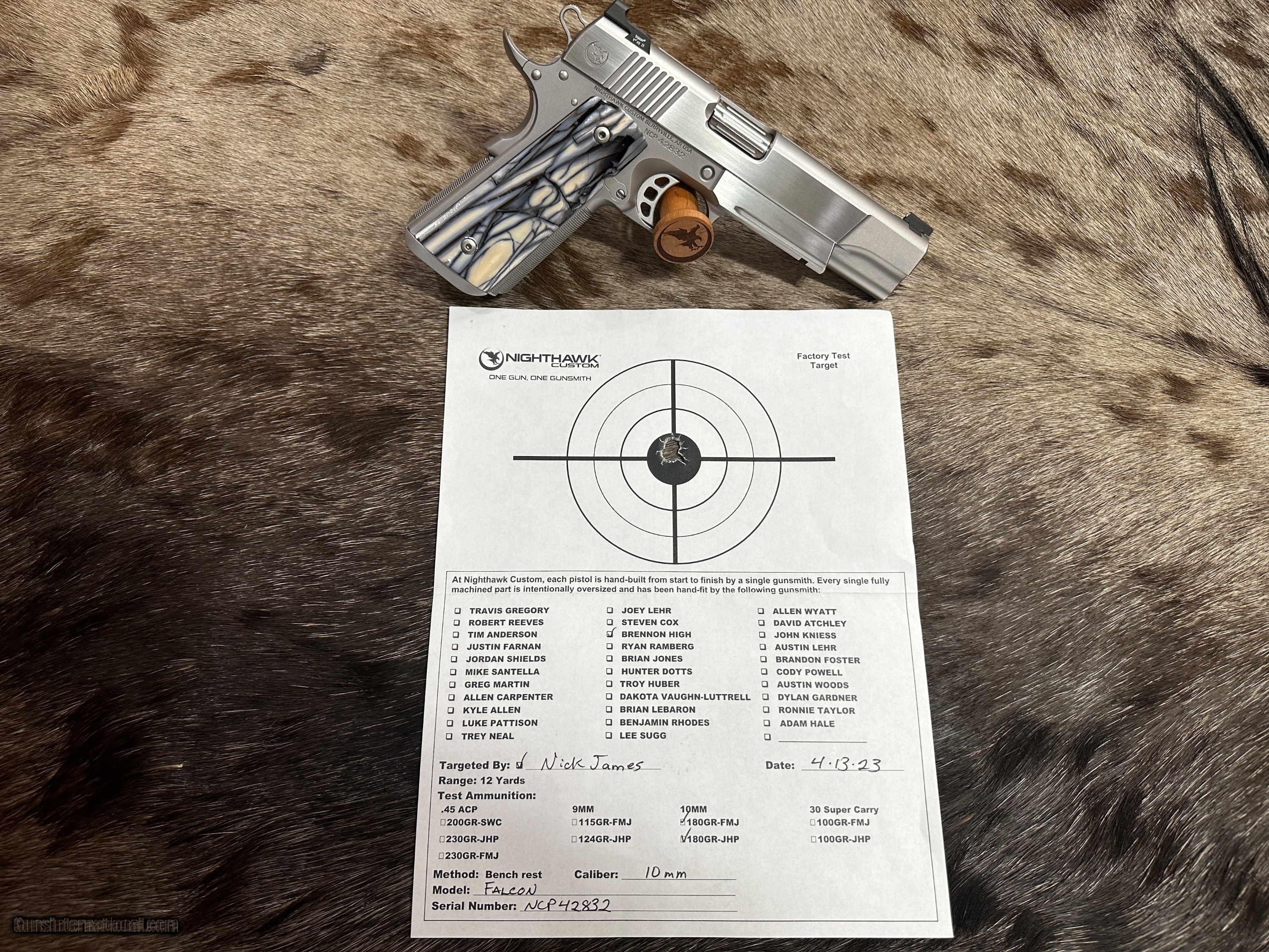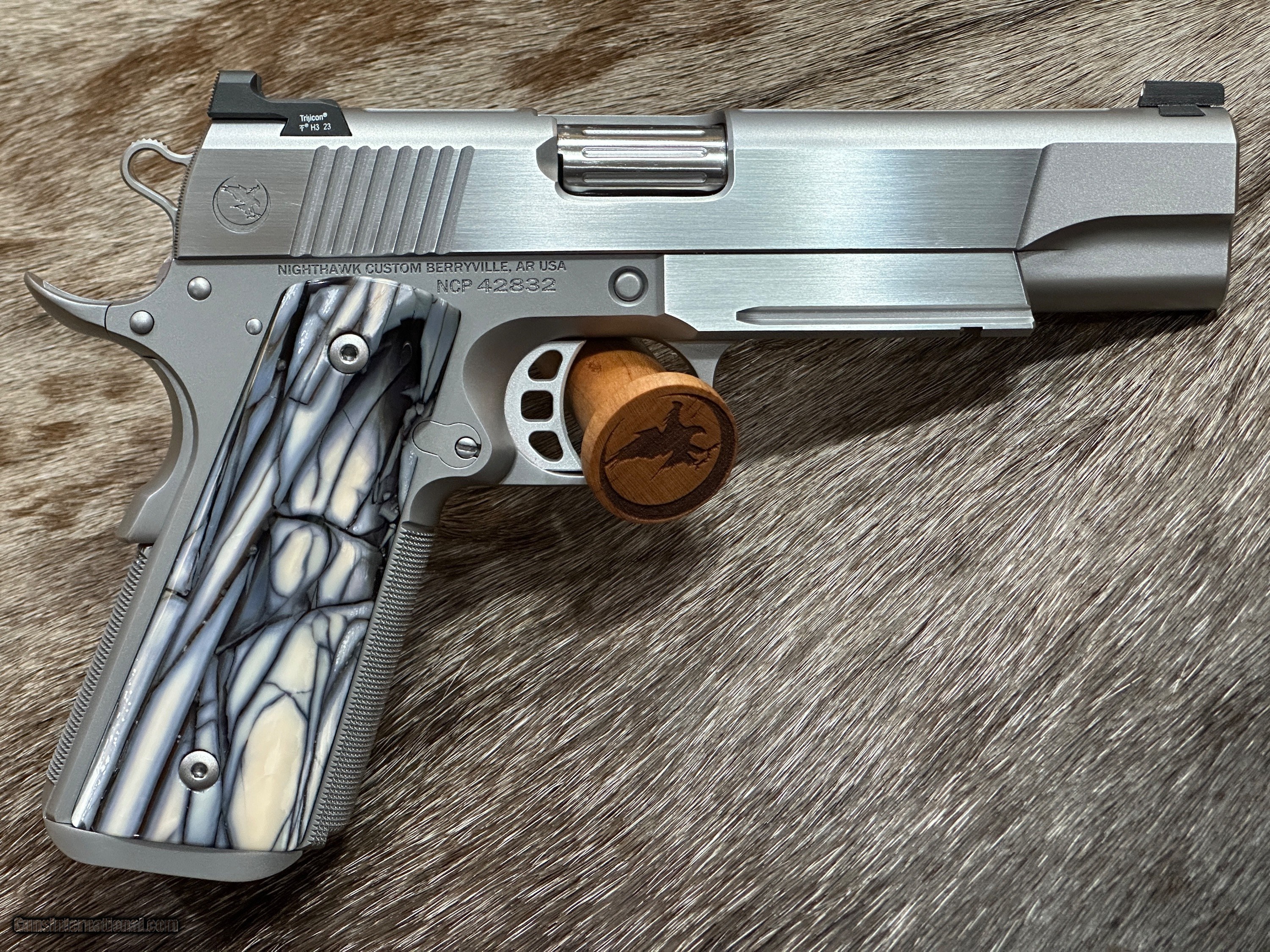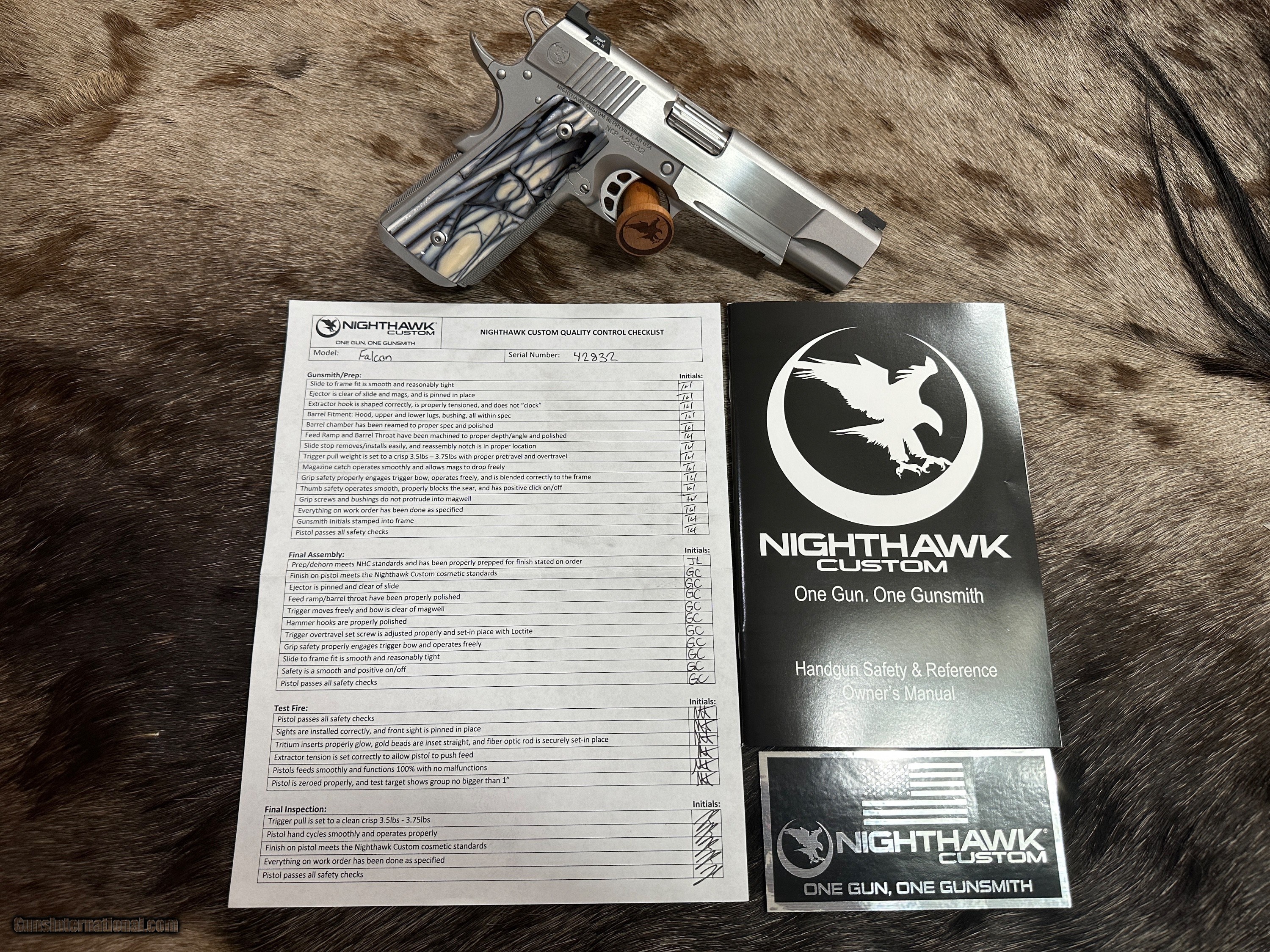 Description: NEW NIGHTHAWK CUSTOM FALCON GOVERNMENT 1911 10MM PISTOL WITH MAMMOTH IVORY GRIPS, MATCHING DAMASTEEL KNIFE AND MANY OTHER UPGRADES - LAYAWAY AVAILABLE The Falcon has sleek lines and all the right features. This unique custom pistol is easily identified by Hi-Power style cuts on the front of the slide and ball cuts for rear and top of the slide serrations. The Falcon is completed with a hand-crowned barrel and the loved Falcon one-piece magwell/MSH. FEATURES OF THIS GREAT CUSTOM 1911 INCLUDE: