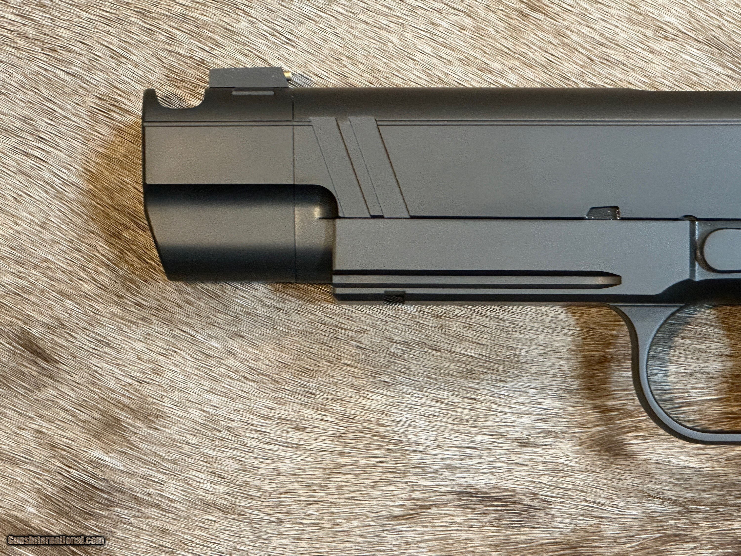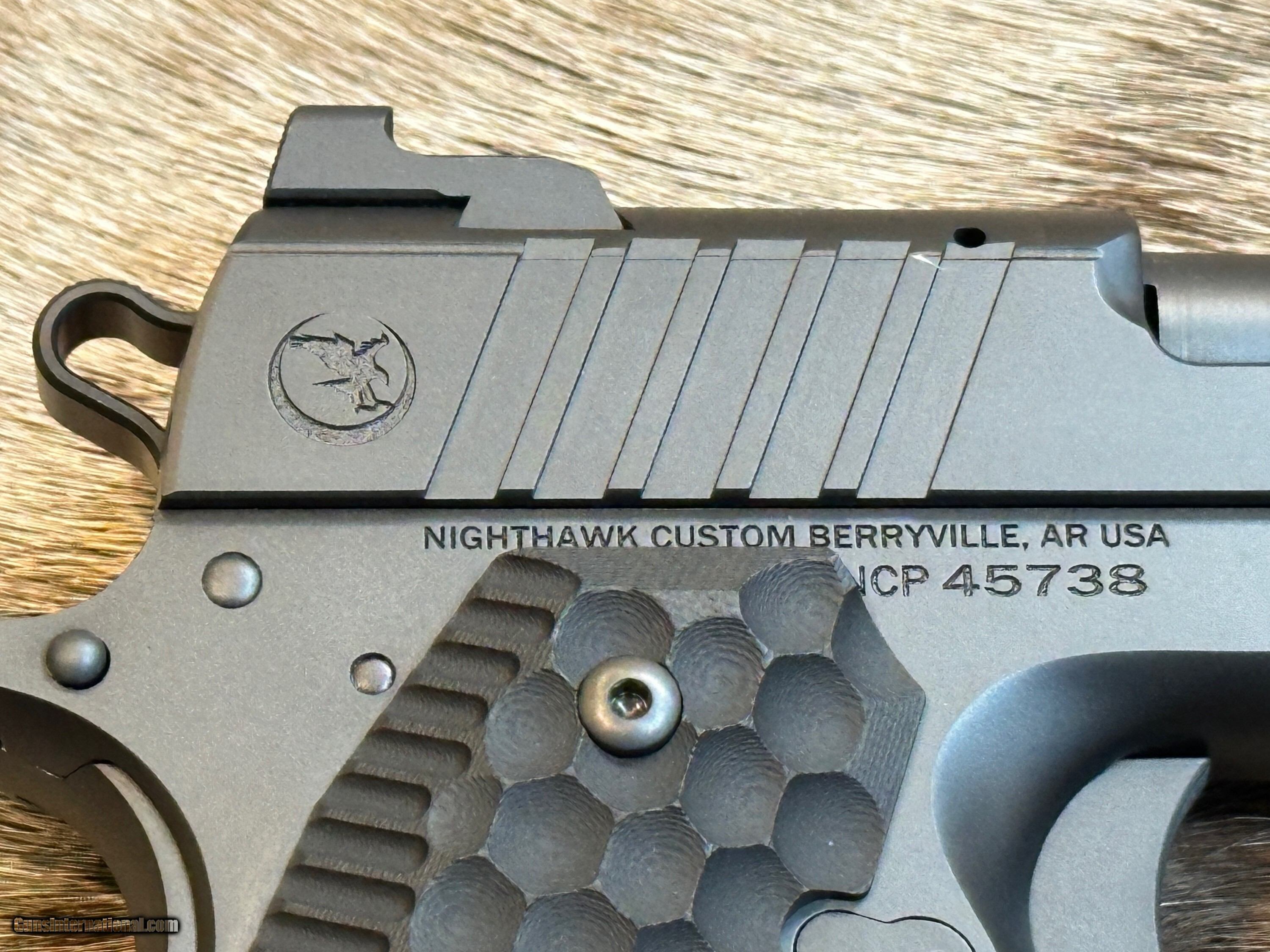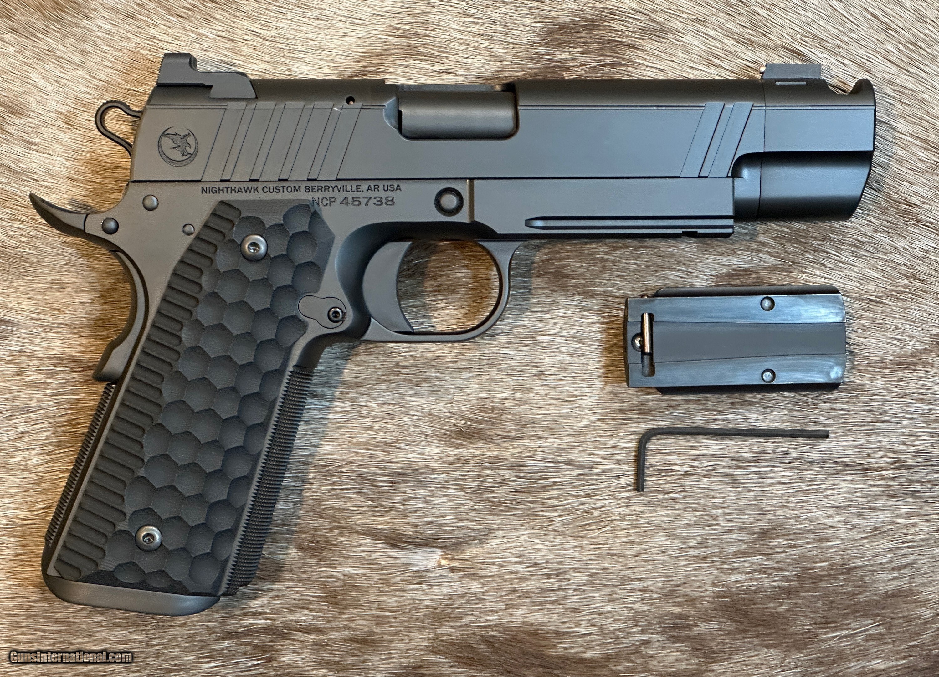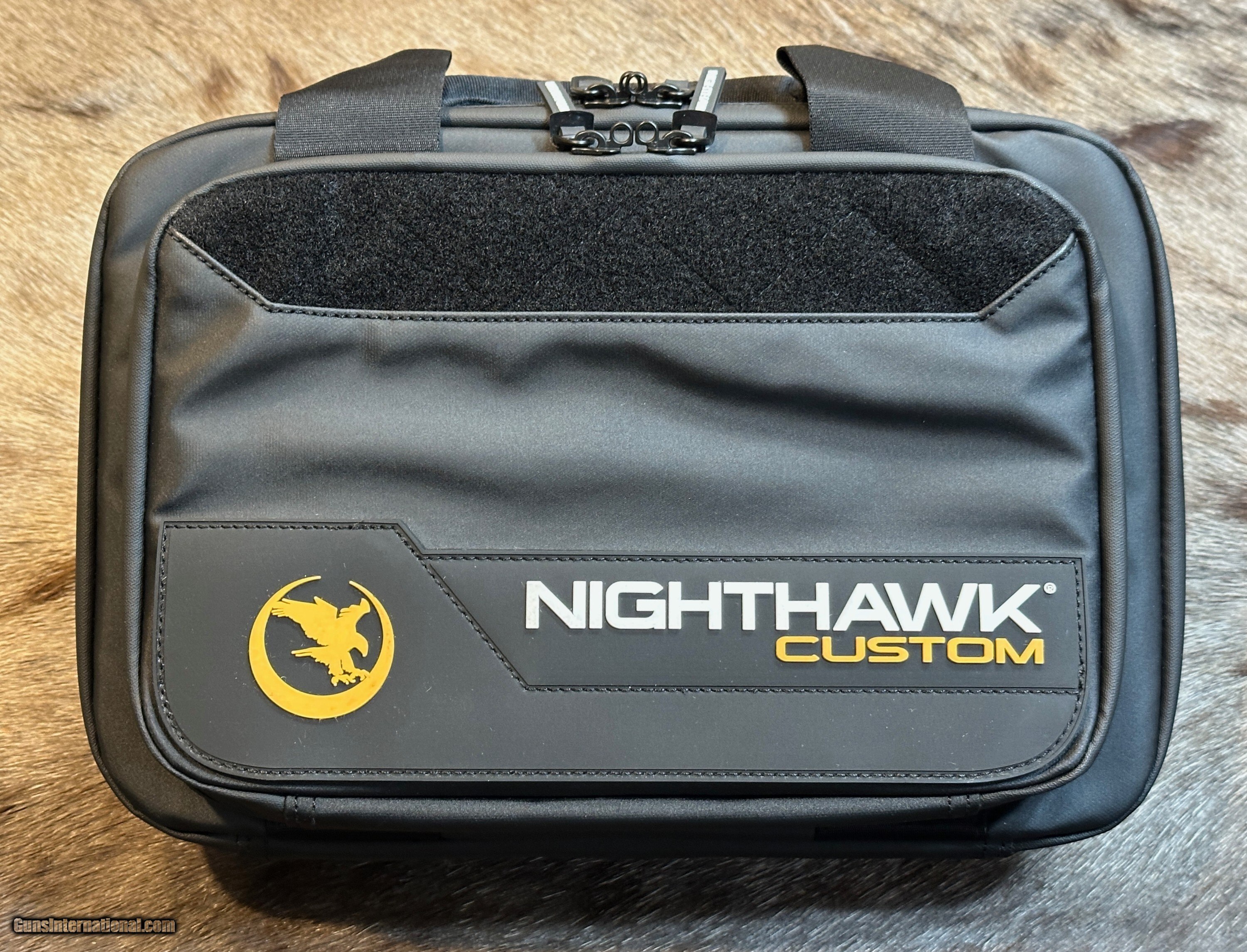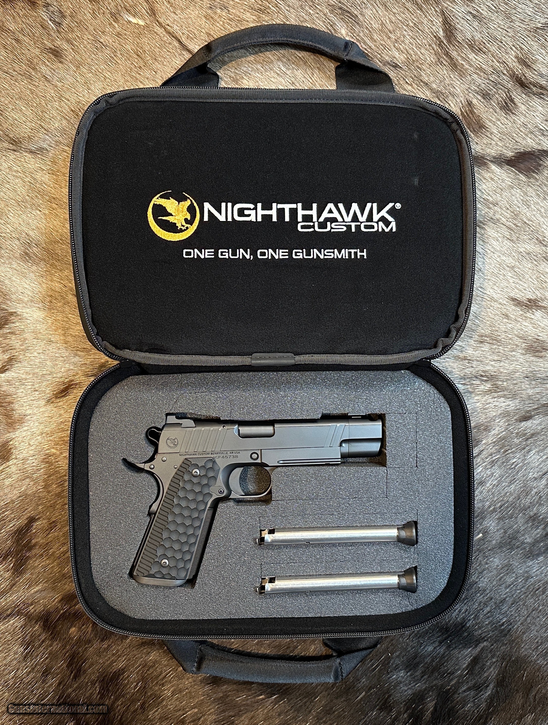 Description: NEW NIGHTHAWK CUSTOM FIRE HAWK GOV'T 1911 9MM PISTOL W/ IOS AND OTHER UPGRADES - LAYAWAY AVAILABLE The Nighthawk Custom Fire Hawk represents a cutting-edge advancement in the brand's lineage of purpose-built innovation, incorporating state-of-the-art features designed to enhance performance and shooting experience. Central to the Fire Hawk's design is the meticulously crafted single-port compensator, which effectively tames recoil and reduces muzzle rise. This technology leads to a smoother, flatter shooting experience, improving control and accuracy without increasing the overall size of the pistol. The Fire Hawk is equipped with a bull barrel and a full-length guide rod, ensuring reliable performance and precise function. It employs a commander length spring and reverse plug, which maintain the standard stroke of a 5-inch 1911, contributing to the pistol's reliability and ease of use. The lightened slide minimizes reciprocating mass, providing shooters with fast target reacquisition and more manageable recoil. A French border unifies the slide and compensator, creating a seamless, elegant appearance. The one-piece magwell allows for swift, efficient reloads, crucial in high-stress or competitive scenarios. The compensator features a bull-nose cut, promoting a smoother draw and re-holstering process while still retaining an aggressive, distinctive look. The Fire Hawk balances traditional 1911 styling with modern performance enhancements, delivering a pistol that is as visually appealing as it is functional. It captures the essence of Nighthawk Custom's commitment to quality and innovation, offering shooters a firearm that combines classic aesthetics with cutting-edge technology. Whether for competition or defense, the Nighthawk Custom Fire Hawk provides a superior shooting experience that is sure to impress. FEATURES OF THIS GREAT CUSTOM 1911 INCLUDE: