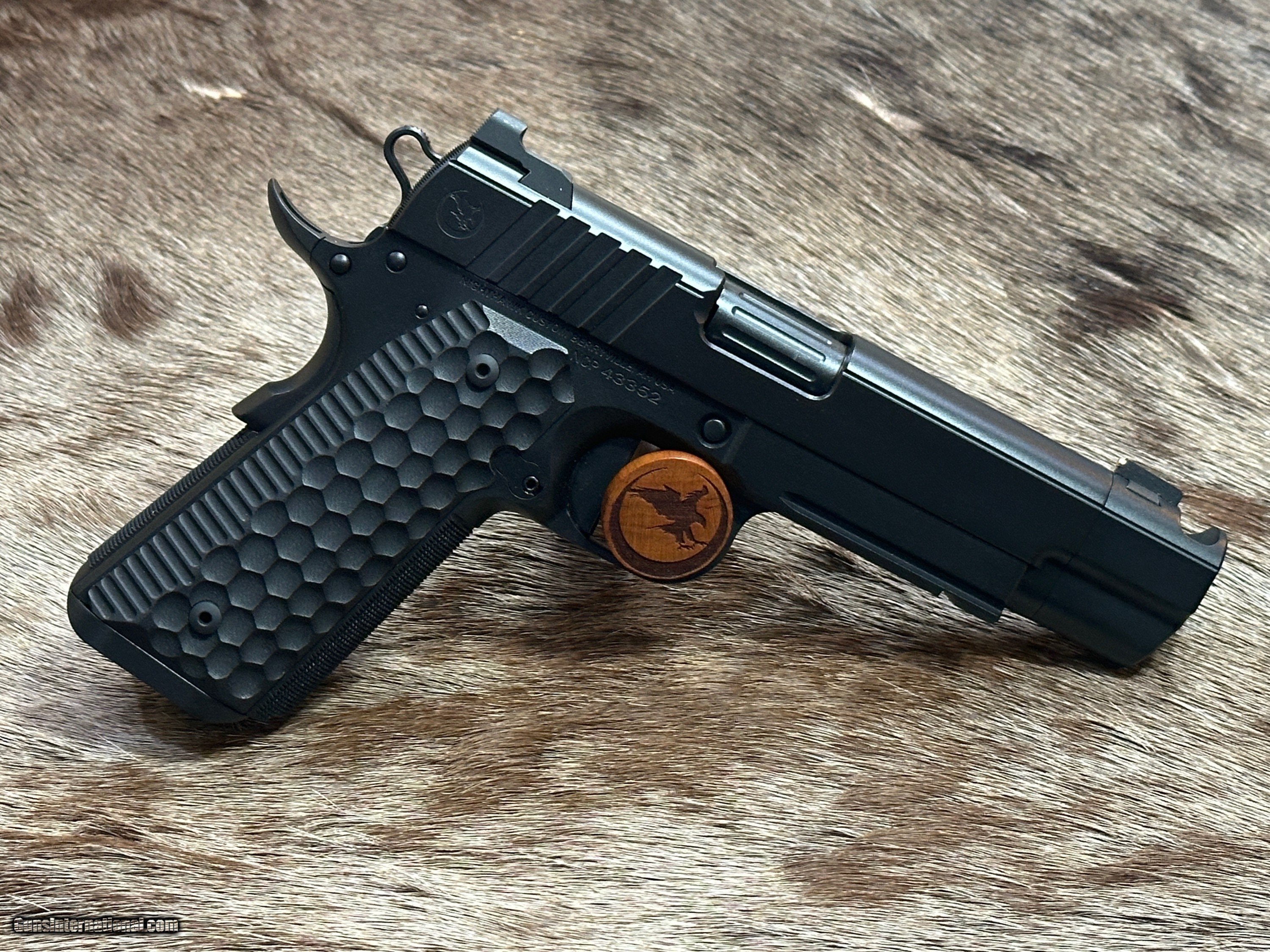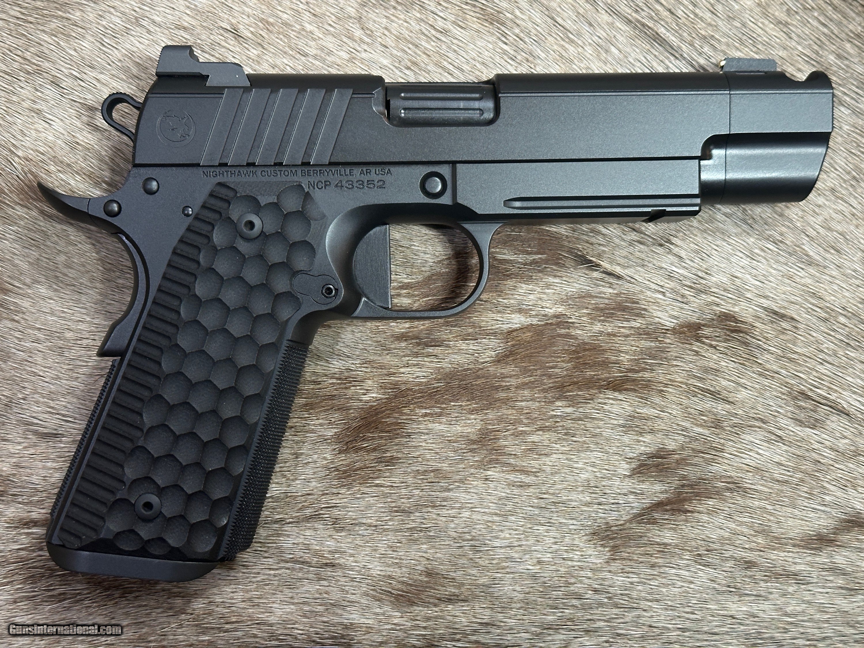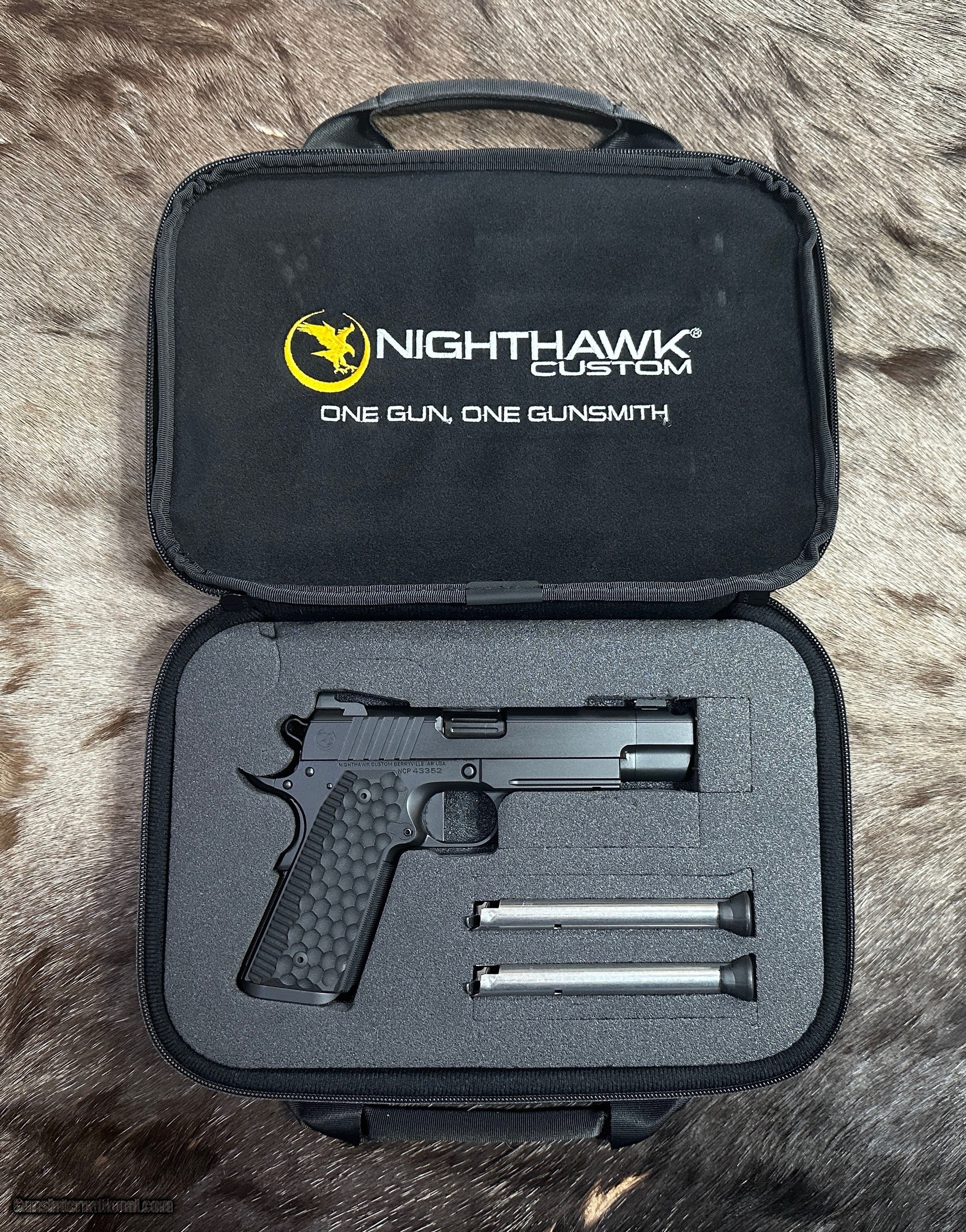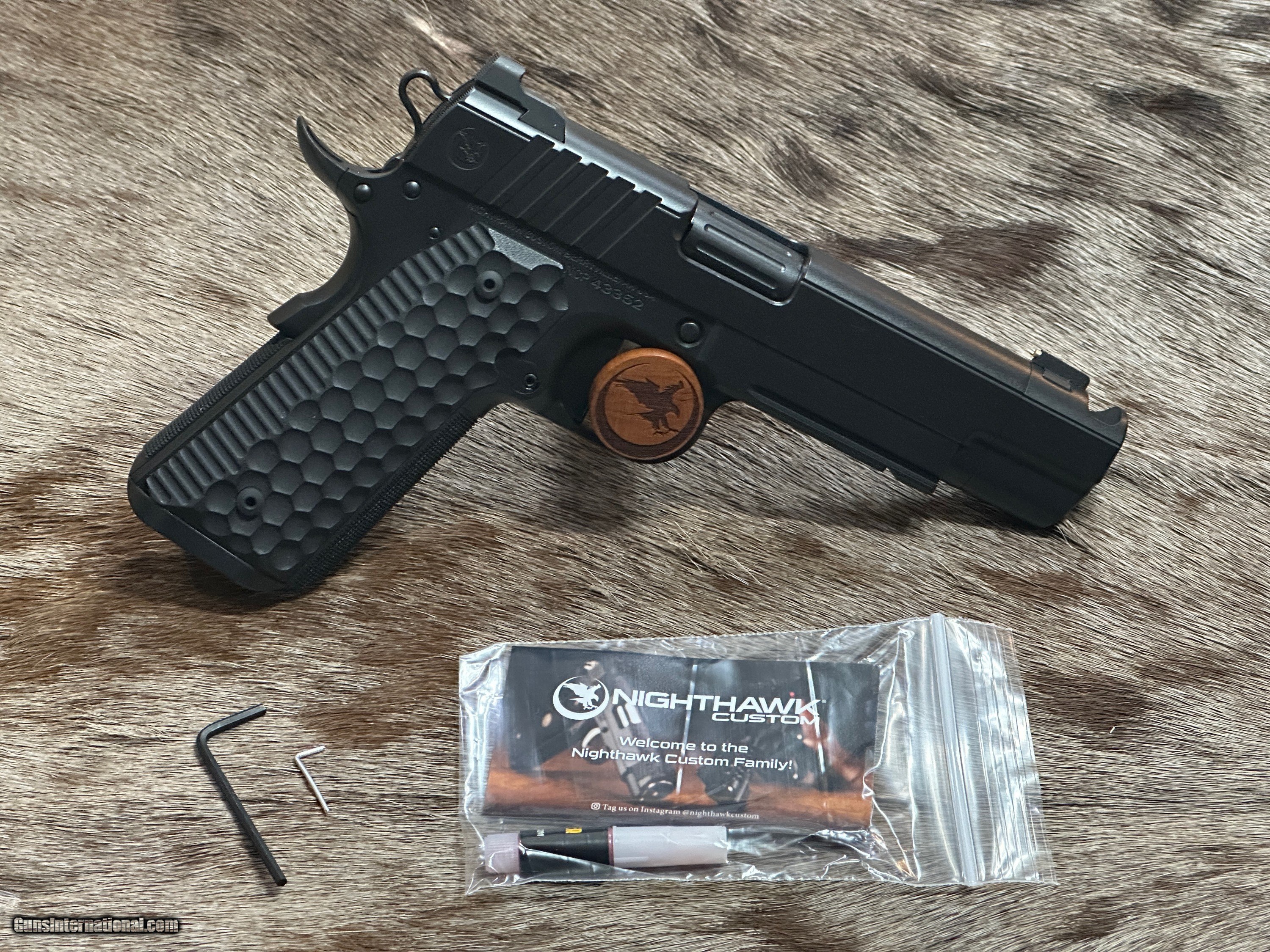 Description: NEW NIGHTHAWK CUSTOM FIRE HAWK GOVERNMENT 1911 9mm PISTOL WITH MANY UPGRADES - LAYAWAY AVAILABLE This cutting edge offering from Nighthawk Custom is the next advancement in a long line of purpose-built innovation. By utilizing the meticulously designed single-port compensator, recoil is tamed and muzzle rise is reduced. The Fire Hawk features a bull barrel and full-length guide rod. Using a commander length spring and reverse plug, Nighthawk Custom has maintained the standard stroke of a 5-inch 1911 for reliability. The lightened slide reduces reciprocating mass and delivers flat shooting performance without increasing the size of the pistol. A French border ties together both the slide and the compensator for a seamless look, while the one-piece magwell allows for smoother reloads. The compensator is bull nosed to allow for a cleaner draw and re-holster while still maintaining an edgy, aggressive look. The traditionally styled Fire Hawk boasts an upper hand in performance, all while delivering the classic look that you have come to know and expect from Nighthawk Custom. FEATURES OF THIS GREAT CUSTOM 1911 INCLUDE: