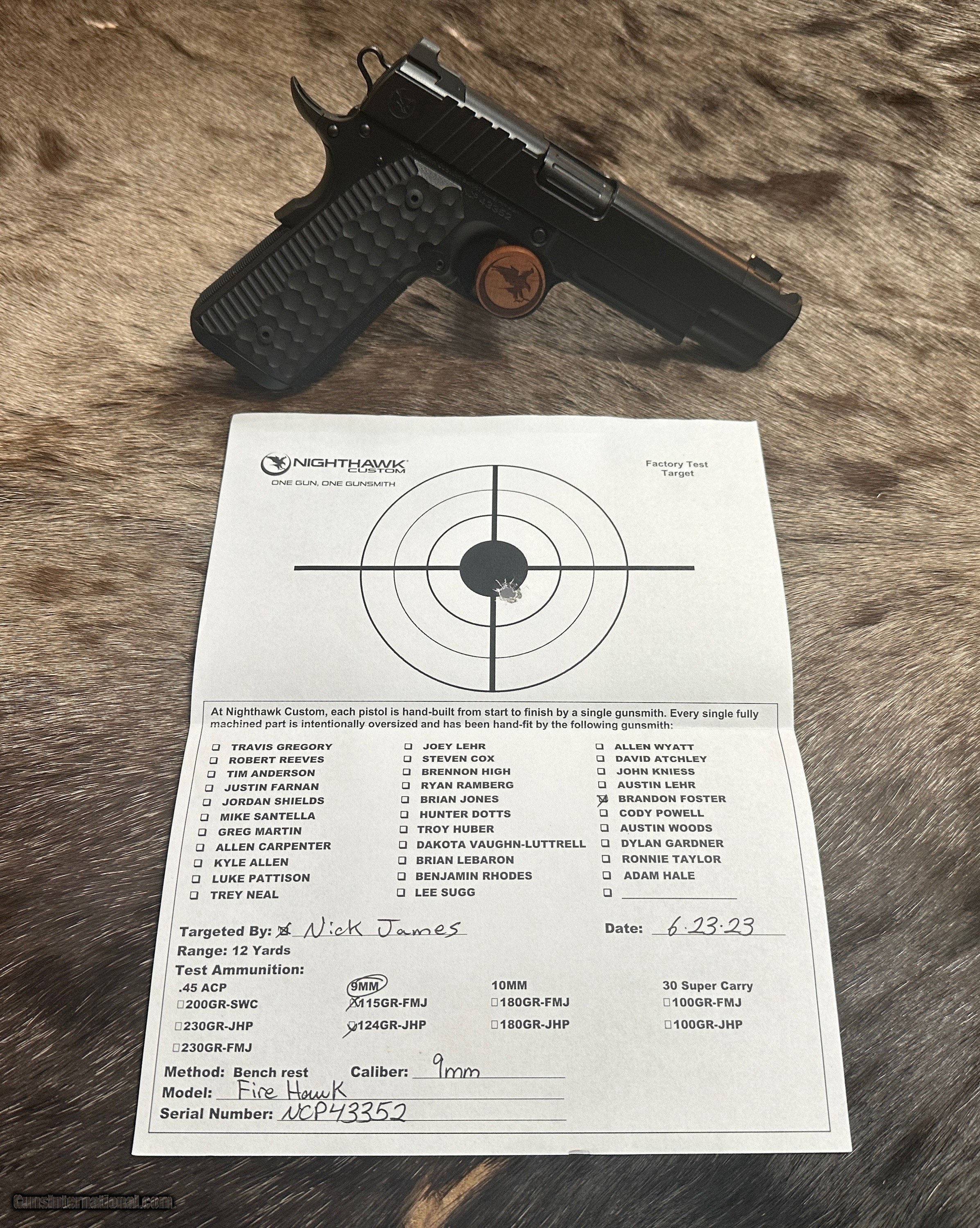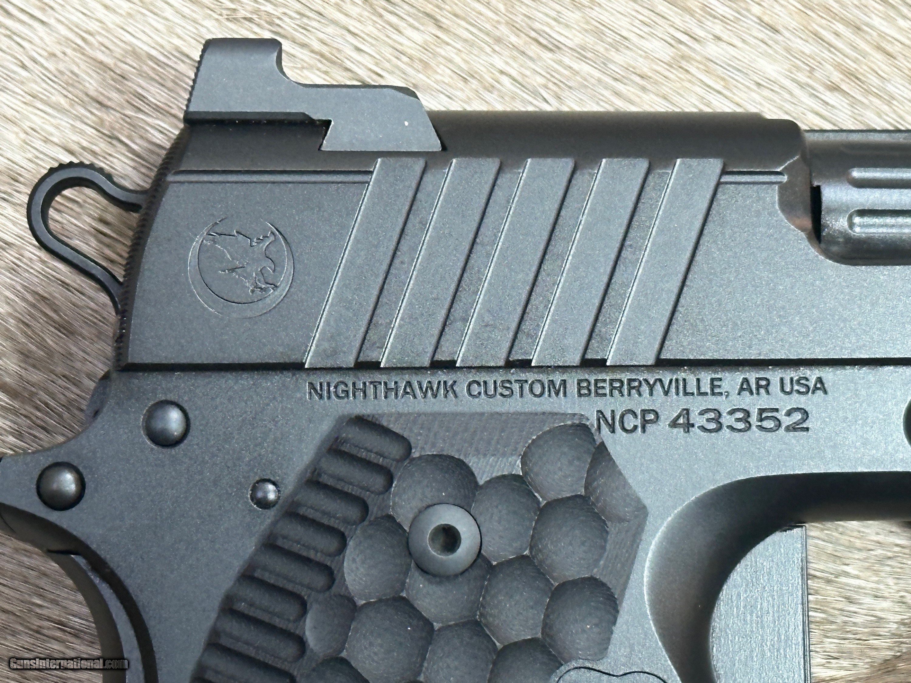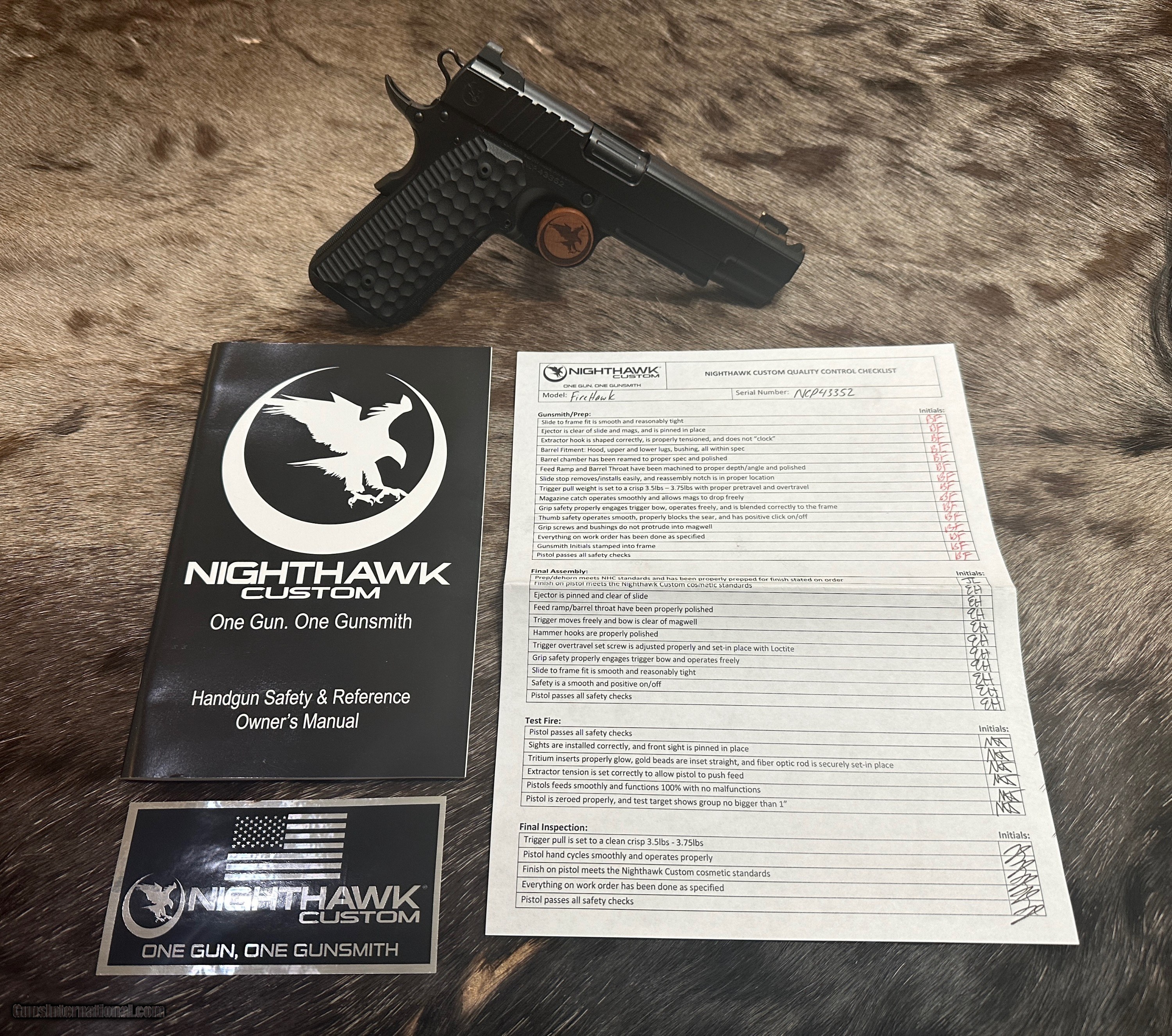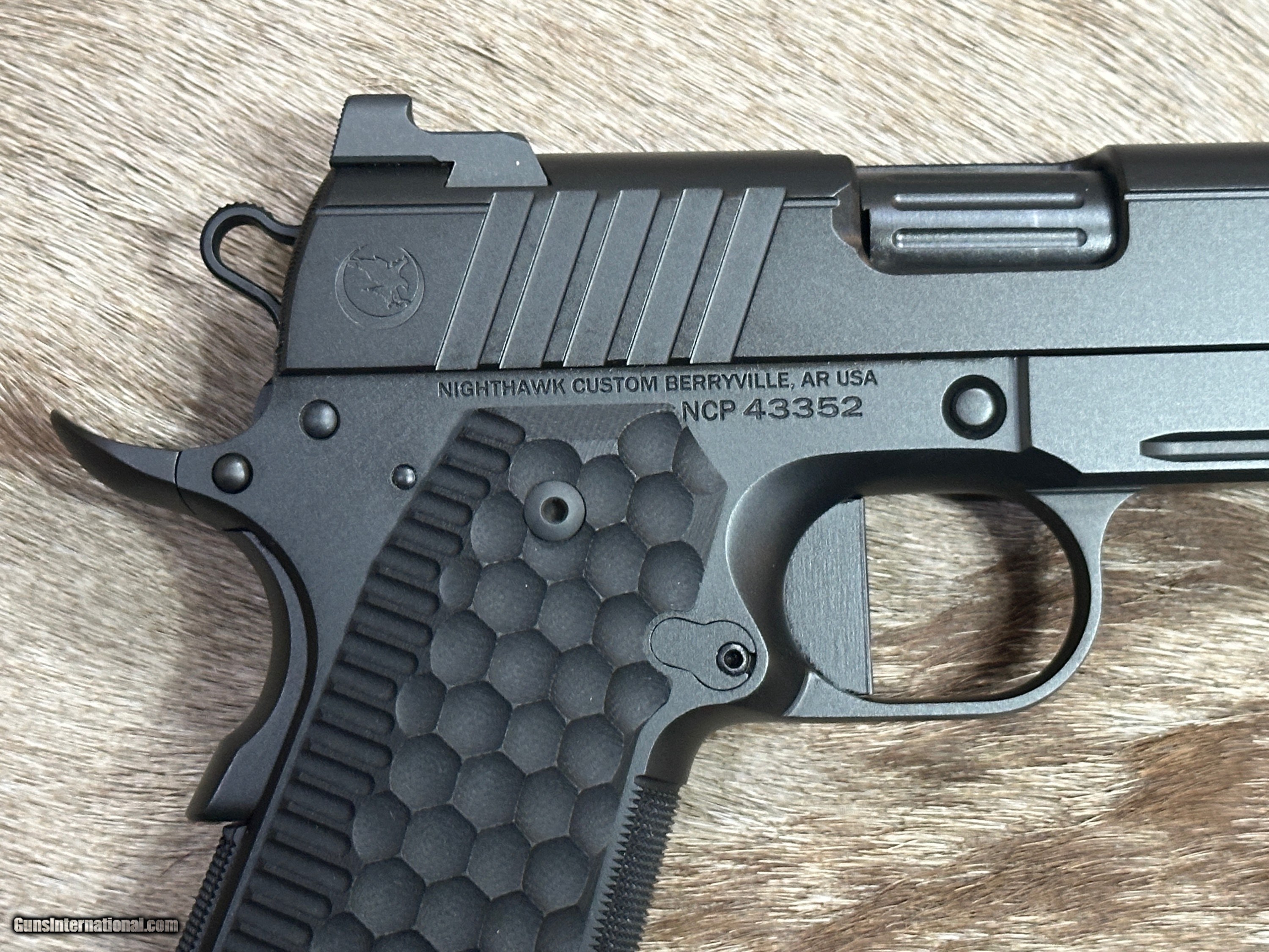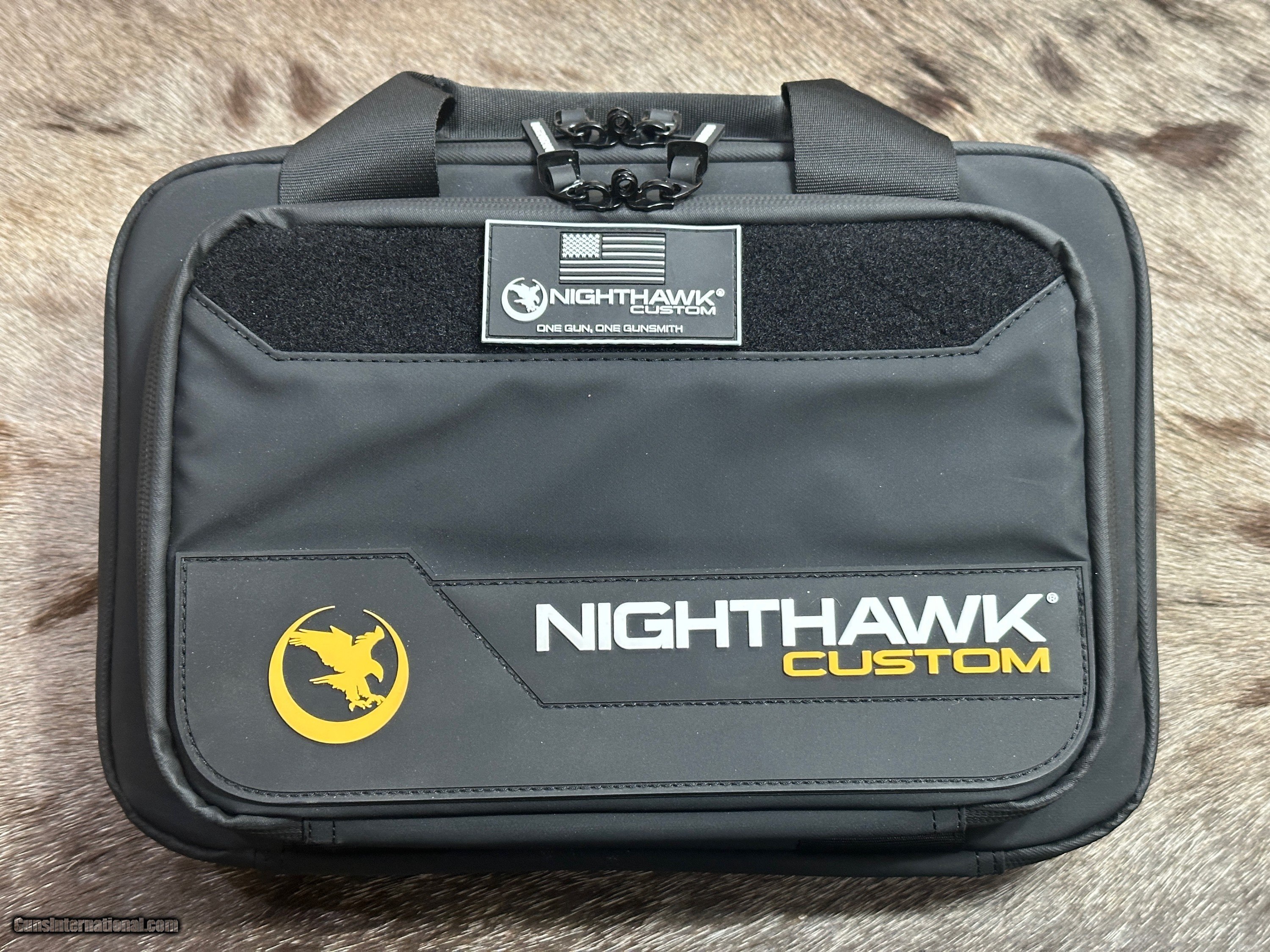 Description: NEW NIGHTHAWK CUSTOM FIRE HAWK GOVERNMENT 1911 9mm PISTOL WITH MANY UPGRADES - LAYAWAY AVAILABLE This cutting edge offering from Nighthawk Custom is the next advancement in a long line of purpose-built innovation. By utilizing the meticulously designed single-port compensator, recoil is tamed and muzzle rise is reduced. The Fire Hawk features a bull barrel and full-length guide rod. Using a commander length spring and reverse plug, Nighthawk Custom has maintained the standard stroke of a 5-inch 1911 for reliability. The lightened slide reduces reciprocating mass and delivers flat shooting performance without increasing the size of the pistol. A French border ties together both the slide and the compensator for a seamless look, while the one-piece magwell allows for smoother reloads. The compensator is bull nosed to allow for a cleaner draw and re-holster while still maintaining an edgy, aggressive look. The traditionally styled Fire Hawk boasts an upper hand in performance, all while delivering the classic look that you have come to know and expect from Nighthawk Custom. FEATURES OF THIS GREAT CUSTOM 1911 INCLUDE: