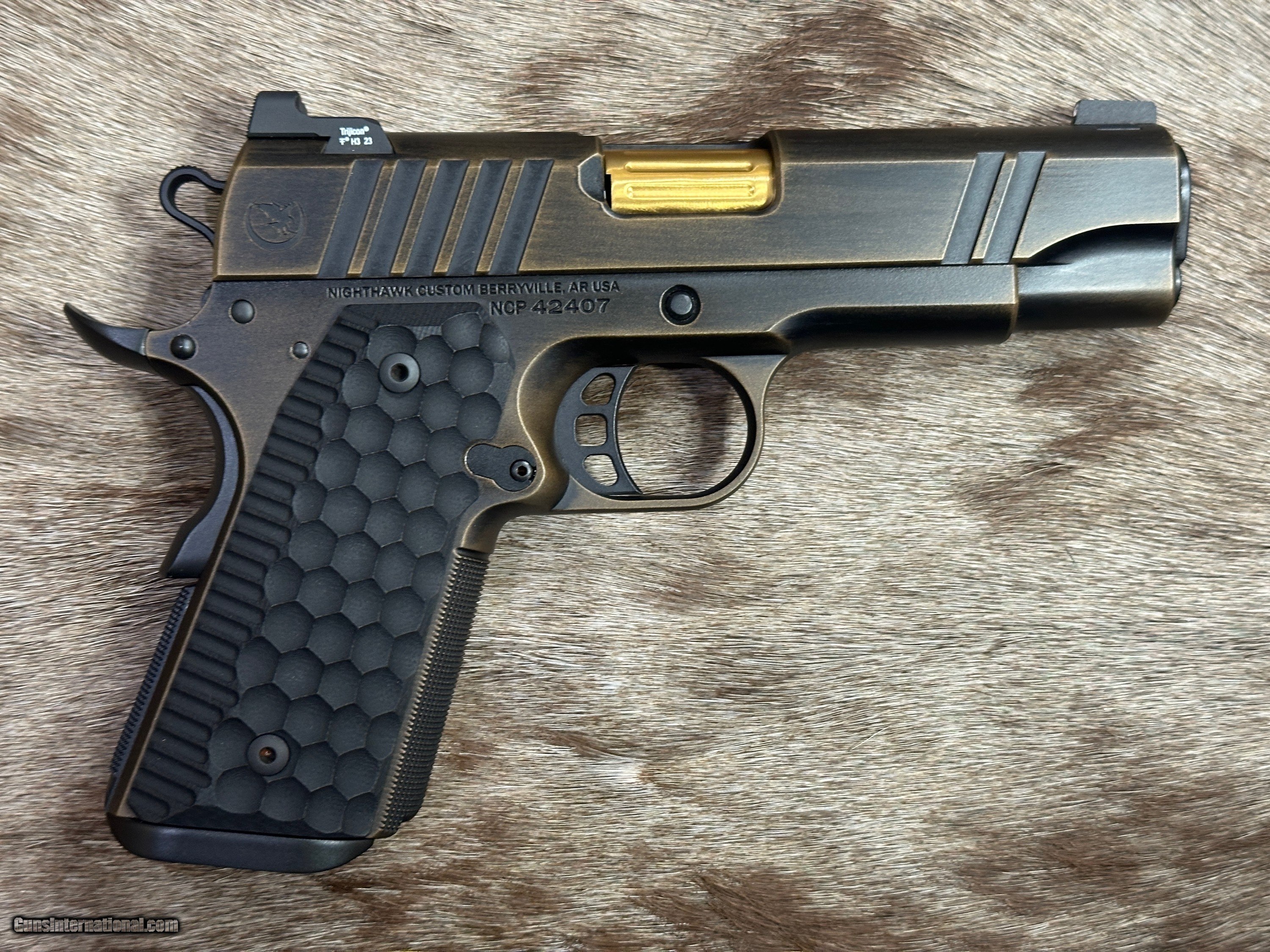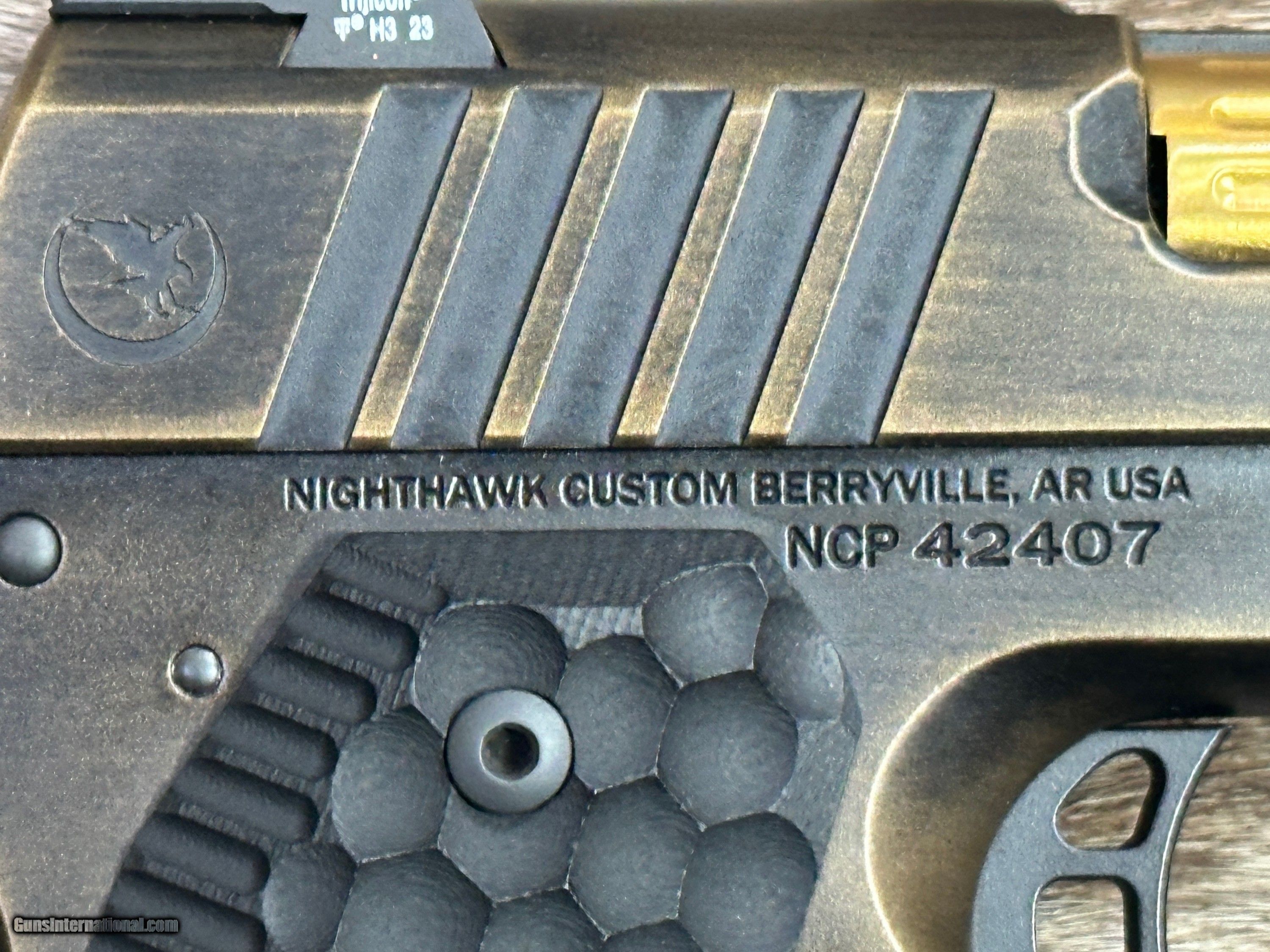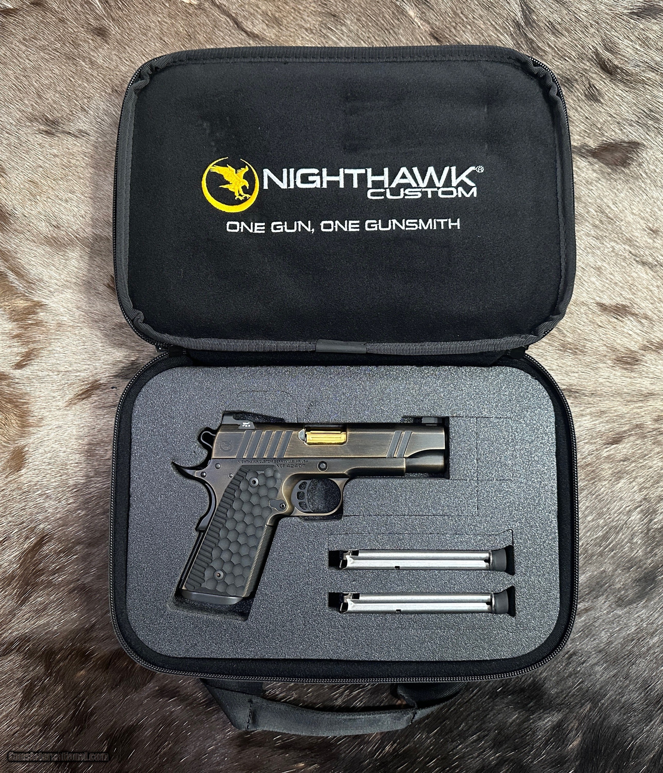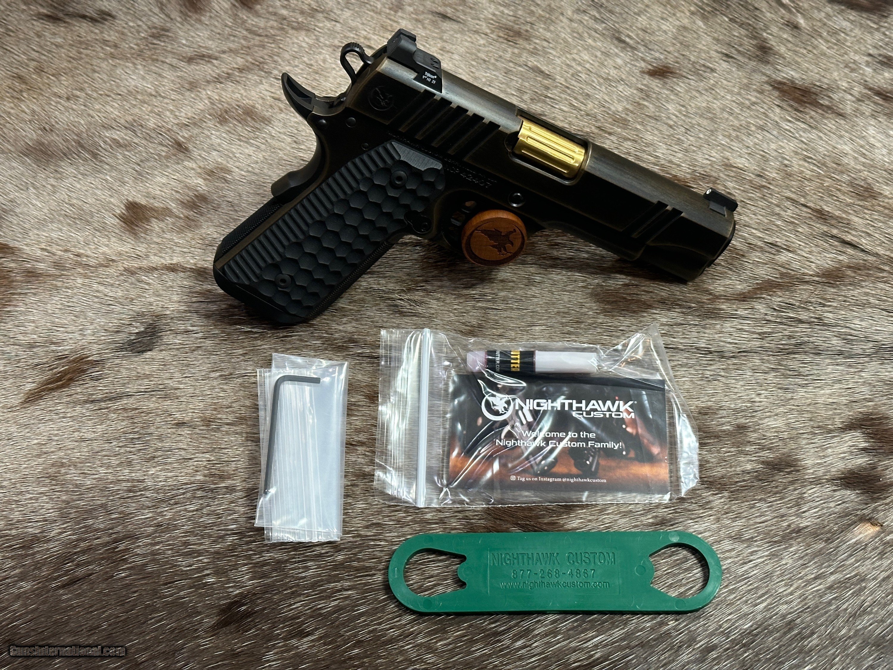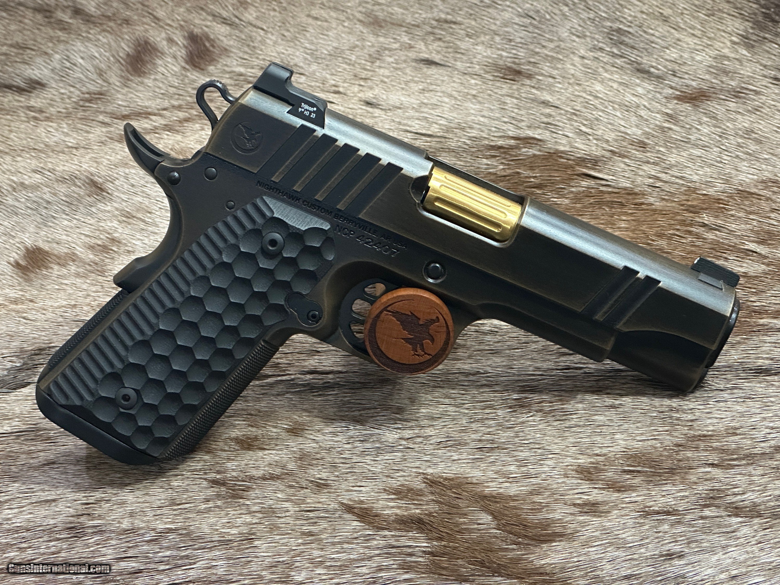 Description: NEW NIGHTHAWK CUSTOM GRP OFFICER 1911 9MM PISTOL WITH MANY UPGRADES - LAYAWAY AVAILABLE The GRP, just like every Nighthawk Custom pistol, has each part hand fit by a single gunsmith. The GRP utilizes coarse cocking serrations on the front and rear of the slide. It includes Heinie Ledge Straight Eight tritium rear sight paired with a tritium front sight. The GRP uses all the same fully machined parts and craftsmanship that go into our entire Nighthawk Custom lineup. This model, along with all others, follows the “One Gun, One Gunsmith” philosophy which means the gun is built by a single gunsmith. We have no assembly line. We have a group of master gunsmiths that start with a box of intentionally oversized parts and build them into the world’s finest 1911. FEATURES OF THIS GREAT CUSTOM 1911 INCLUDE: