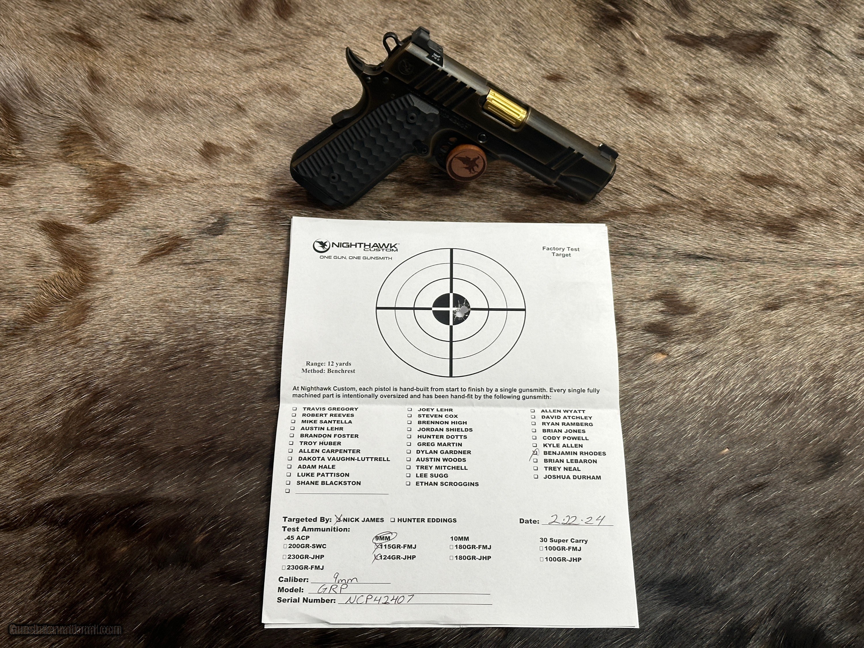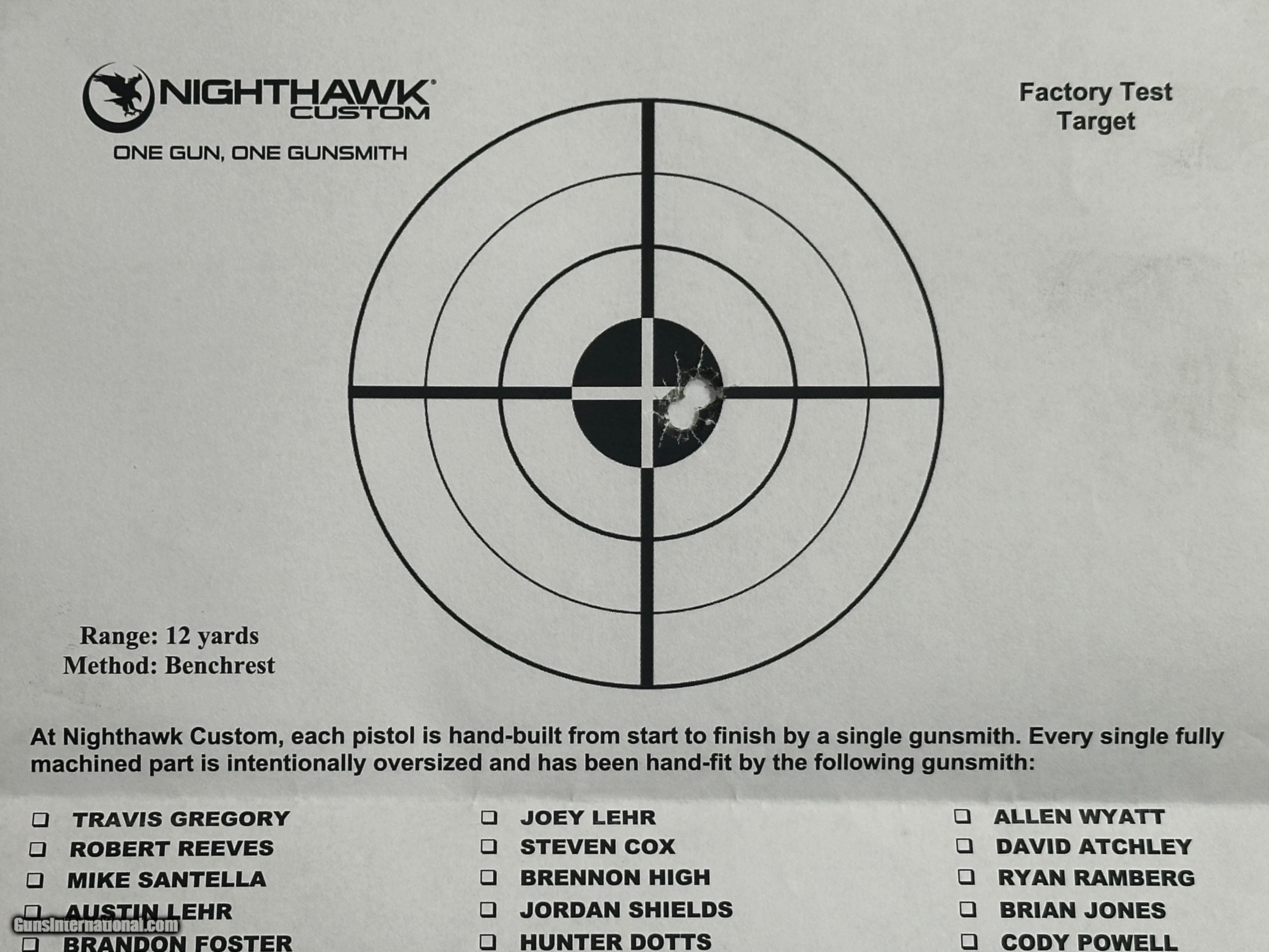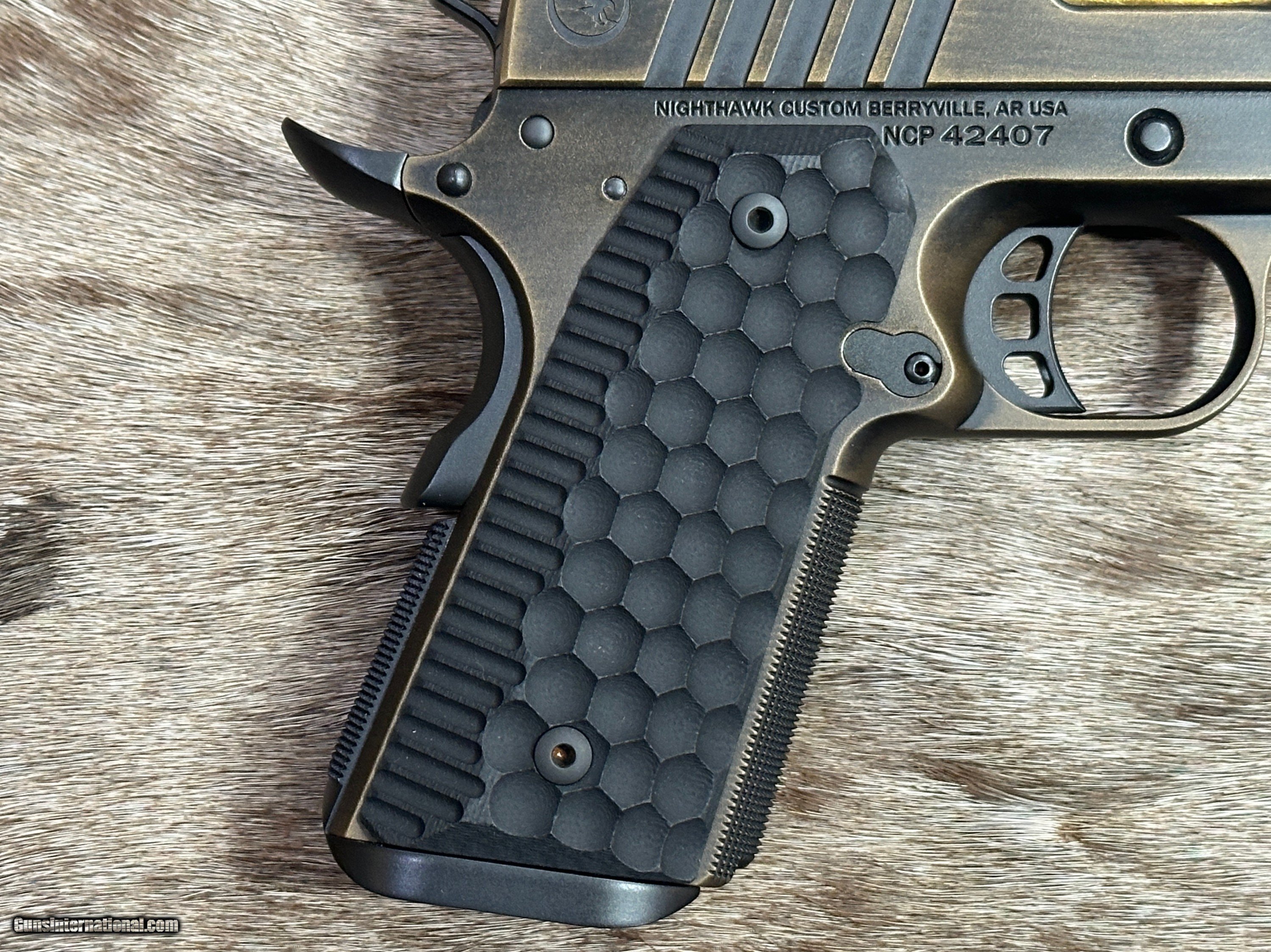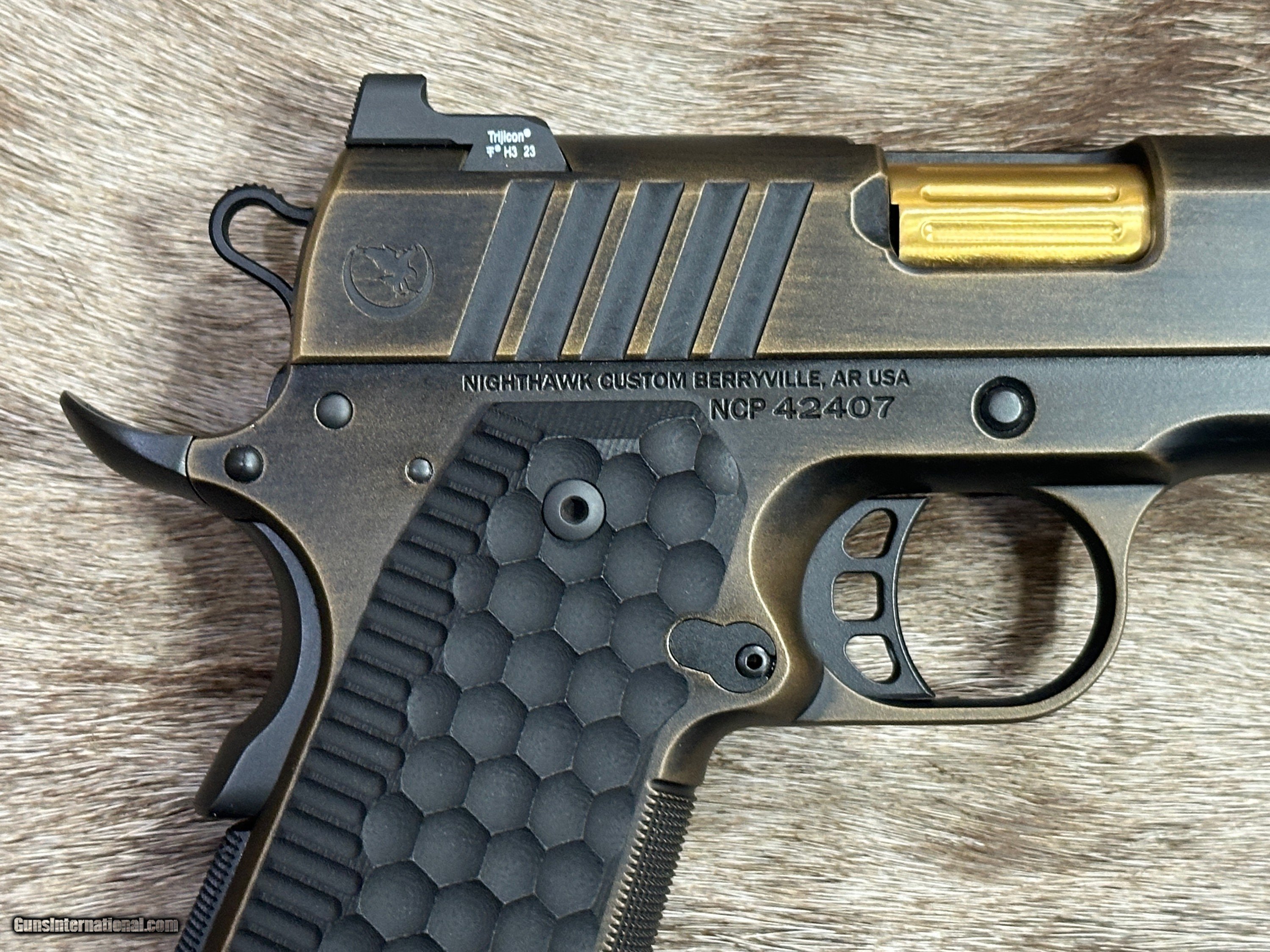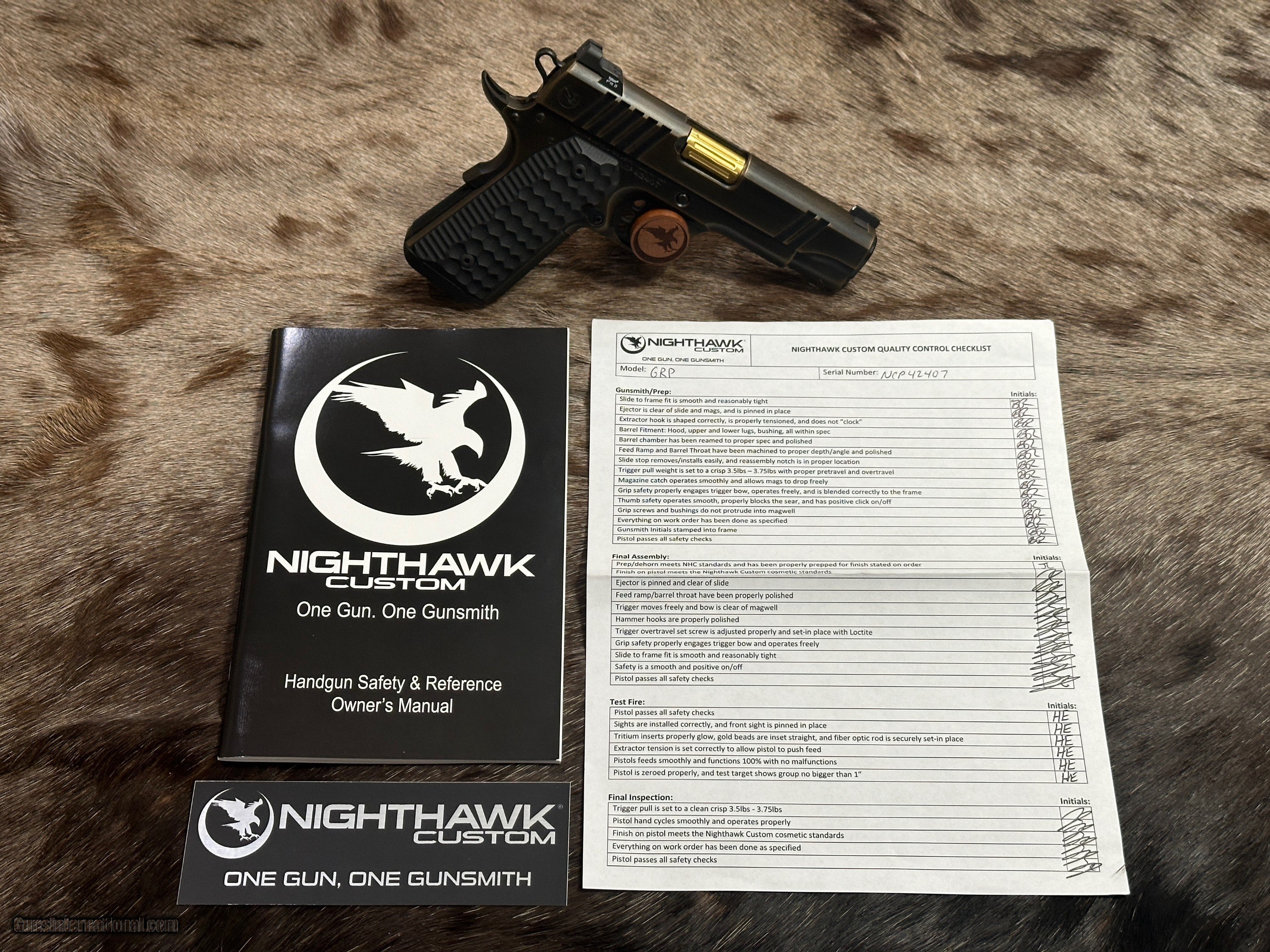 Description: NEW NIGHTHAWK CUSTOM GRP OFFICER 1911 9MM PISTOL WITH MANY UPGRADES - LAYAWAY AVAILABLE The GRP, just like every Nighthawk Custom pistol, has each part hand fit by a single gunsmith. The GRP utilizes coarse cocking serrations on the front and rear of the slide. It includes Heinie Ledge Straight Eight tritium rear sight paired with a tritium front sight. The GRP uses all the same fully machined parts and craftsmanship that go into our entire Nighthawk Custom lineup. This model, along with all others, follows the “One Gun, One Gunsmith” philosophy which means the gun is built by a single gunsmith. We have no assembly line. We have a group of master gunsmiths that start with a box of intentionally oversized parts and build them into the world’s finest 1911. FEATURES OF THIS GREAT CUSTOM 1911 INCLUDE:
