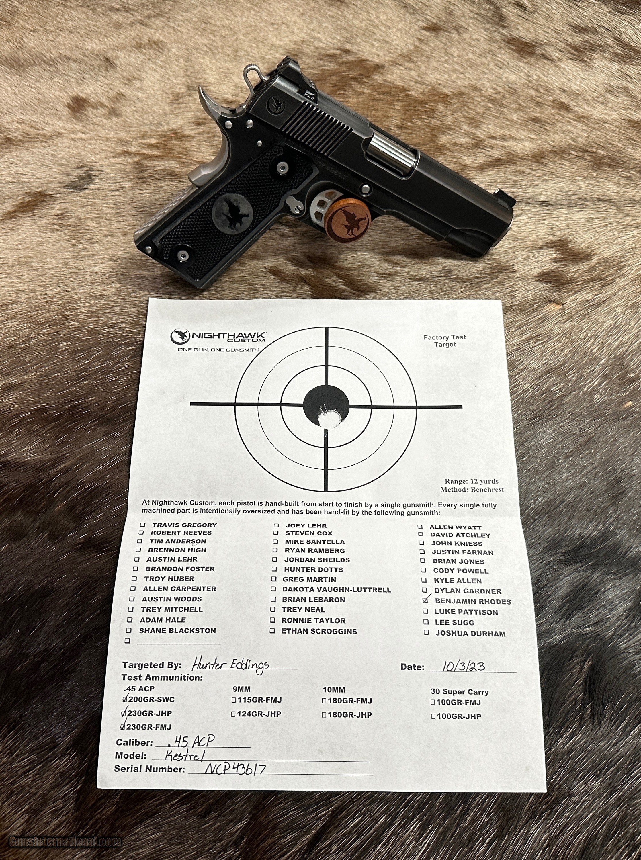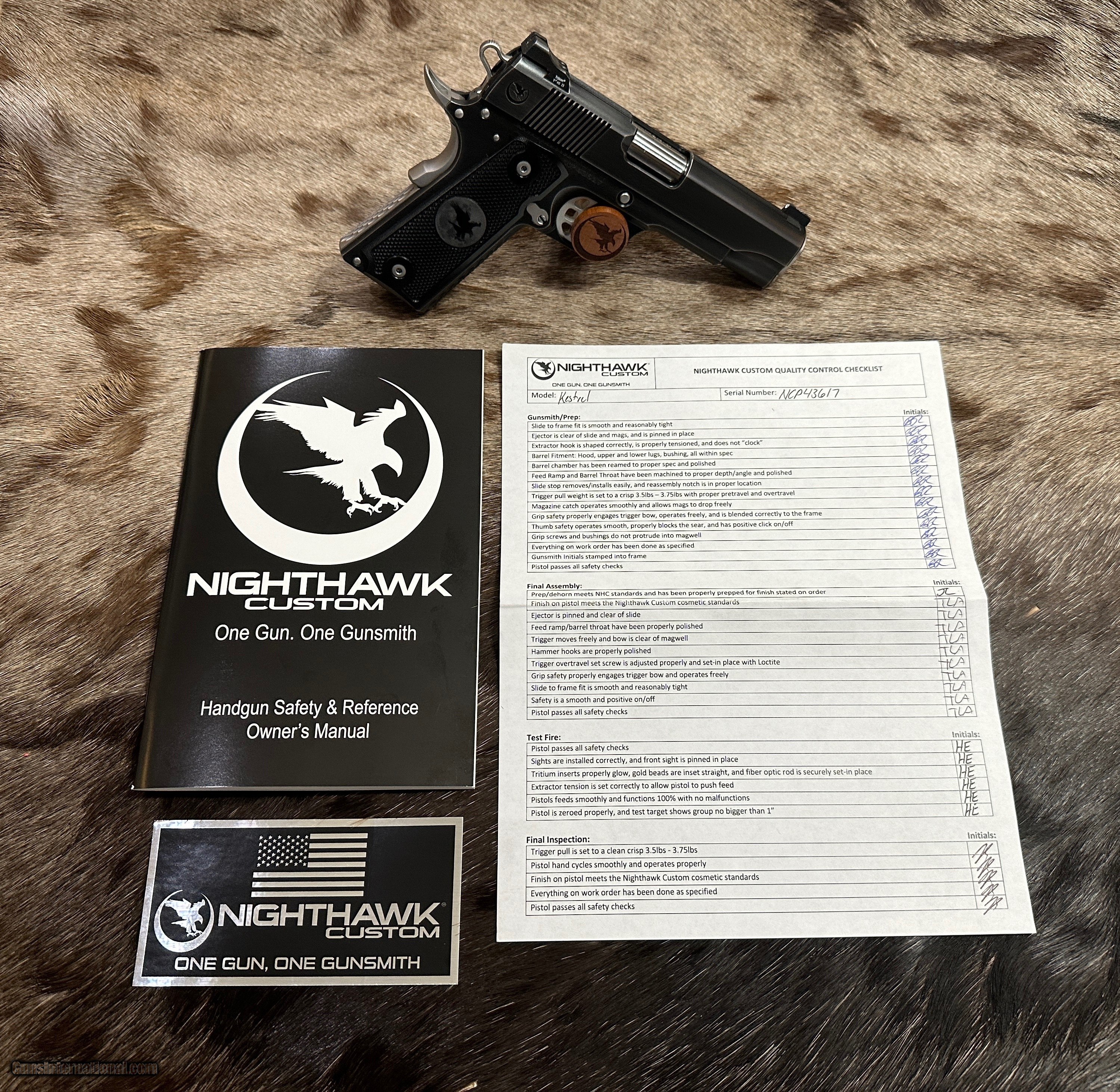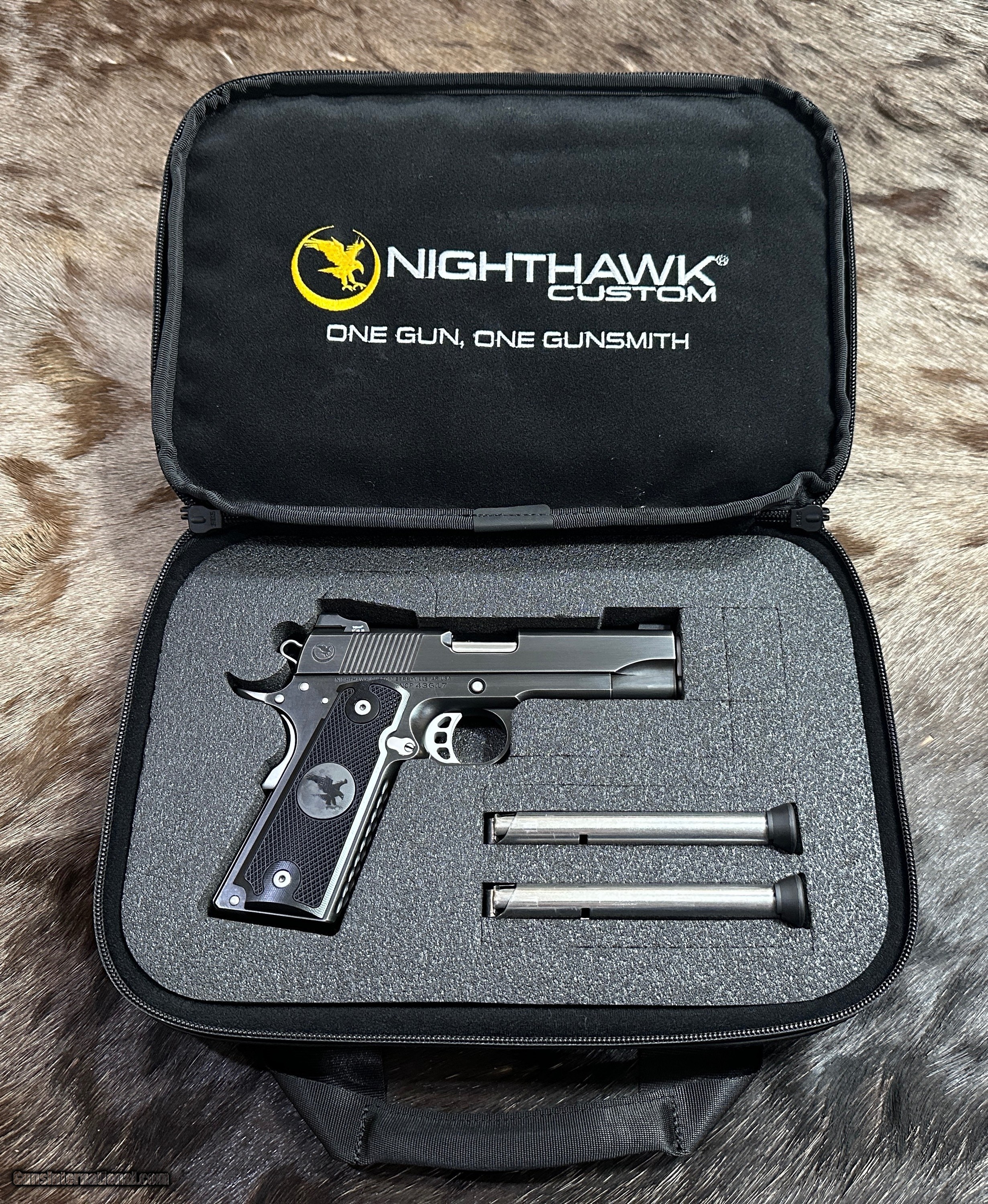 Description: NEW NIGHTHAWK CUSTOM KESTREL COMMANDER 1911 45 ACP PISTOL WITH SMOKED NITRIDE FINISH - LAYAWAY AVAILABLE The Kestrel is a masterpiece to behold with great ergonomics and eye appeal. It has a thinned down front strap, flat mainspring housing, and thin grips, which give this pistol a great feel. The moonhawk behind the rear cocking serrations create a clean slide, along with scallops and a black nitride finish with stainless steel controls make this a great looking 1911. FEATURES OF THIS GREAT CUSTOM 1911 INCLUDE: