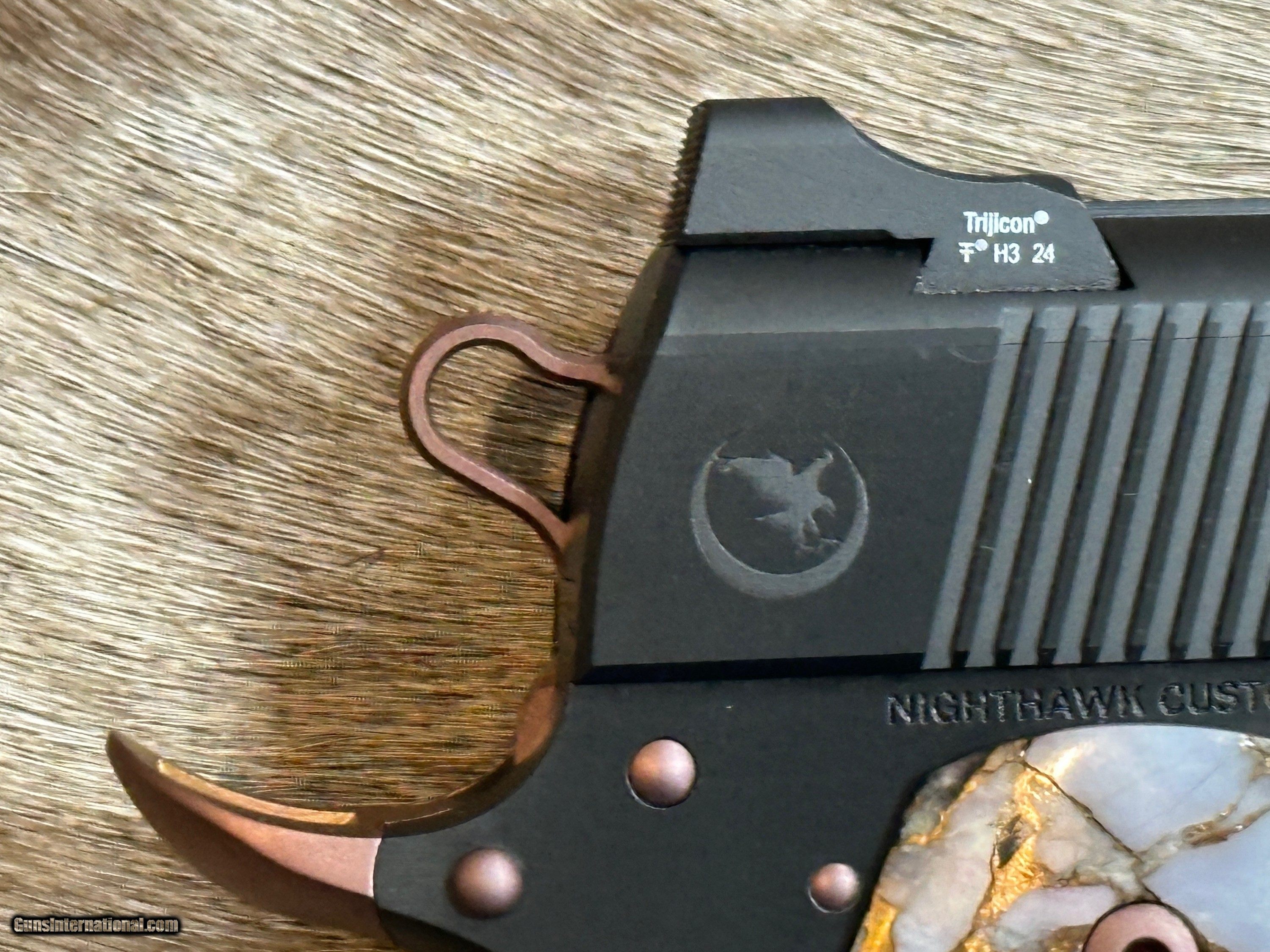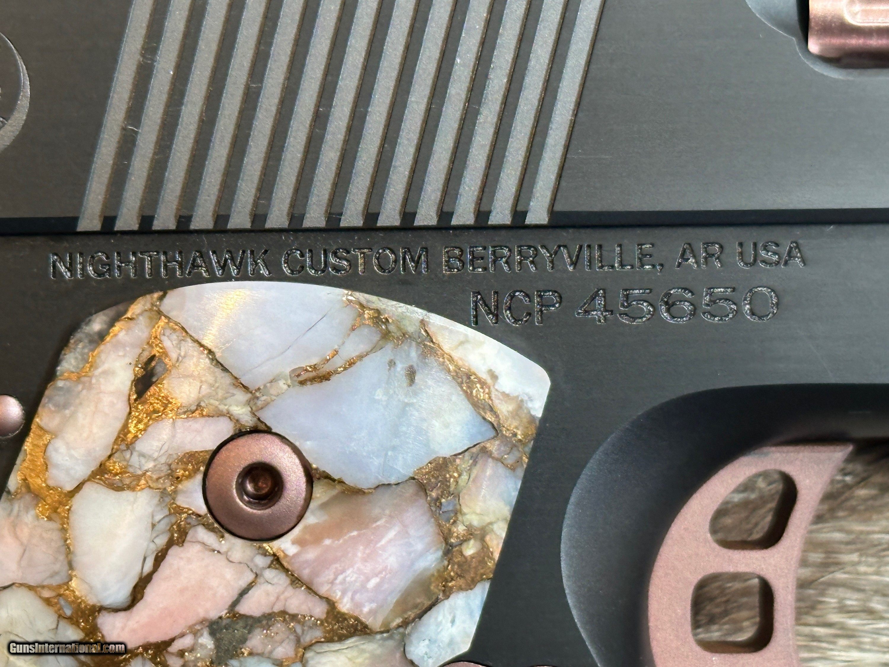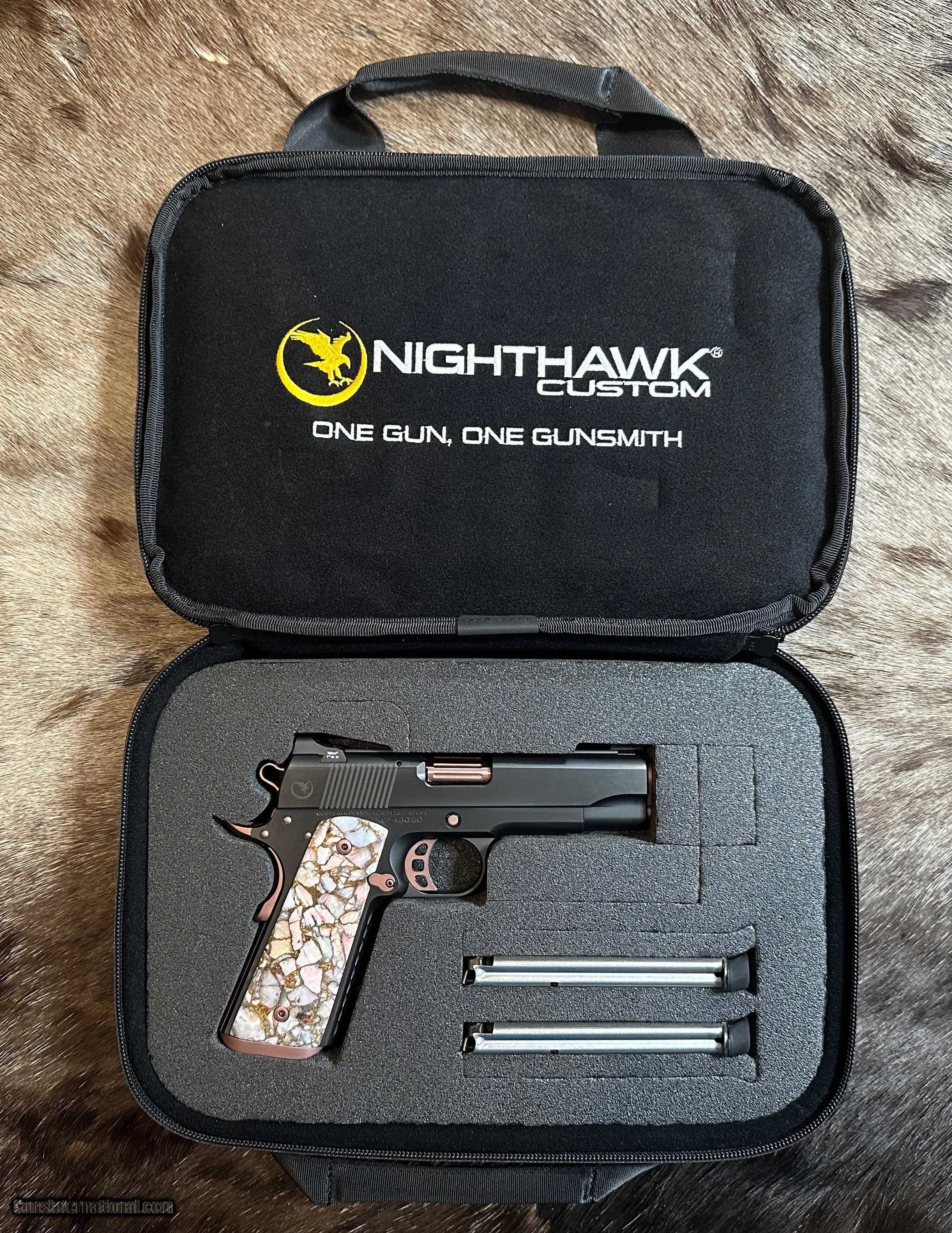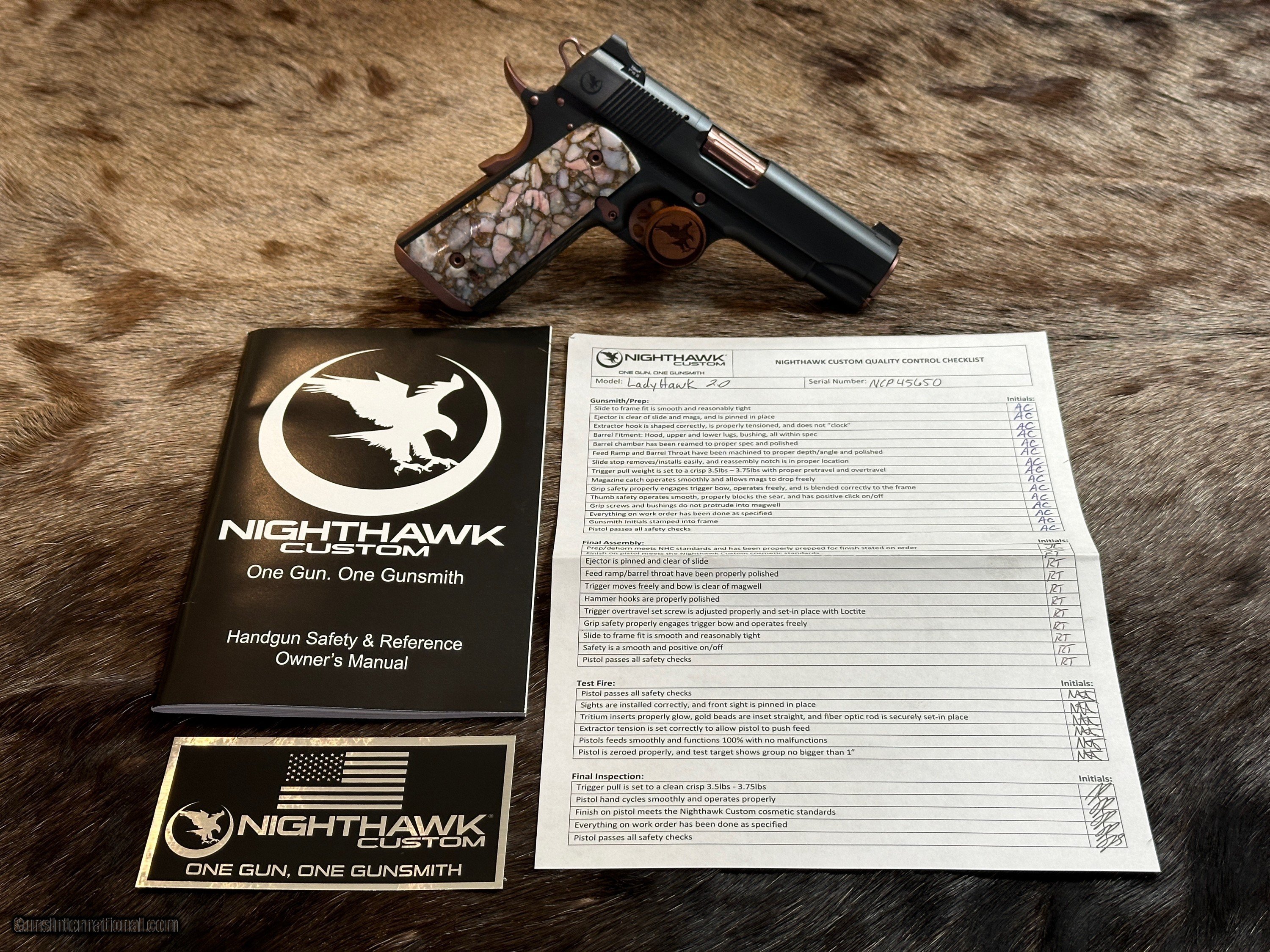 Description: NEW NIGHTHAWK CUSTOM LADY HAWK 2.0 COMMANDER 1911 9MM PISTOL WITH IOS AND OTHER UPGRADES - LAYAWAY AVAILABLE The Nighthawk Custom Lady Hawk 2.0 is a stylish and modern reinterpretation of the original Lady Hawk. This pistol has been designed with a focus on elegance, making it particularly appealing to shooters and those who appreciate a unique, sophisticated aesthetic. The Lady Hawk 2.0 is finished with a slide and frame coated in DLC (Diamond-Like Carbon) for a sleek, durable look, and rose gold accents for an eye-catching, luxurious appearance. This finish is complemented by the TiCN rose gold barrel and controls, adding a distinctive flair to the overall design. The frame of the Lady Hawk 2.0 has been expertly thinned down, and the addition of thin grips ensures a comfortable and secure purchase on the pistol. These features enhance the shooter's control and handling, making the pistol a pleasure to shoot. One of the most striking aspects of the Lady Hawk 2.0 is the set of highly unique grips made from Peruvian Opal. This rare and beautiful material has been used in various luxury applications, such as jewelry and knives, but this is the first time it has been incorporated into grips for a 1911 pistol. The opal grips lend the pistol an exquisite and exclusive touch that sets it apart from other firearms. With its combination of cutting-edge design, luxurious finishes, and distinctive materials, the Nighthawk Custom Lady Hawk 2.0 stands out as a refined and captivating choice for shooters who seek both performance and beauty in their firearms. Whether for personal defense, competitive shooting, or as a statement piece, the Lady Hawk 2.0 is sure to impress with its sophisticated aesthetics and exceptional craftsmanship. FEATURES OF THIS GREAT CUSTOM 1911 INCLUDE:
