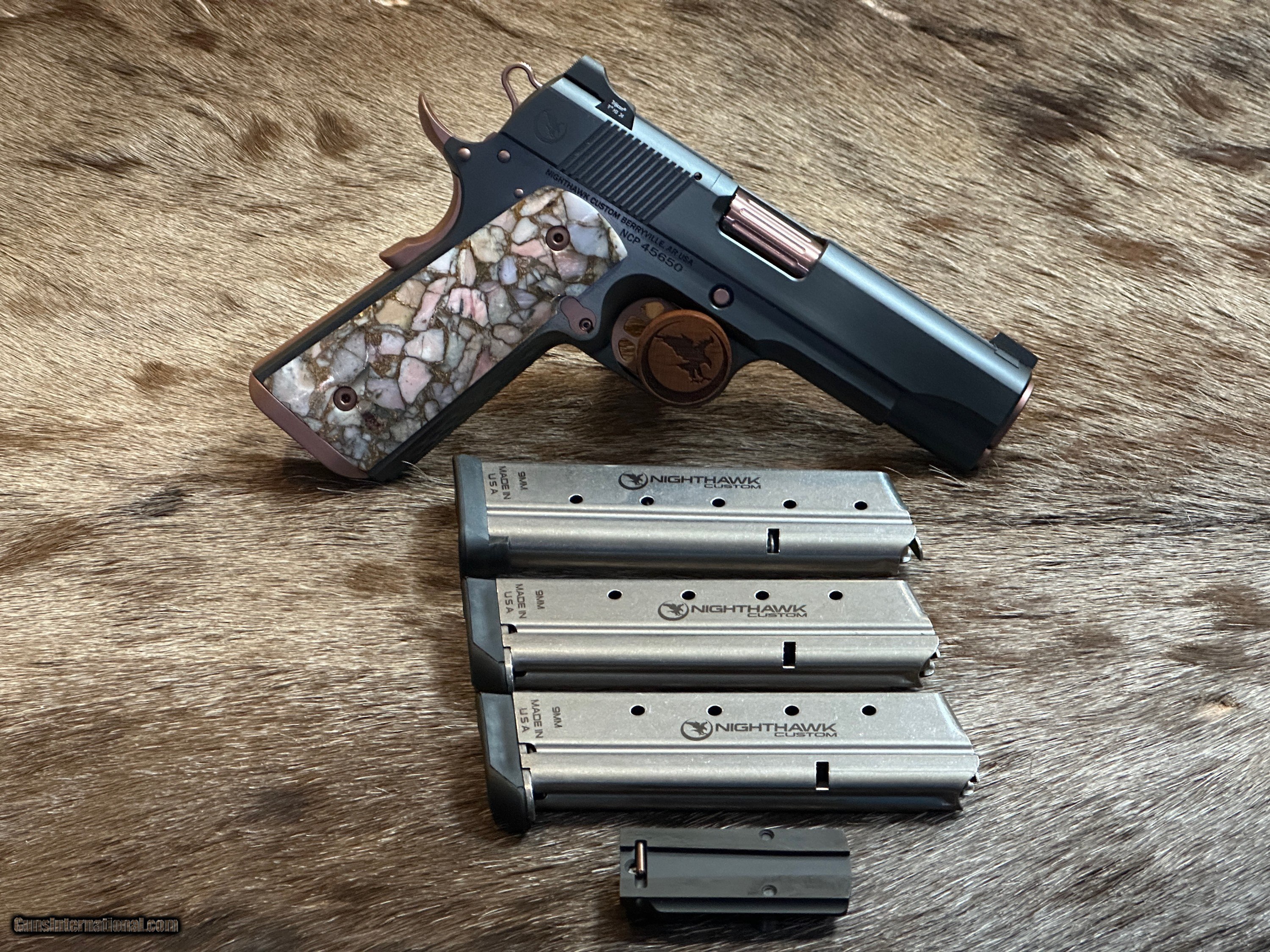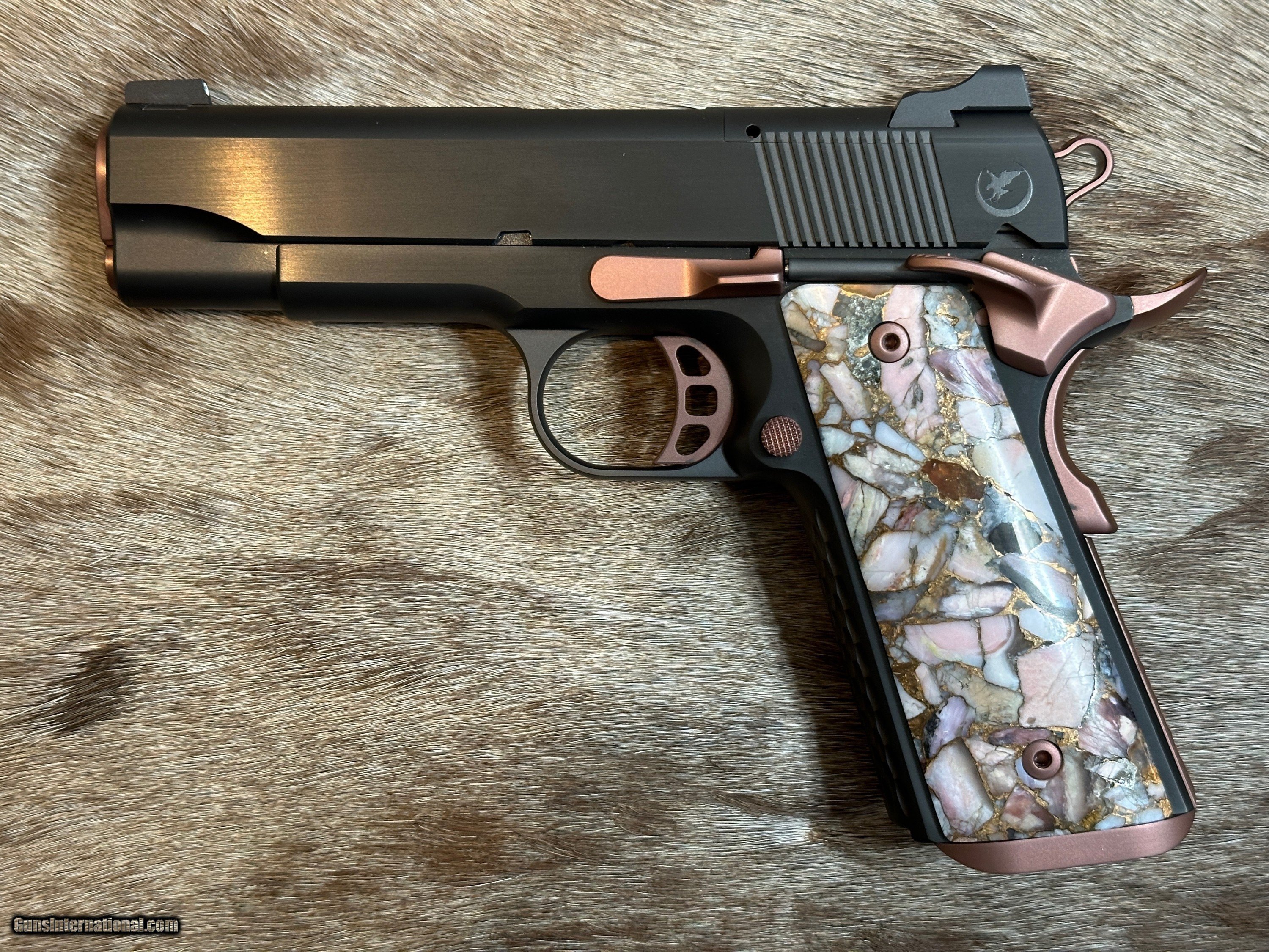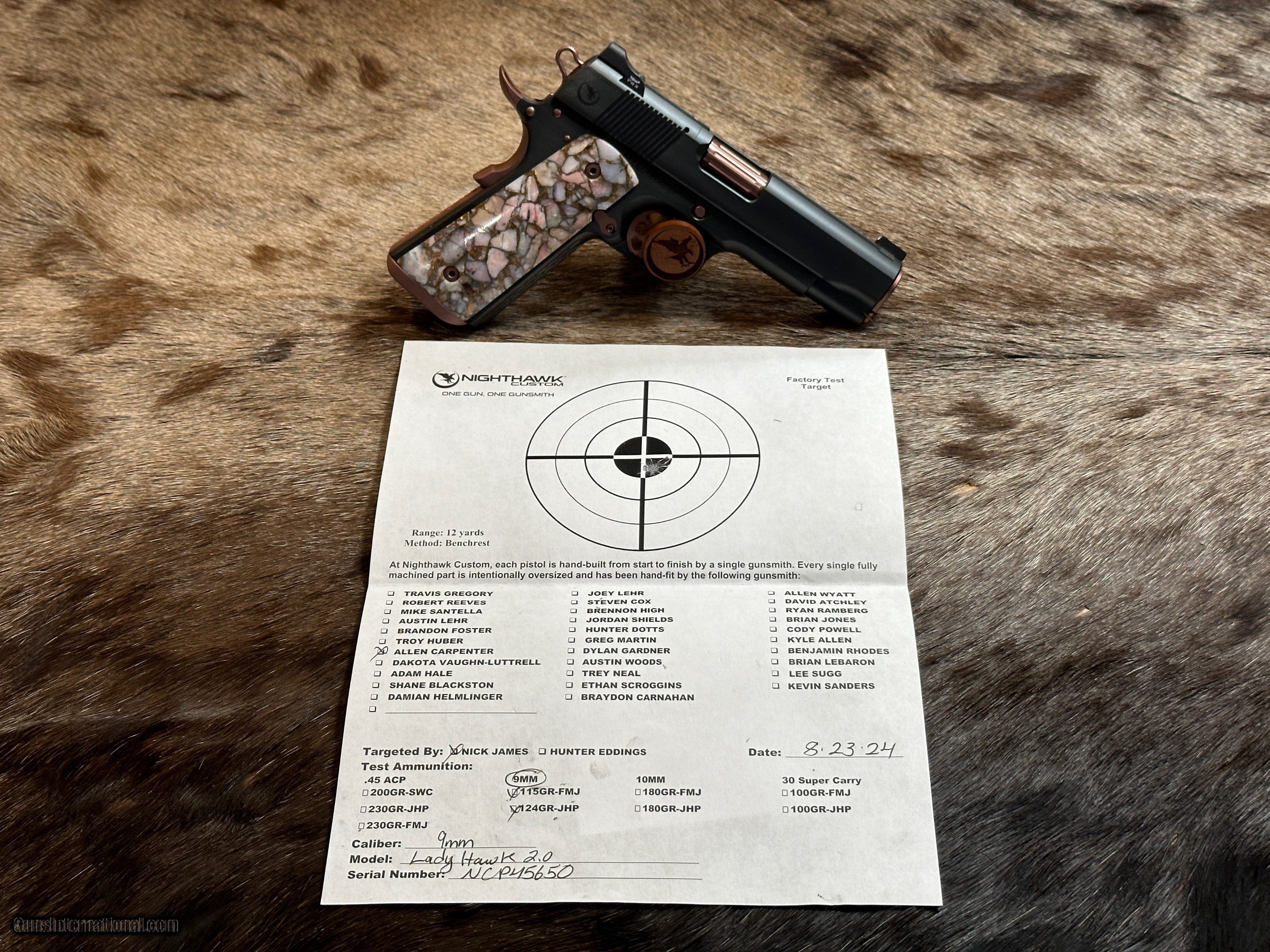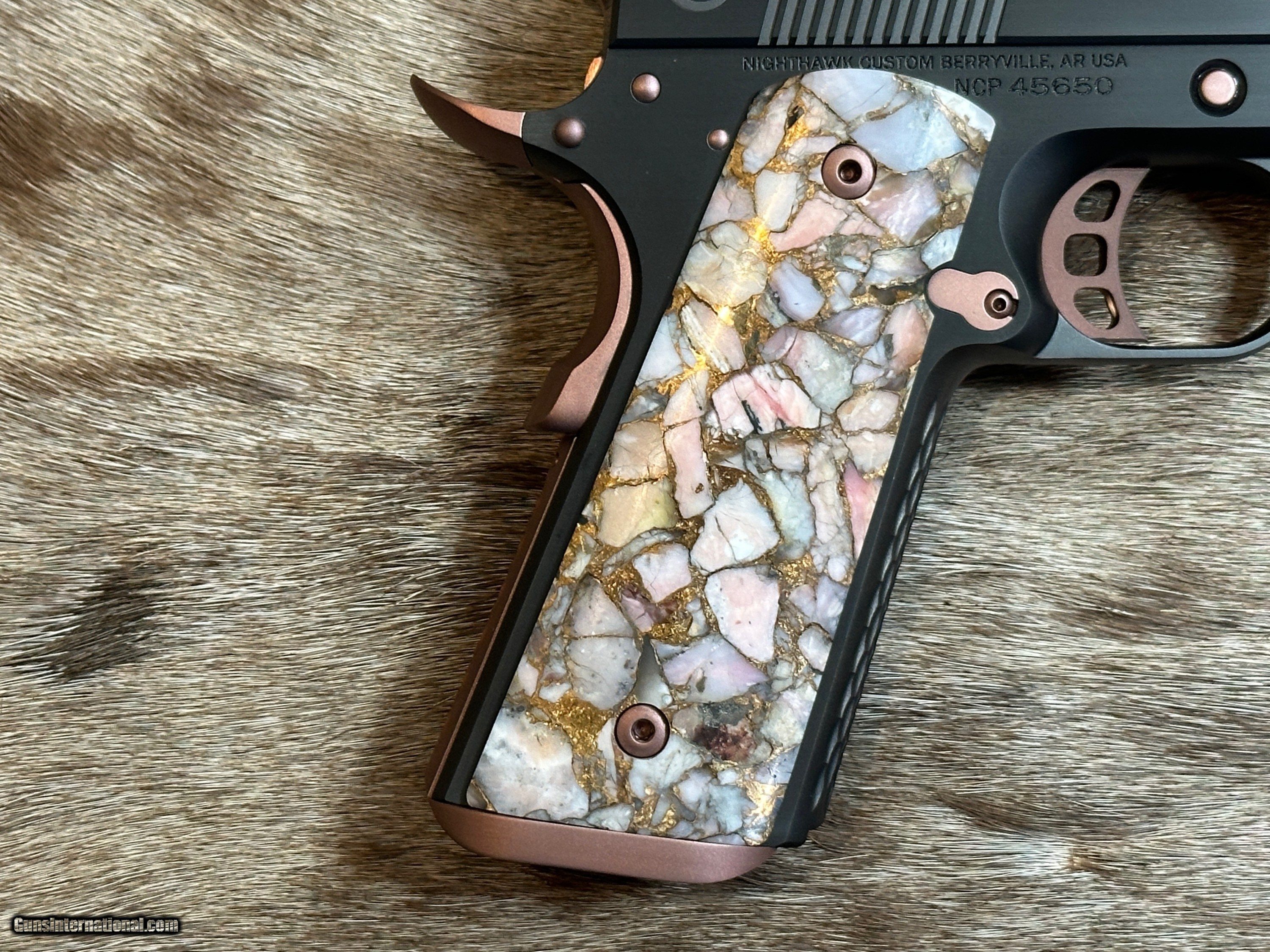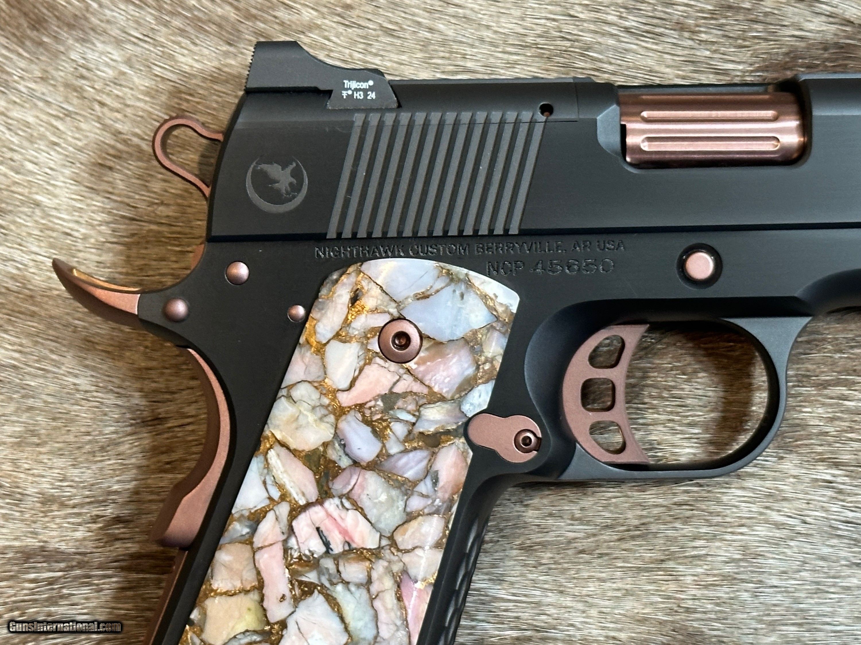 Description: NEW NIGHTHAWK CUSTOM LADY HAWK 2.0 COMMANDER 1911 9MM PISTOL WITH IOS AND OTHER UPGRADES - LAYAWAY AVAILABLE The Nighthawk Custom Lady Hawk 2.0 is a stylish and modern reinterpretation of the original Lady Hawk. This pistol has been designed with a focus on elegance, making it particularly appealing to shooters and those who appreciate a unique, sophisticated aesthetic. The Lady Hawk 2.0 is finished with a slide and frame coated in DLC (Diamond-Like Carbon) for a sleek, durable look, and rose gold accents for an eye-catching, luxurious appearance. This finish is complemented by the TiCN rose gold barrel and controls, adding a distinctive flair to the overall design. The frame of the Lady Hawk 2.0 has been expertly thinned down, and the addition of thin grips ensures a comfortable and secure purchase on the pistol. These features enhance the shooter's control and handling, making the pistol a pleasure to shoot. One of the most striking aspects of the Lady Hawk 2.0 is the set of highly unique grips made from Peruvian Opal. This rare and beautiful material has been used in various luxury applications, such as jewelry and knives, but this is the first time it has been incorporated into grips for a 1911 pistol. The opal grips lend the pistol an exquisite and exclusive touch that sets it apart from other firearms. With its combination of cutting-edge design, luxurious finishes, and distinctive materials, the Nighthawk Custom Lady Hawk 2.0 stands out as a refined and captivating choice for shooters who seek both performance and beauty in their firearms. Whether for personal defense, competitive shooting, or as a statement piece, the Lady Hawk 2.0 is sure to impress with its sophisticated aesthetics and exceptional craftsmanship. FEATURES OF THIS GREAT CUSTOM 1911 INCLUDE: