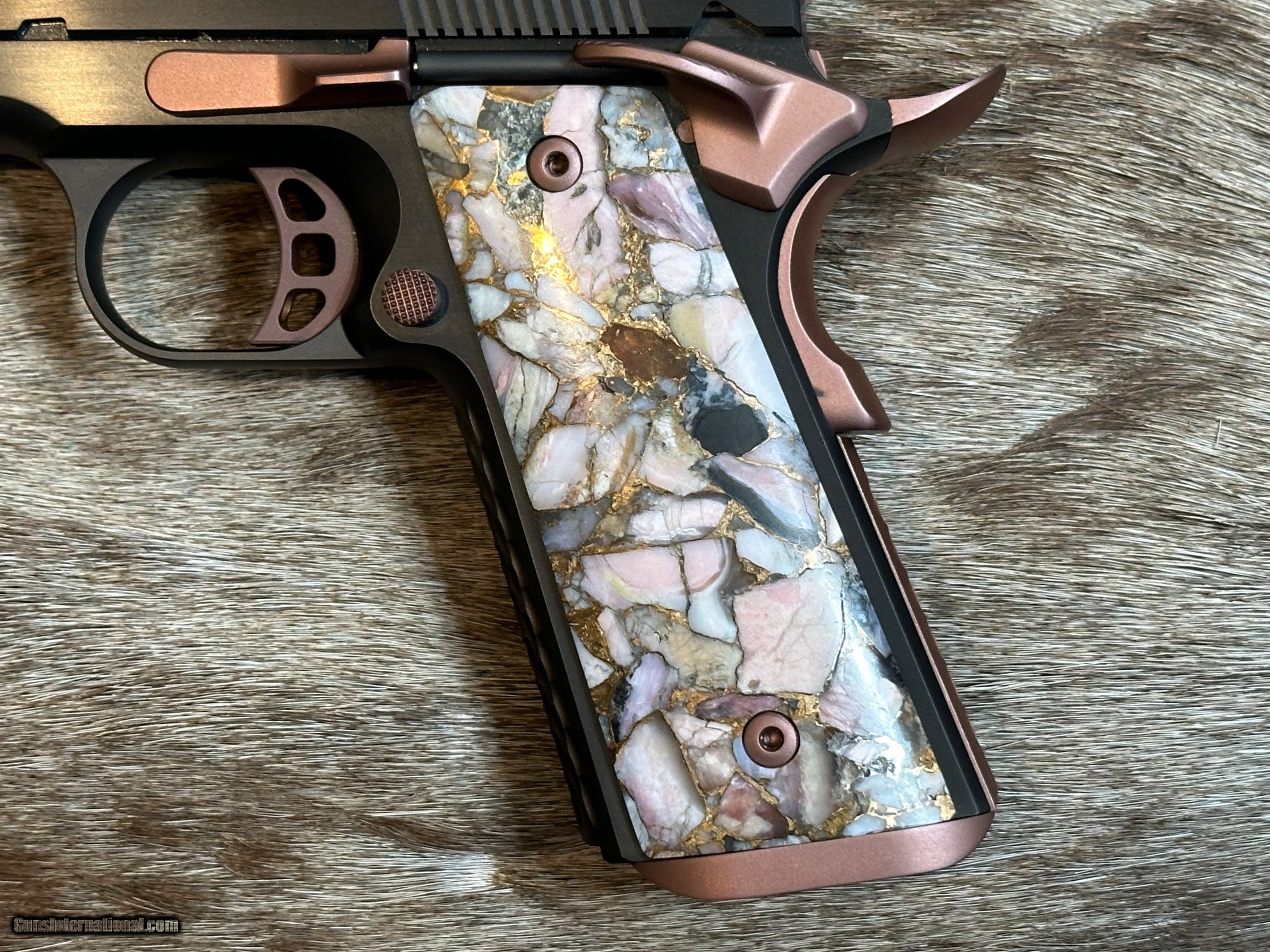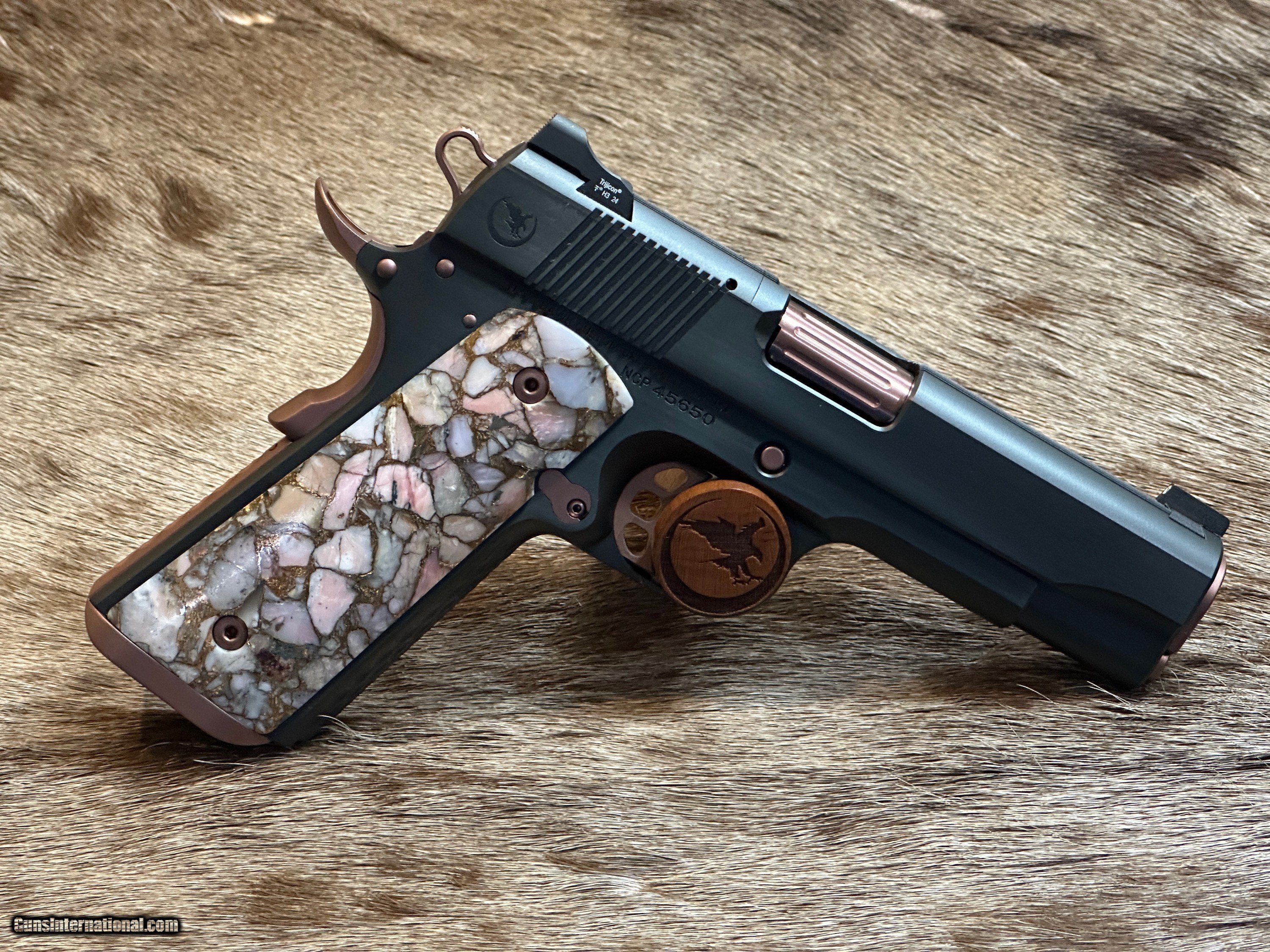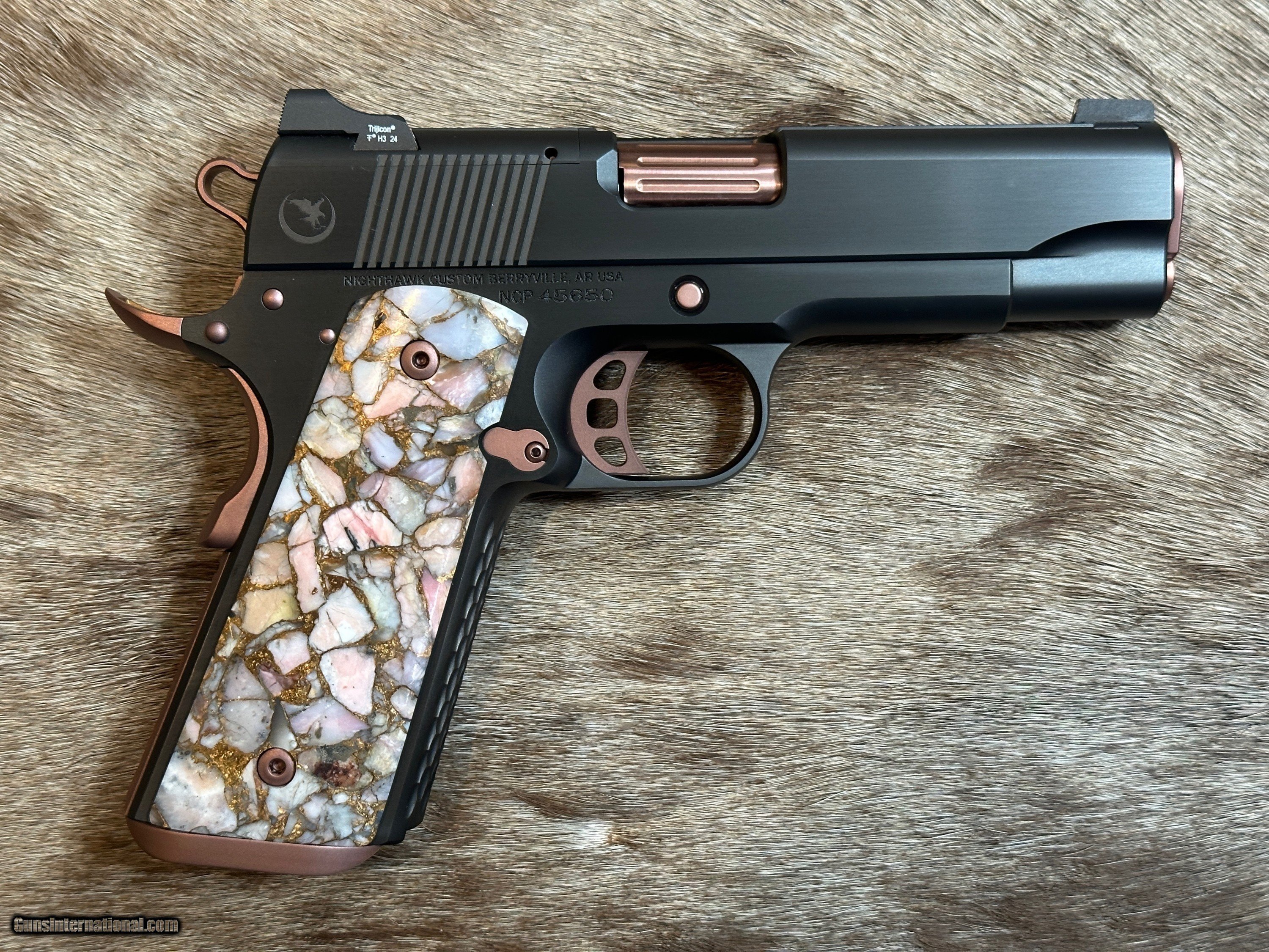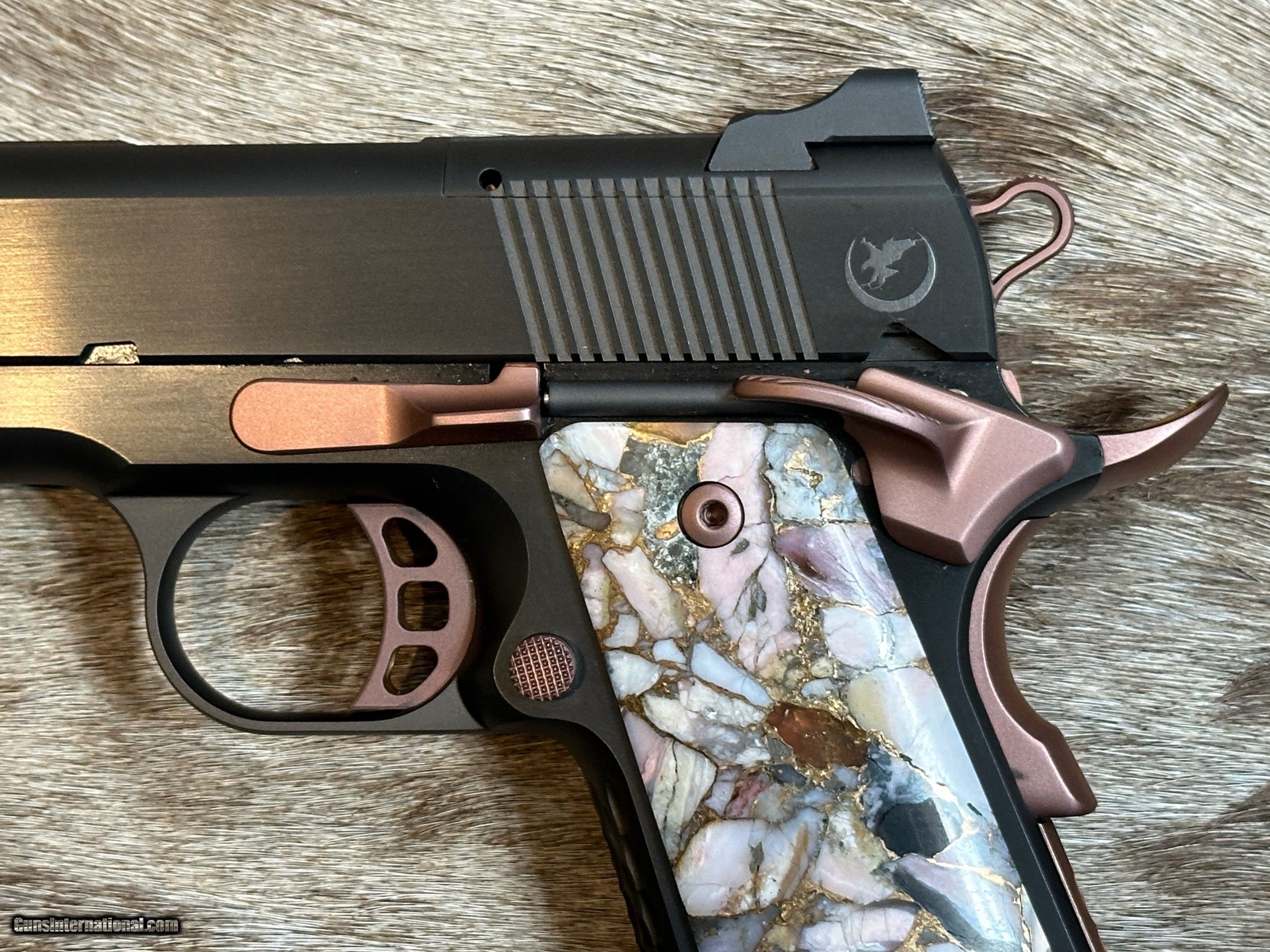 Description: NEW NIGHTHAWK CUSTOM LADY HAWK 2.0 COMMANDER 1911 9MM PISTOL WITH IOS AND OTHER UPGRADES - LAYAWAY AVAILABLE The Nighthawk Custom Lady Hawk 2.0 is a stylish and modern reinterpretation of the original Lady Hawk. This pistol has been designed with a focus on elegance, making it particularly appealing to shooters and those who appreciate a unique, sophisticated aesthetic. The Lady Hawk 2.0 is finished with a slide and frame coated in DLC (Diamond-Like Carbon) for a sleek, durable look, and rose gold accents for an eye-catching, luxurious appearance. This finish is complemented by the TiCN rose gold barrel and controls, adding a distinctive flair to the overall design. The frame of the Lady Hawk 2.0 has been expertly thinned down, and the addition of thin grips ensures a comfortable and secure purchase on the pistol. These features enhance the shooter's control and handling, making the pistol a pleasure to shoot. One of the most striking aspects of the Lady Hawk 2.0 is the set of highly unique grips made from Peruvian Opal. This rare and beautiful material has been used in various luxury applications, such as jewelry and knives, but this is the first time it has been incorporated into grips for a 1911 pistol. The opal grips lend the pistol an exquisite and exclusive touch that sets it apart from other firearms. With its combination of cutting-edge design, luxurious finishes, and distinctive materials, the Nighthawk Custom Lady Hawk 2.0 stands out as a refined and captivating choice for shooters who seek both performance and beauty in their firearms. Whether for personal defense, competitive shooting, or as a statement piece, the Lady Hawk 2.0 is sure to impress with its sophisticated aesthetics and exceptional craftsmanship. FEATURES OF THIS GREAT CUSTOM 1911 INCLUDE: