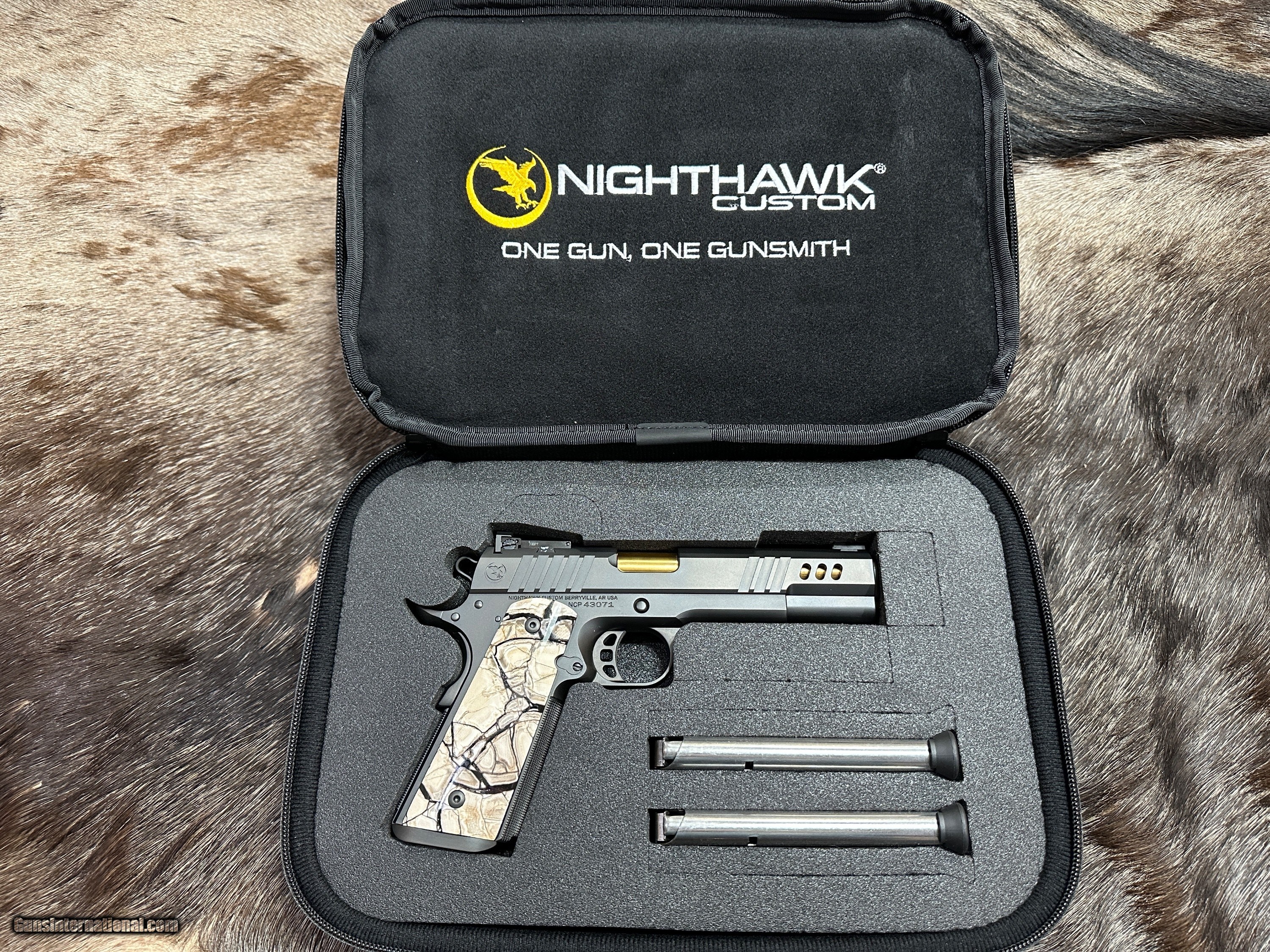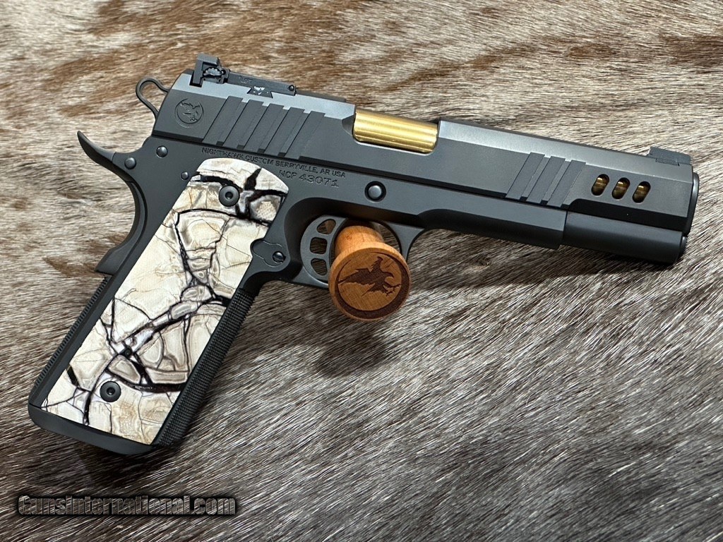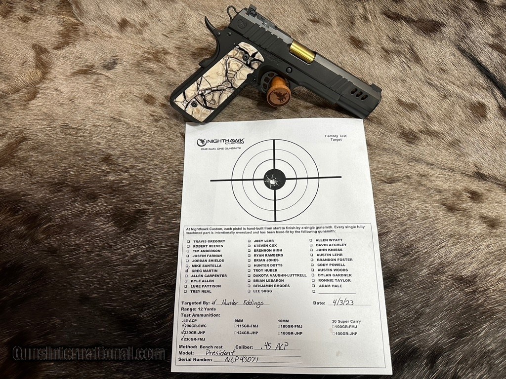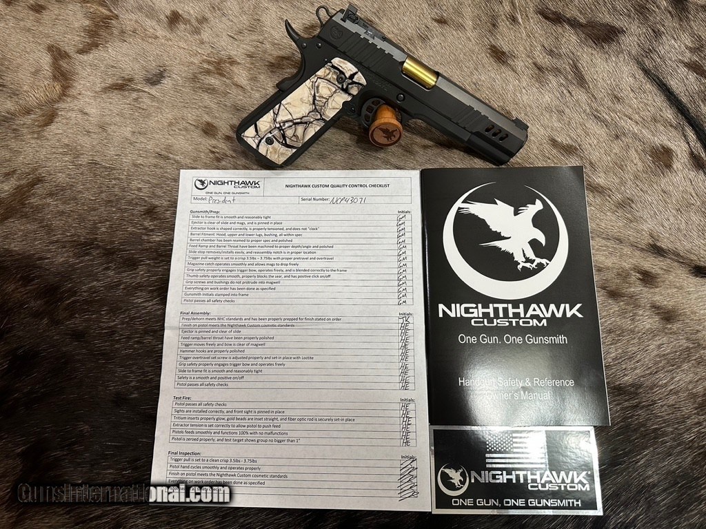 Description: NEW NIGHTHAWK CUSTOM "PRESIDENT" GOVERNMENT 1911 45 ACP PISTOL WITH UPGRADES - LAYAWAY AVAILABLE The President is the second pistol in Nighthawk's sharp, competitive shooting Boardroom Series. This 5” range-ready government 1911 pistol, is a shorter version of the Chairman. Windows and heavy angle, slide-lightening cuts allow it to cycle more rapidly when competitive shooting, while also showing off the stunning Gold Titanium Nitride Barrel. The standard President custom grips are designed in partnership with Railscales and are guaranteed to catch attention on the range. See below for additional upgrades for this specific 1911. FEATURES OF THIS GREAT CUSTOM 1911 INCLUDE: