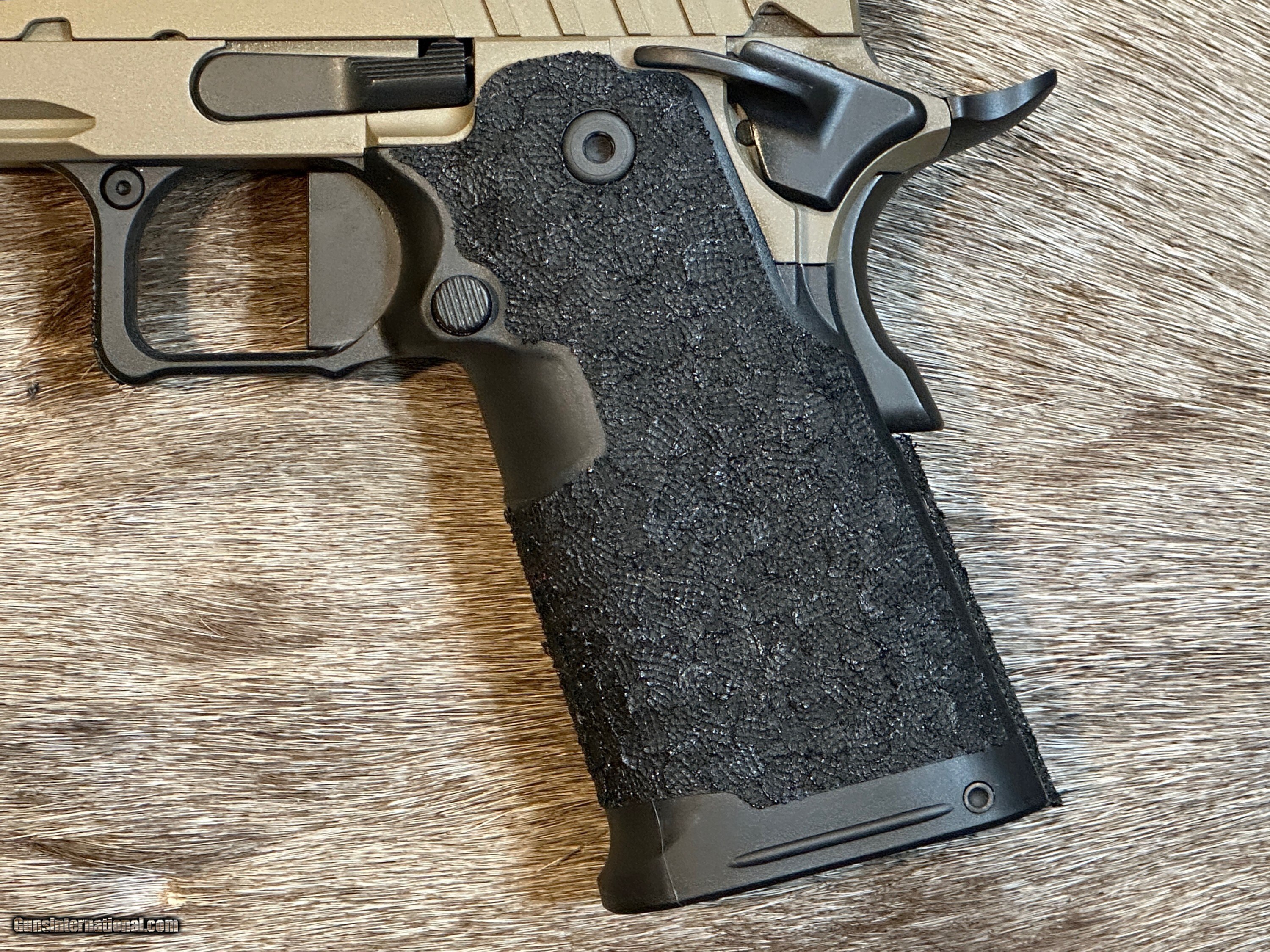 - Hand stipple, aggressive texture polymer grip, black finish