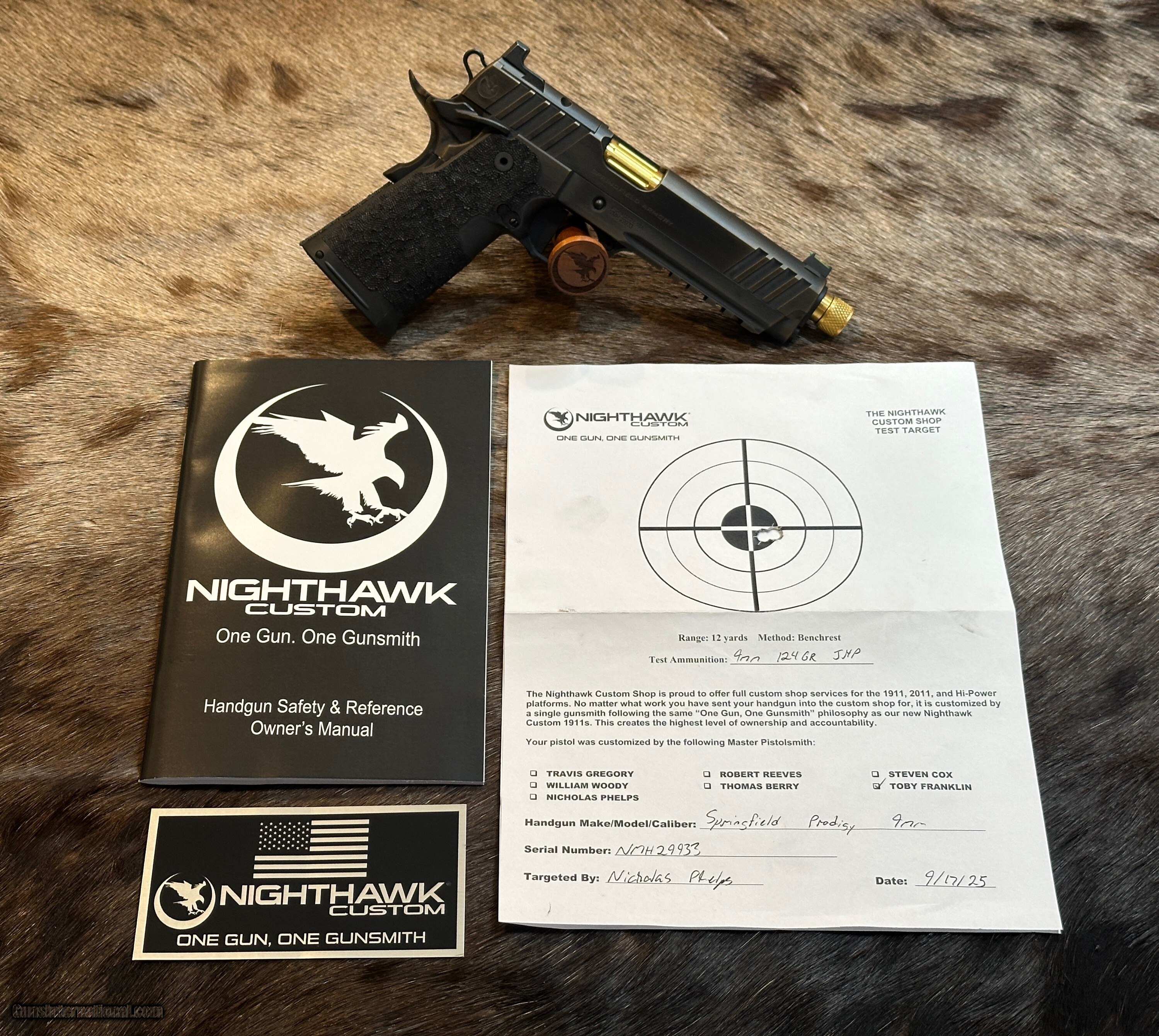 NEW NIGHTHAWK CUSTOM SHOP SPRINGFIELD GOV'T 1911 DS PRODIGY AOS (AGENCY OPTIC SYSTEM) 9MM PISTOL WITH THREADED BARREL AND MANY OTHER UPGRADES - LAYAWAY AVAILABLE