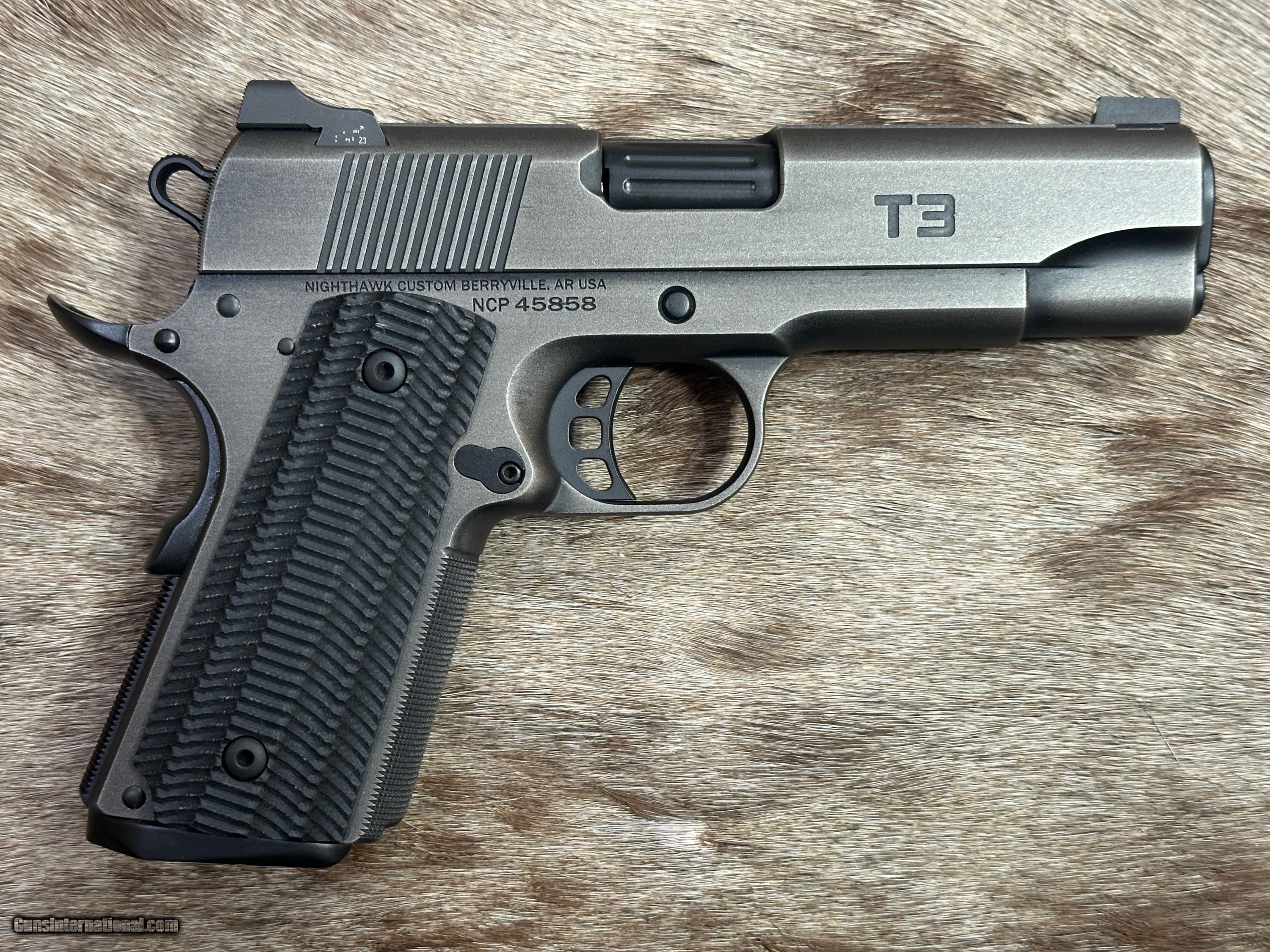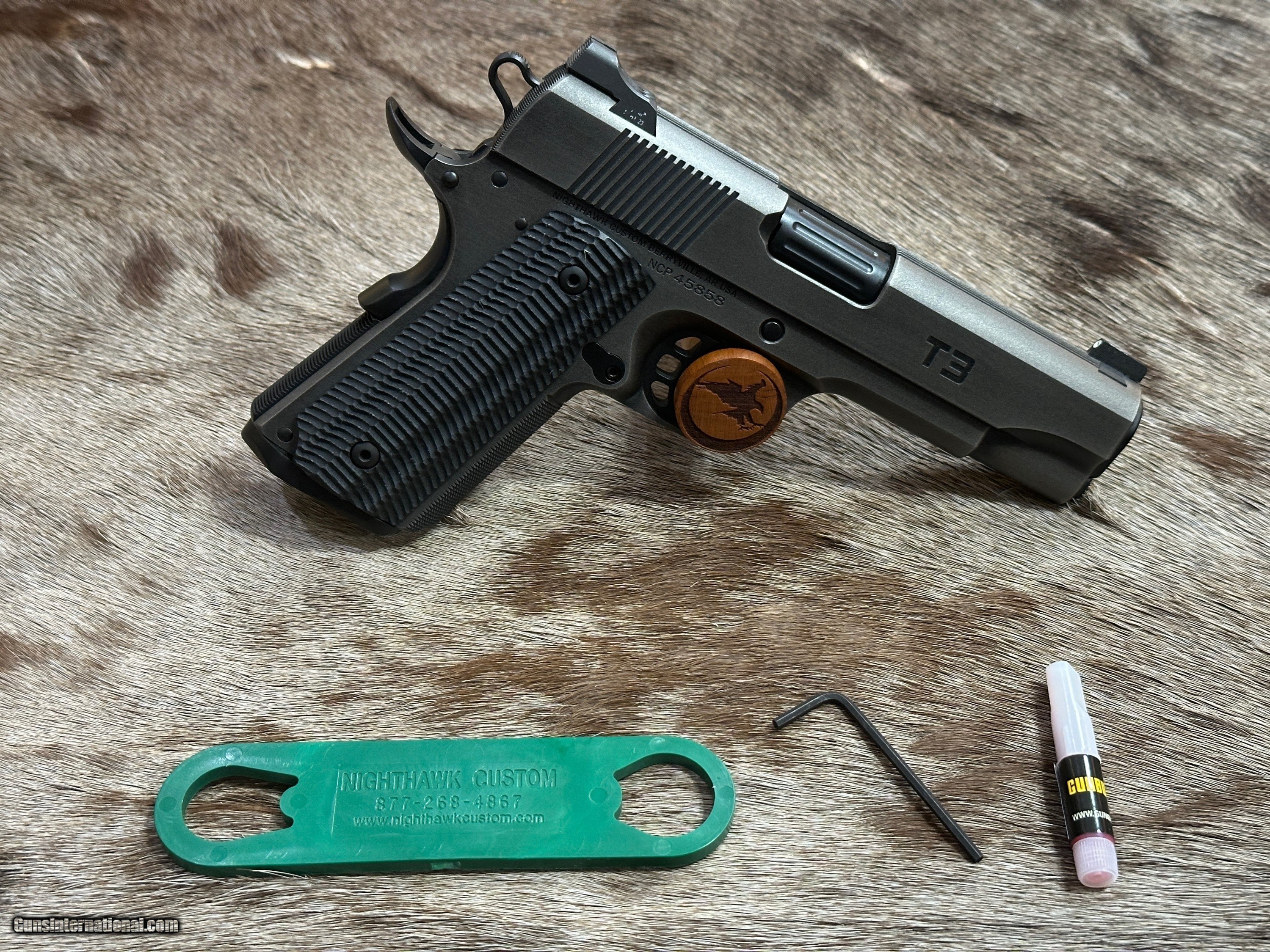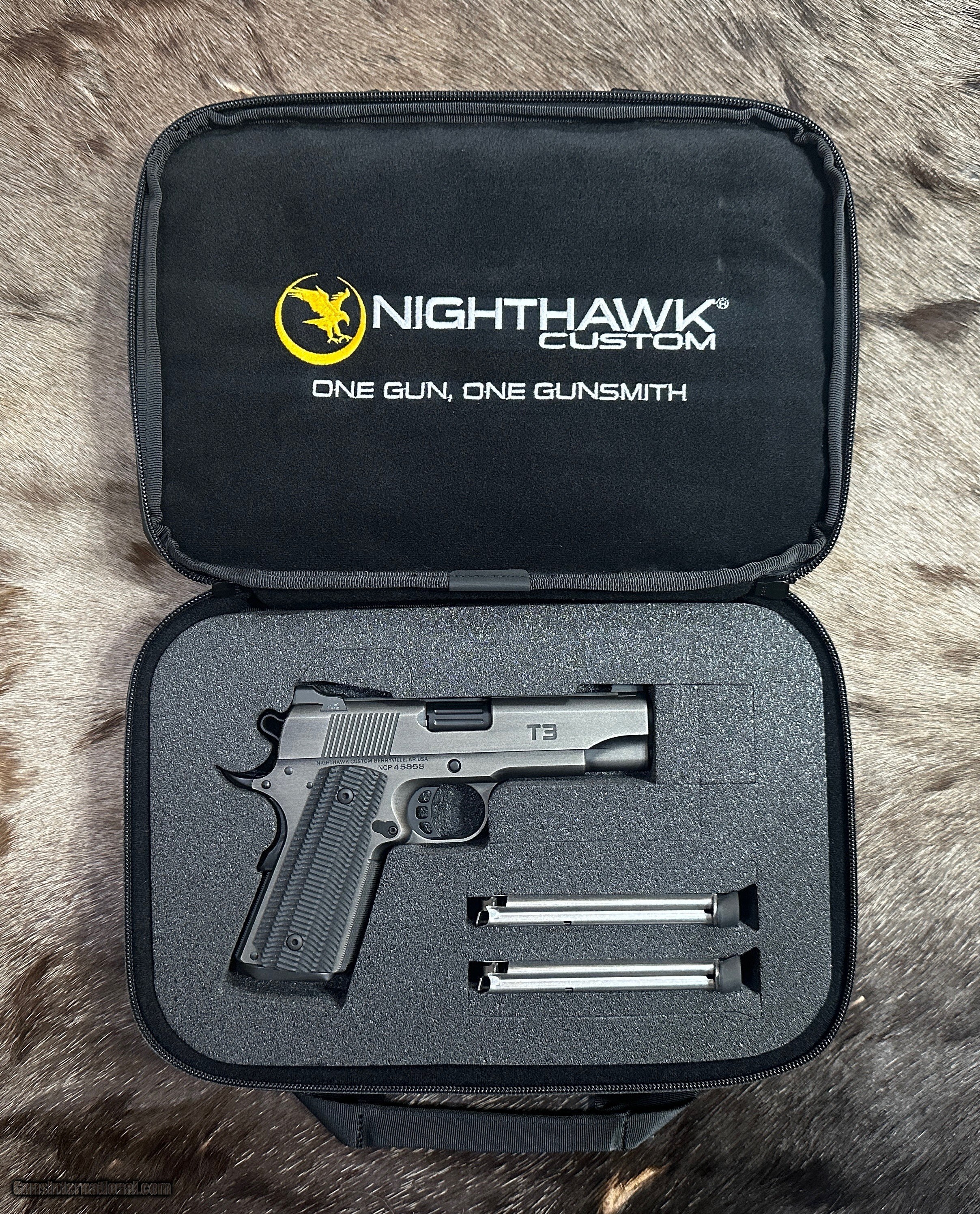 Description: NEW NIGHTHAWK CUSTOM T3 OFFICER 1911 9MM PISTOL WITH UPGRADES - LAYAWAY AVAILABLE The T3 has incredible features for a 1911 carry pistol of its size. It has an officer frame with a commander size slide. It features a Nighthawk Custom T3 magwell, Heinie Slant Pro Straight Eight tritium rear sight, and a serrated rear of the slide to match the sights. The top of the slide is also serrated to reduce glare. When you put all these features in one package, you come up with the finest carry 1911 you can own. FEATURES OF THIS GREAT CUSTOM 1911 INCLUDE: