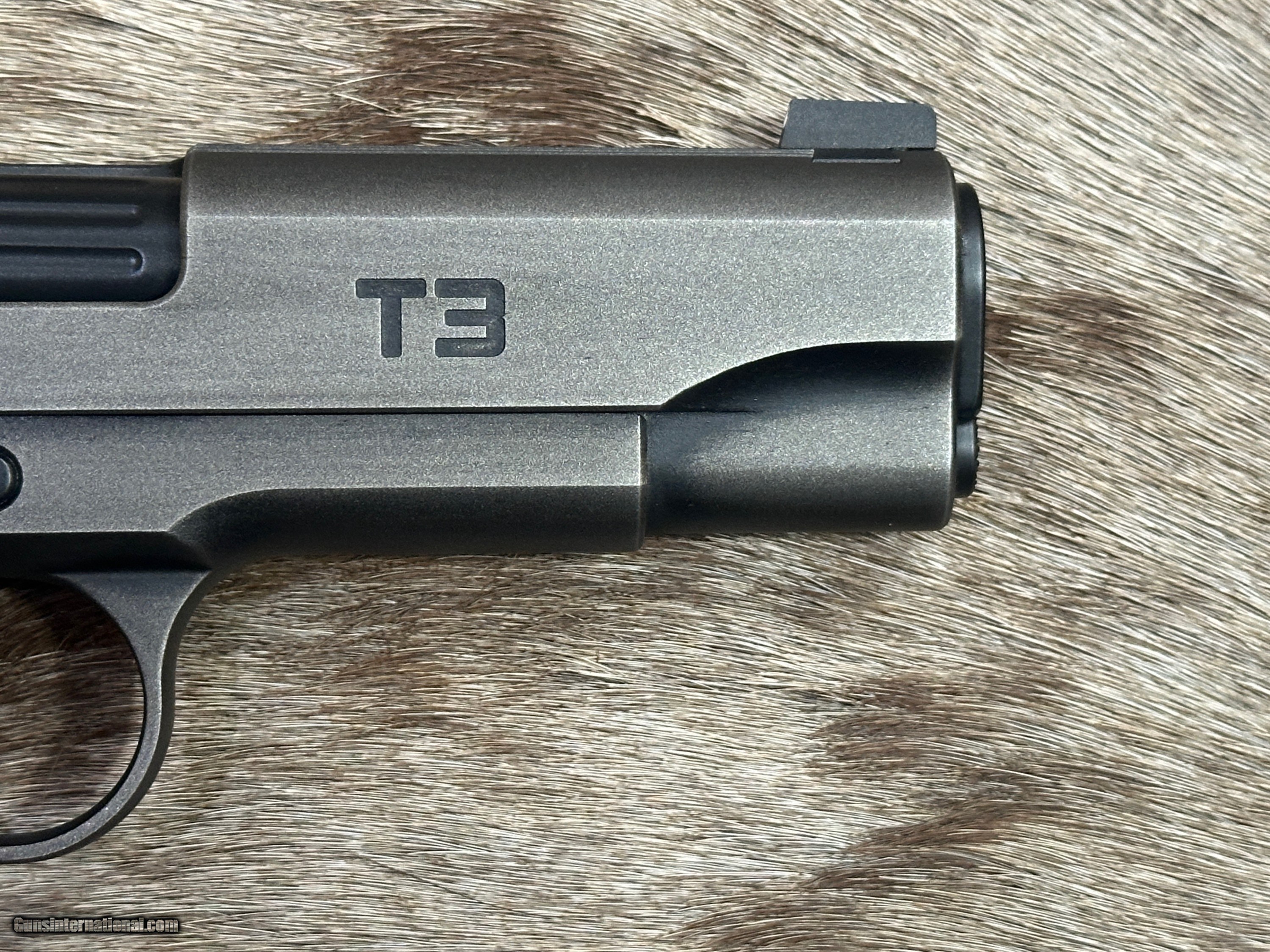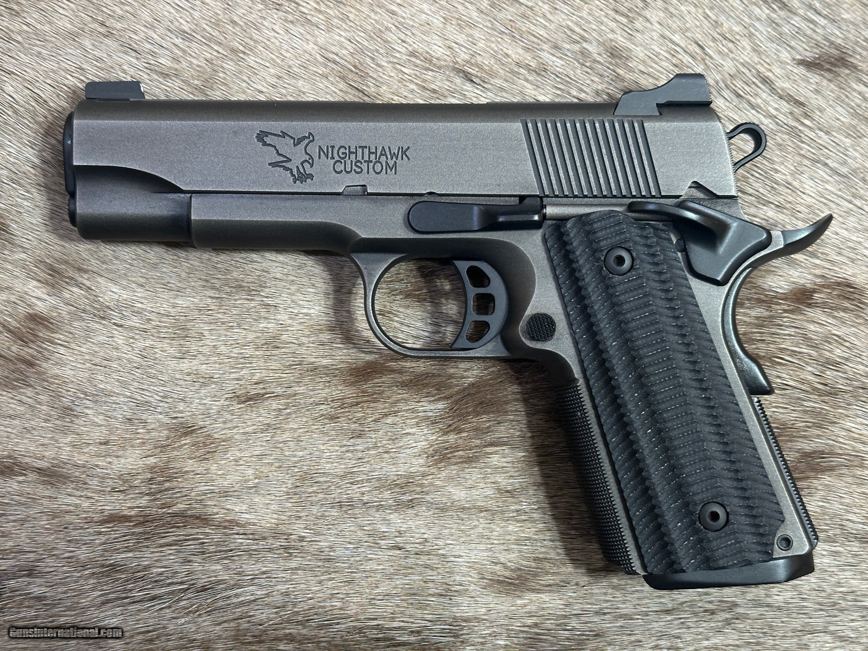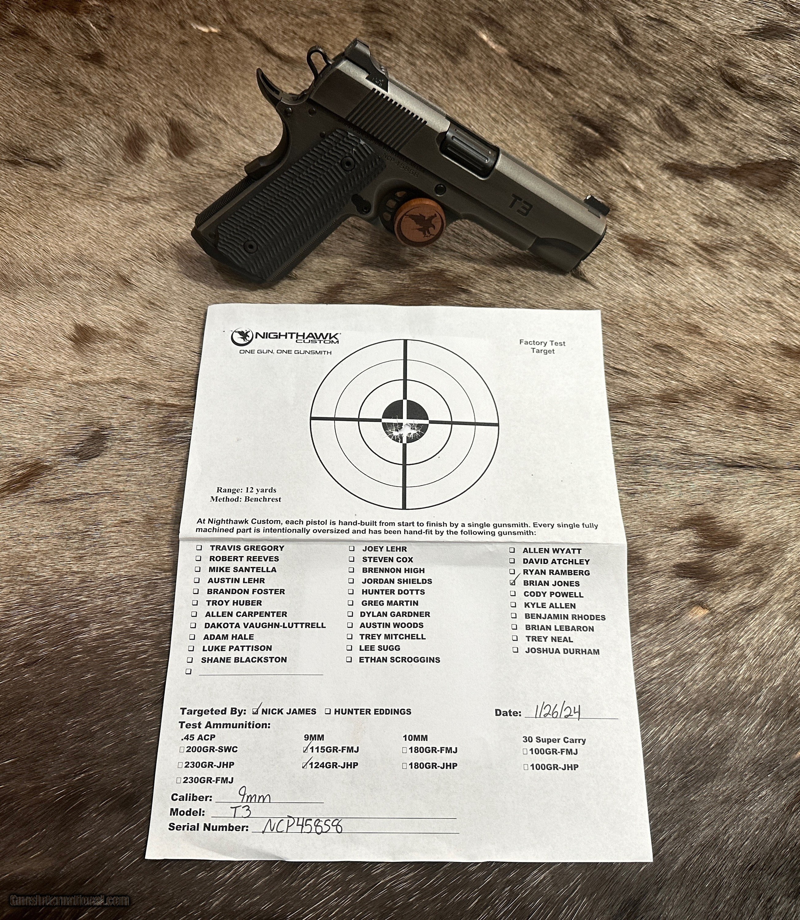 Description: NEW NIGHTHAWK CUSTOM T3 OFFICER 1911 9MM PISTOL WITH UPGRADES - LAYAWAY AVAILABLE The T3 has incredible features for a 1911 carry pistol of its size. It has an officer frame with a commander size slide. It features a Nighthawk Custom T3 magwell, Heinie Slant Pro Straight Eight tritium rear sight, and a serrated rear of the slide to match the sights. The top of the slide is also serrated to reduce glare. When you put all these features in one package, you come up with the finest carry 1911 you can own. FEATURES OF THIS GREAT CUSTOM 1911 INCLUDE: