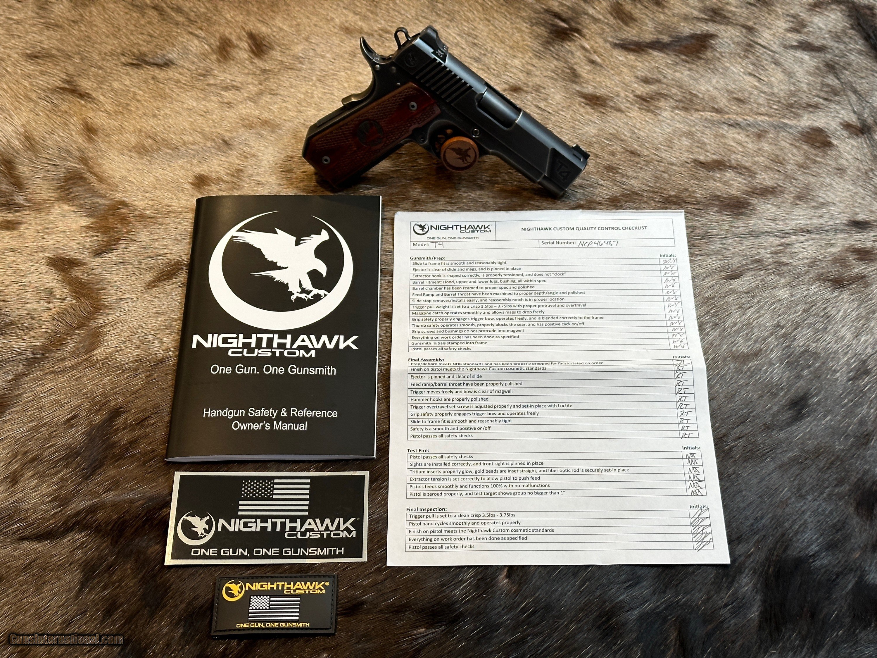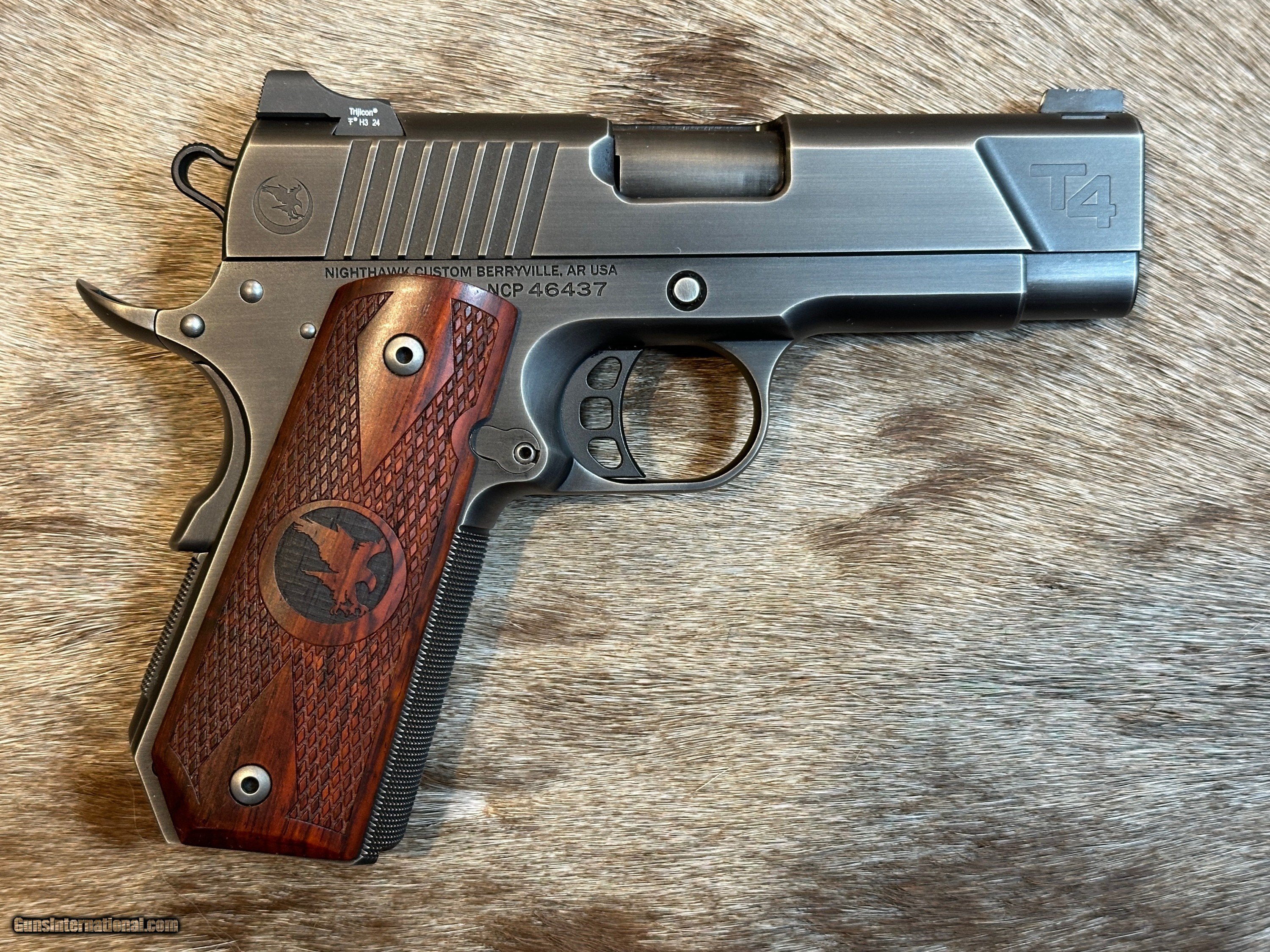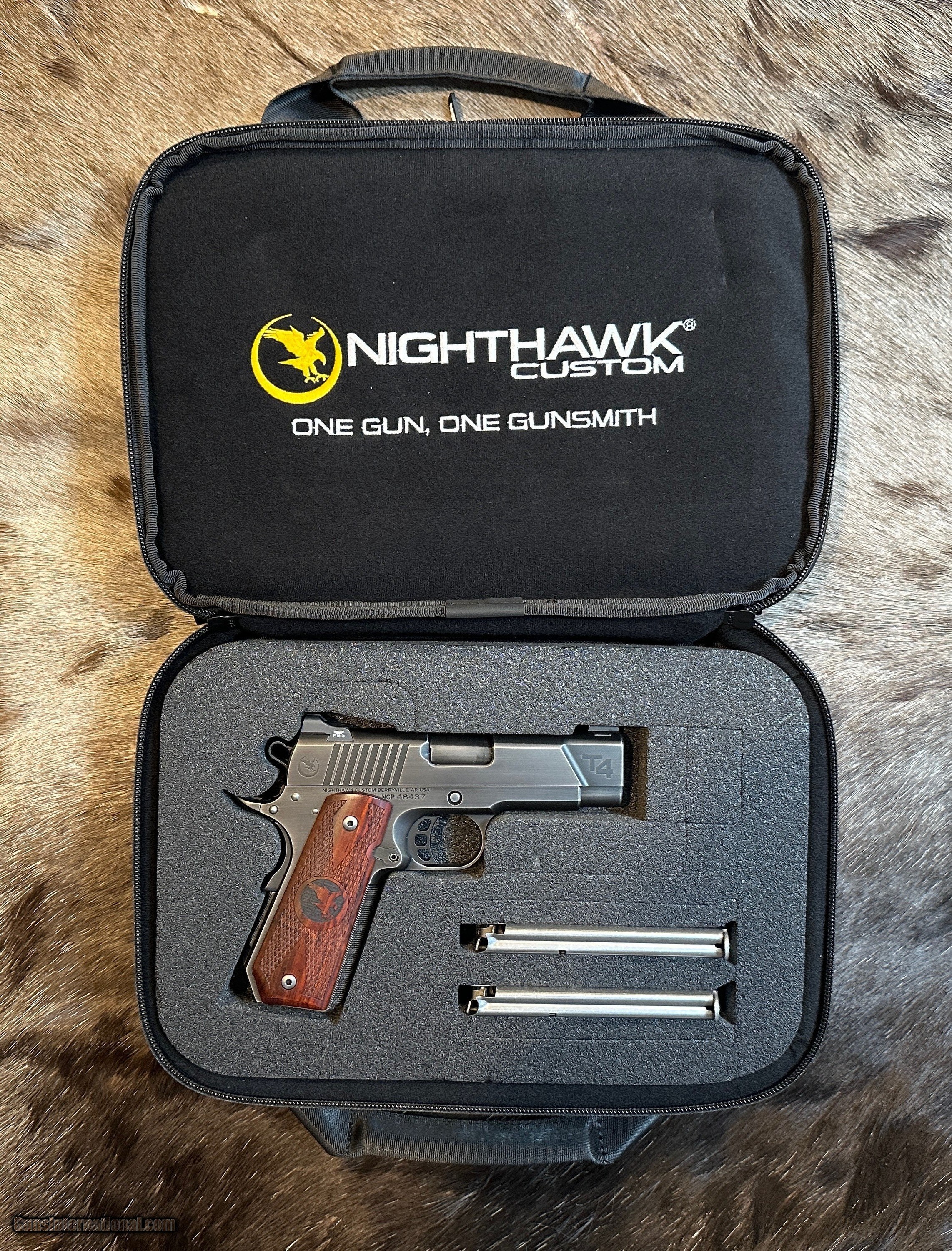 Description: NEW NIGHTHAWK CUSTOM TALON T4 OFFICER 1911 9MM PISTOL W/ UPGRADES - LAYAWAY AVAILABLE The Nighthawk Custom T4 represents a remarkable fusion of compactness, controllability, and capacity, making it an exceptional choice for concealed carry. By incorporating cutting-edge features, Nighthawk has created a pistol that offers the best of both worlds for those seeking a high-performance 1911 carry option. With its 3.8" Nighthawk Custom match grade barrel, the T4 prioritizes reliability without compromising on size. This choice ensures consistent performance while maintaining a compact profile suitable for concealed carry. The utilization of the Nighthawk Everlast Recoil System, tailored to fit the smaller T4 frame, further enhances shooting comfort by reducing felt recoil and minimizing recovery time between shots. The design of the T4 draws inspiration from the acclaimed T3, featuring a thinned frame reminiscent of the popular Lady Hawk model. The proprietary barrel, crowned and recessed with the slide, not only contributes to the pistol's sleek aesthetics but also enhances its functionality. The cuts on the front of the slide serve a dual purpose, reducing weight while adding a distinctive visual flair to the T4. Continuing the trend of ergonomic excellence, the grips on the T4, akin to those on the T3, are thinned to reduce bulk without compromising on handling or control. The Nighthawk Custom T4 stands out as a pinnacle of innovation and craftsmanship, offering concealed carriers an unparalleled blend of reliability, performance, and style in a compact 1911 platform. FEATURES OF THIS GREAT CUSTOM 1911 INCLUDE:
