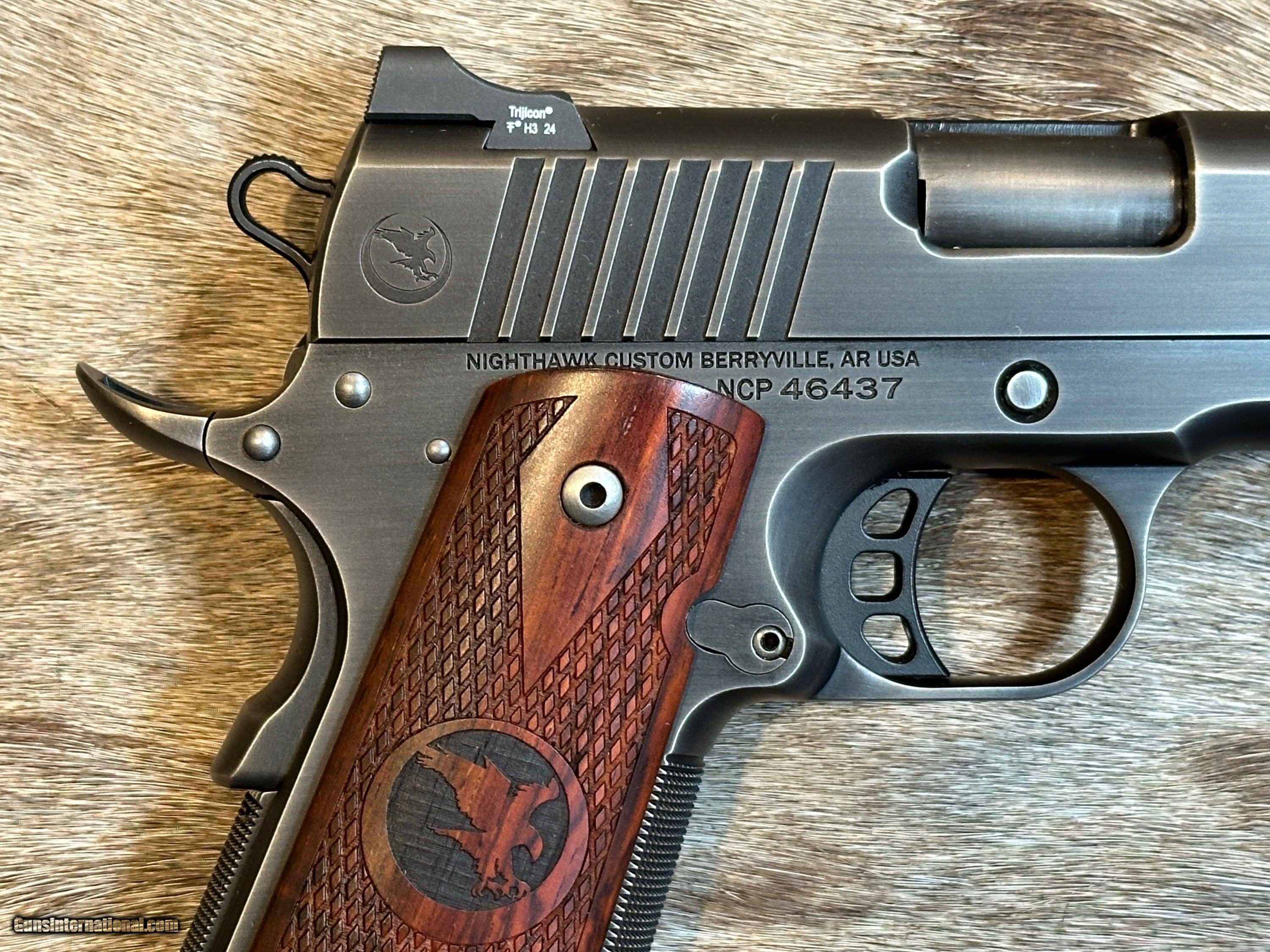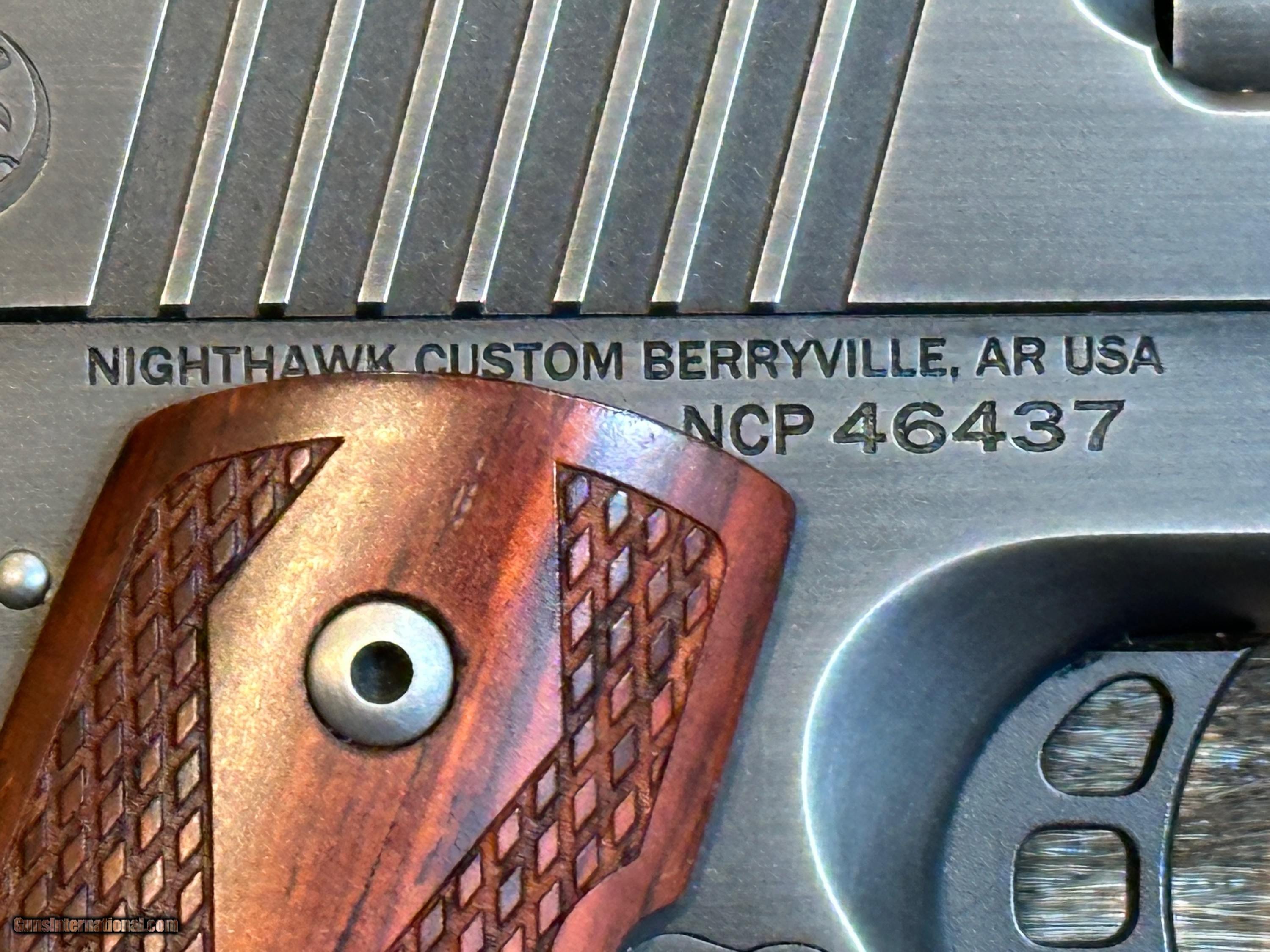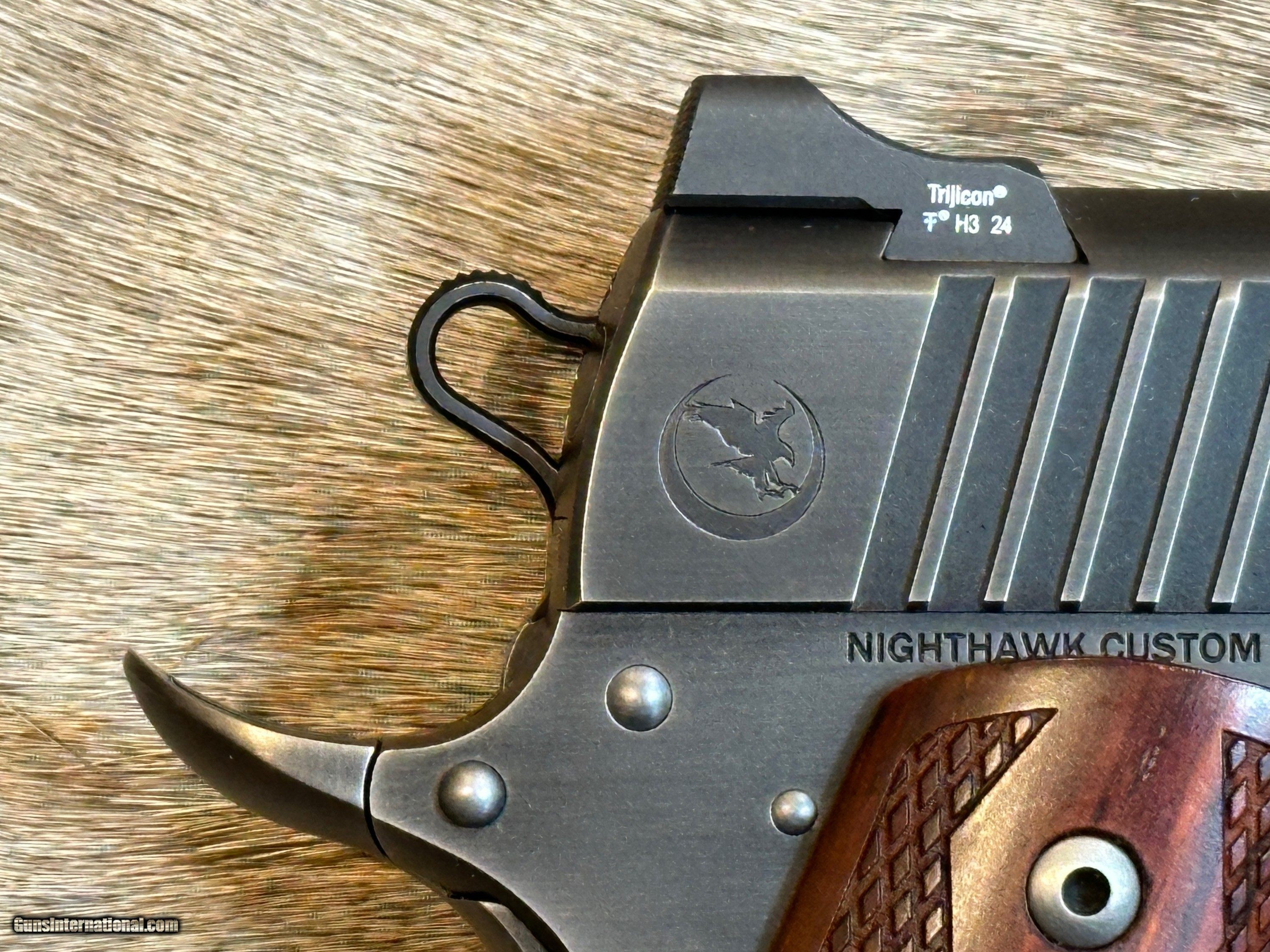 Description: NEW NIGHTHAWK CUSTOM TALON T4 OFFICER 1911 9MM PISTOL W/ UPGRADES - LAYAWAY AVAILABLE The Nighthawk Custom T4 represents a remarkable fusion of compactness, controllability, and capacity, making it an exceptional choice for concealed carry. By incorporating cutting-edge features, Nighthawk has created a pistol that offers the best of both worlds for those seeking a high-performance 1911 carry option. With its 3.8" Nighthawk Custom match grade barrel, the T4 prioritizes reliability without compromising on size. This choice ensures consistent performance while maintaining a compact profile suitable for concealed carry. The utilization of the Nighthawk Everlast Recoil System, tailored to fit the smaller T4 frame, further enhances shooting comfort by reducing felt recoil and minimizing recovery time between shots. The design of the T4 draws inspiration from the acclaimed T3, featuring a thinned frame reminiscent of the popular Lady Hawk model. The proprietary barrel, crowned and recessed with the slide, not only contributes to the pistol's sleek aesthetics but also enhances its functionality. The cuts on the front of the slide serve a dual purpose, reducing weight while adding a distinctive visual flair to the T4. Continuing the trend of ergonomic excellence, the grips on the T4, akin to those on the T3, are thinned to reduce bulk without compromising on handling or control. The Nighthawk Custom T4 stands out as a pinnacle of innovation and craftsmanship, offering concealed carriers an unparalleled blend of reliability, performance, and style in a compact 1911 platform. FEATURES OF THIS GREAT CUSTOM 1911 INCLUDE: