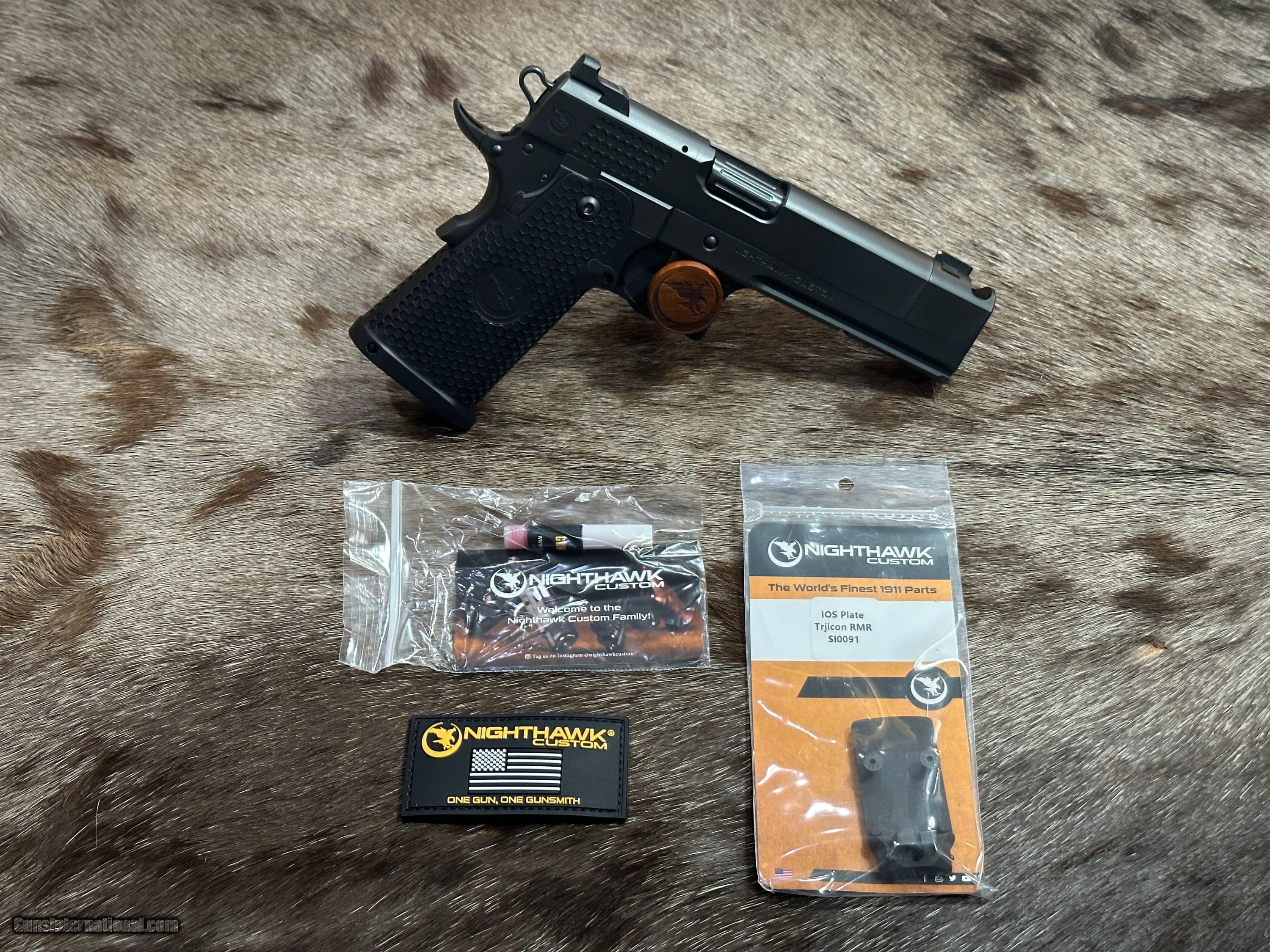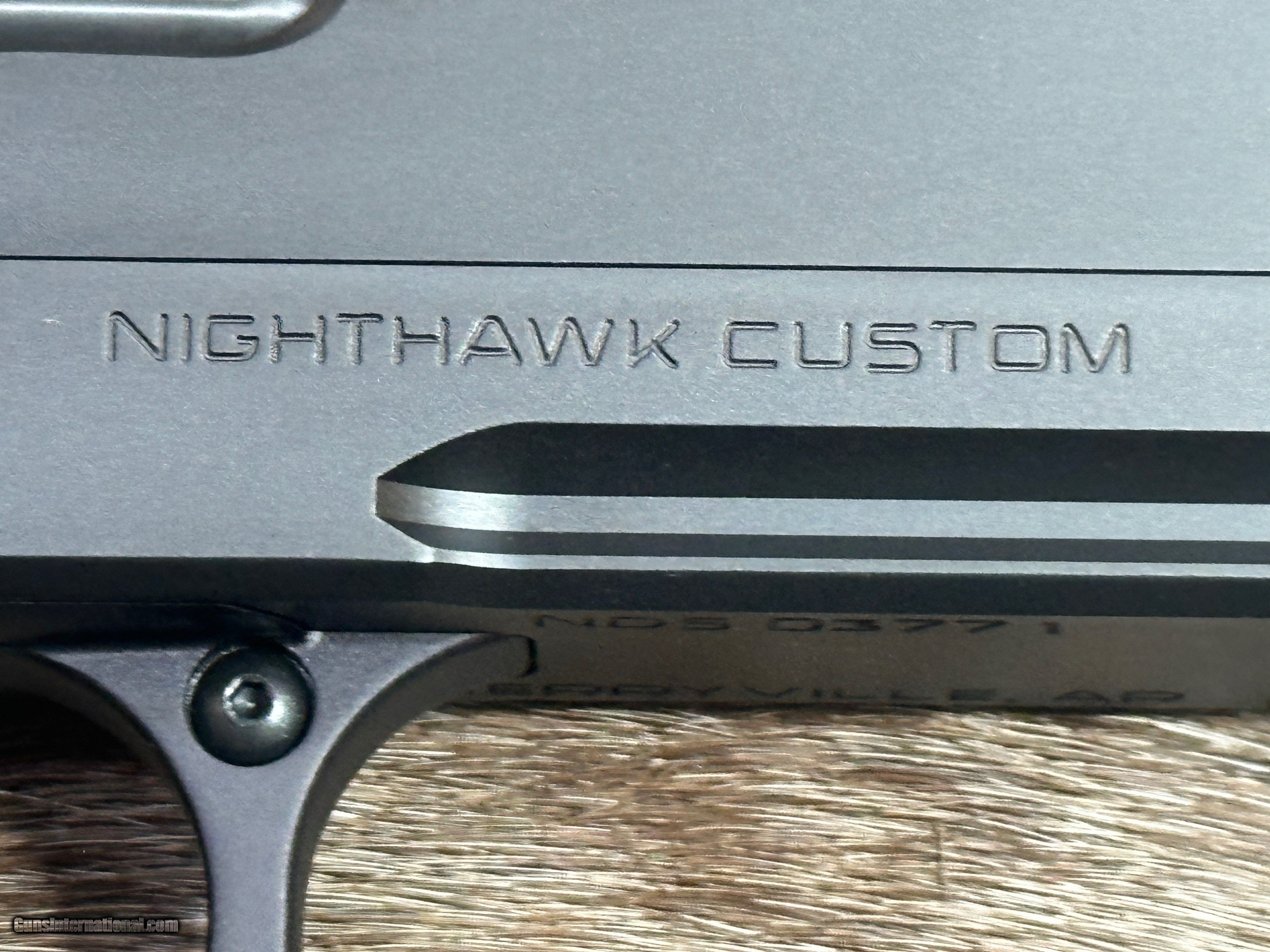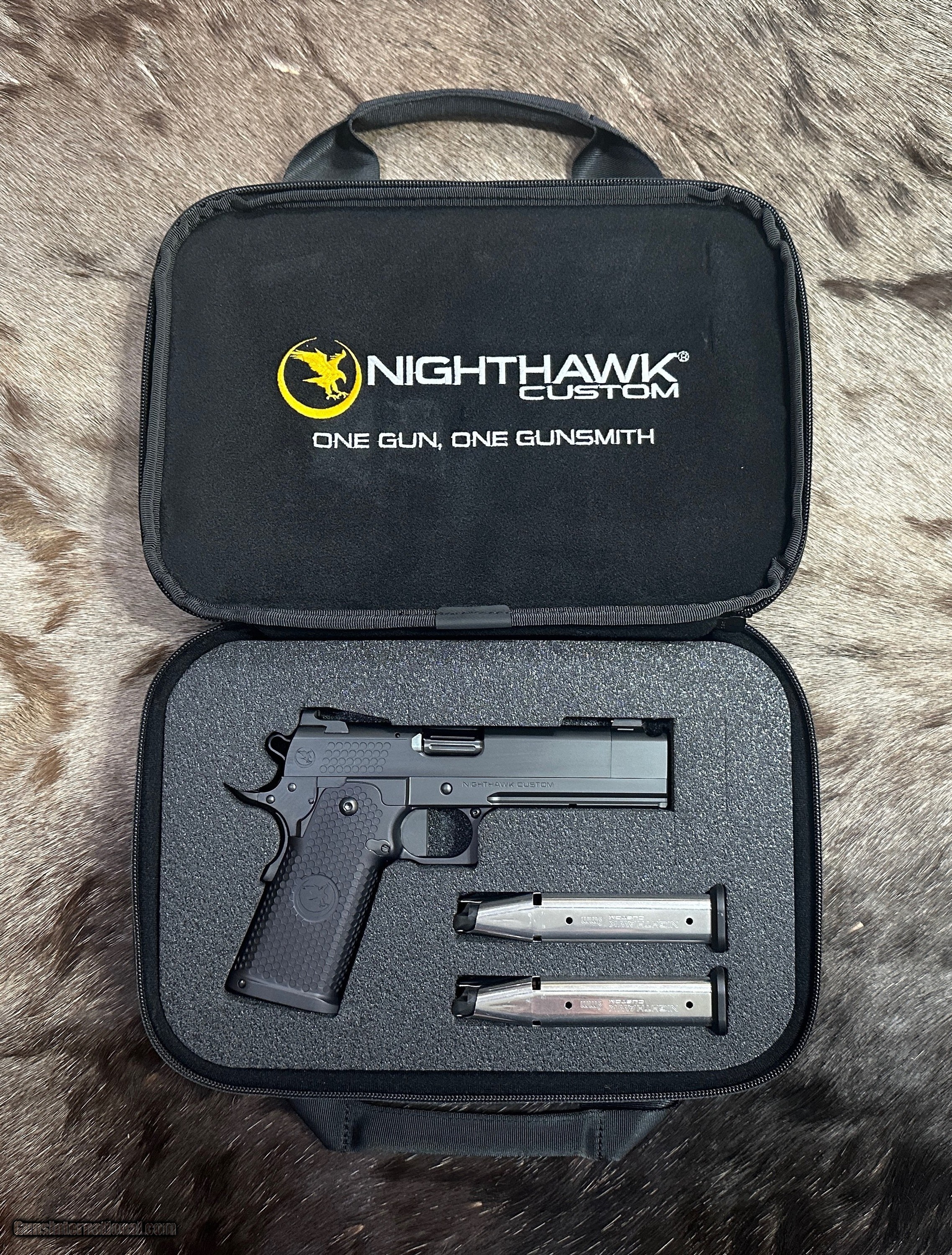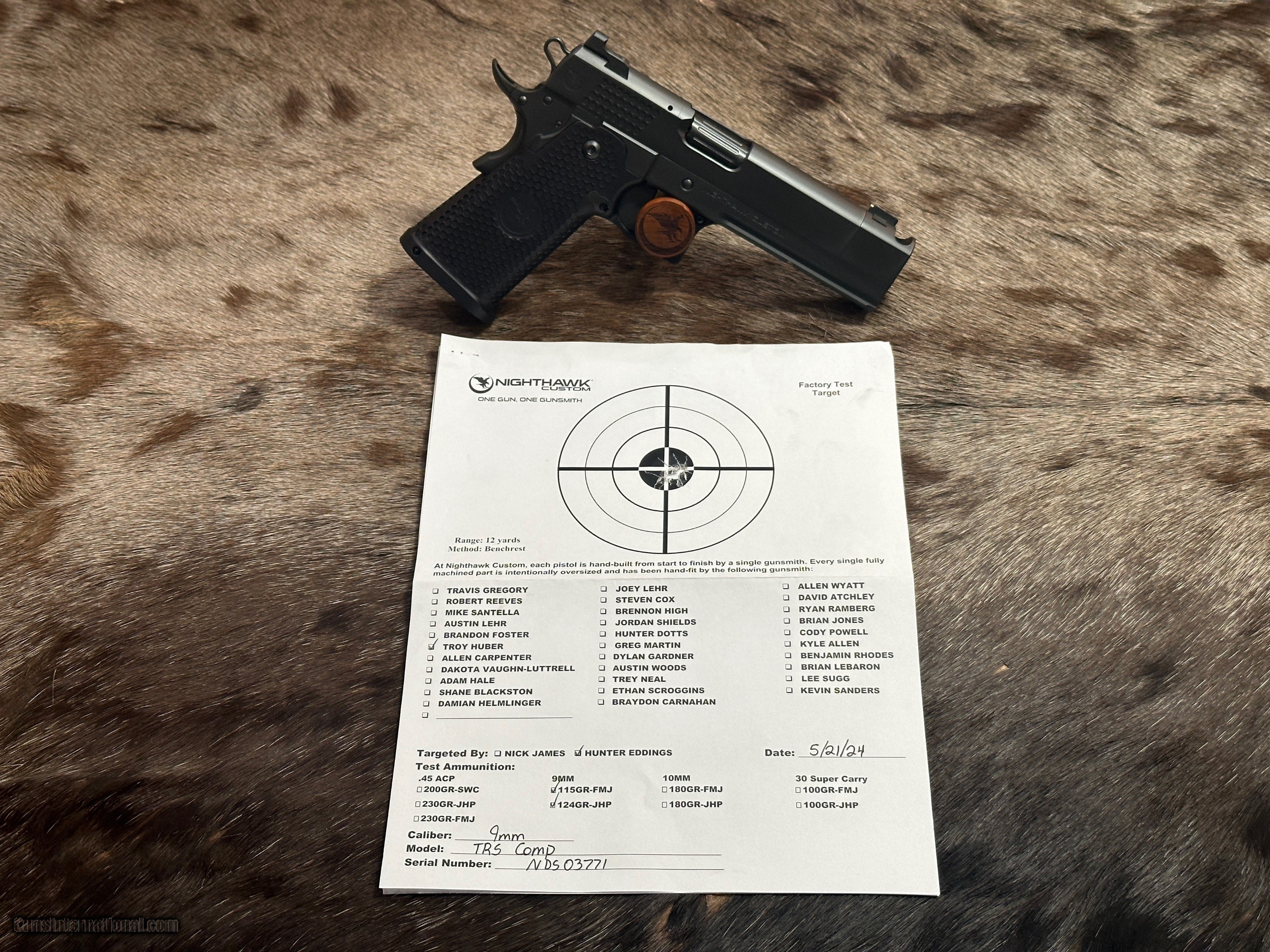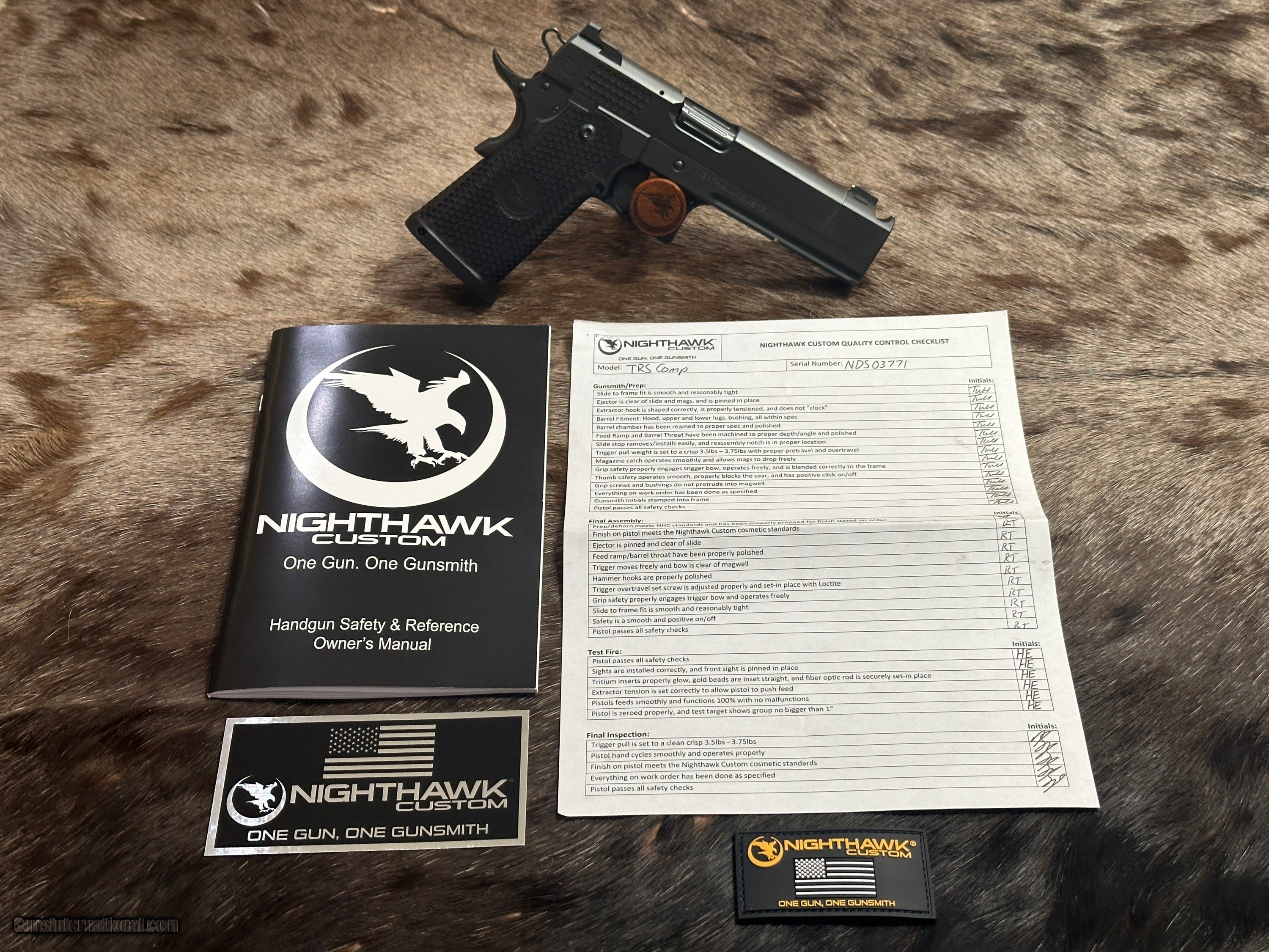Description: NEW NIGHTHAWK CUSTOM TRS COMP DOUBLE STACK 1911 9MM PISTOL WITH IOS AND OTHER UPGRADES - LAYAWAY AVAILABLE The TRS Comp from Nighthawk Custom marks a groundbreaking addition to the Tactical Ready Series, designed to meet the demand for high-capacity 1911 pistols while offering innovative features tailored for superior performance on the range. As Nighthawk Custom's first model built around a double stack frame, the TRS Comp boasts an impressive 17+1 capacity, providing shooters with ample firepower for extended shooting sessions. One of the standout features of the TRS Comp is its integrated compensator, a design inspired by the popular Fire Hawk model. This precision-engineered compensator effectively reduces muzzle flip, allowing shooters to stay on target for rapid follow-up shots with unparalleled accuracy. Built on a government-sized frame with a match-grade 5" barrel and monolithic slide, the TRS Comp features a full-length dust cover that adds weight to the front of the pistol, further aiding in reducing muzzle flip and enhancing control during firing. Finished in black nitride for durability and a sleek appearance, the TRS Comp exudes a sense of reliability and resilience. The lightweight aluminum trigger, with its serrated flat face, ensures a secure grip for consistent and precise trigger pulls. For rapid target acquisition, the TRS Comp is equipped with a 14K gold bead front sight that catches light effectively, paired with a Heinie Ledge Black rear sight for optimal sight picture alignment. The pistol's unique dimples at the rear of the slide, matching the pattern of the grip, provide a non-abrasive surface that won't snag clothing when holstering, adding to the pistol's practicality and user-friendliness. The TRS Comp combines high capacity with innovation to offer shooters an unrivaled experience at the range. With its integrated compensator, precision engineering, and ergonomic design, the TRS Comp sets a new standard for high-performance 1911 pistols in the Tactical Ready Series. FEATURES OF THIS GREAT CUSTOM 1911 INCLUDE: