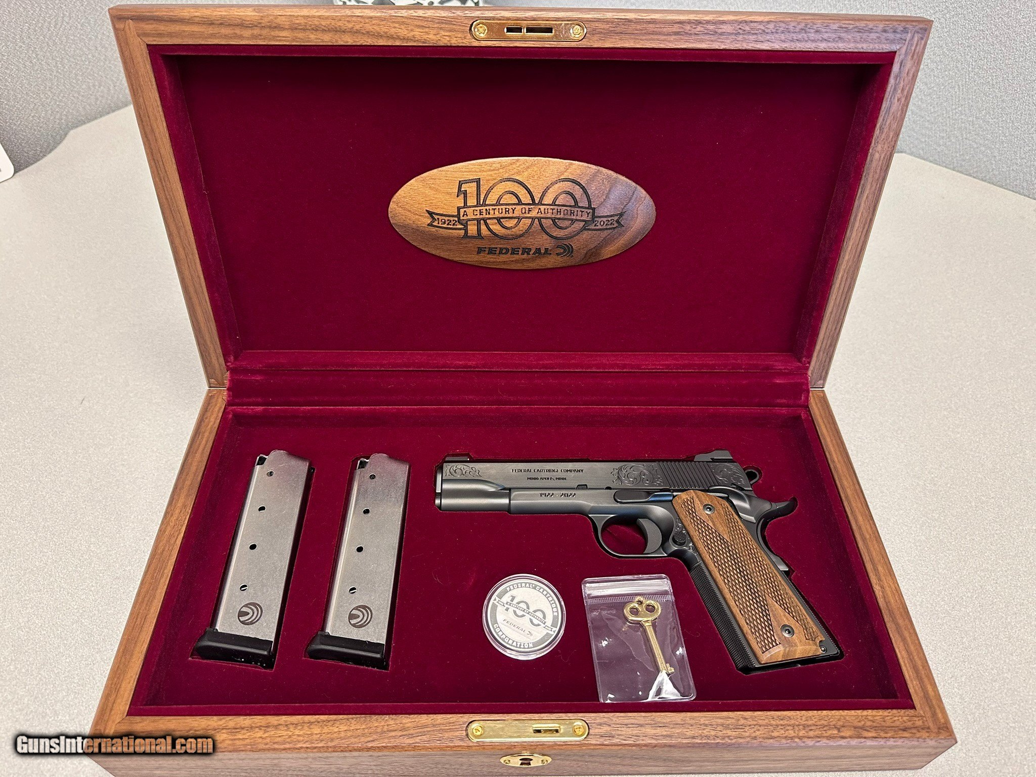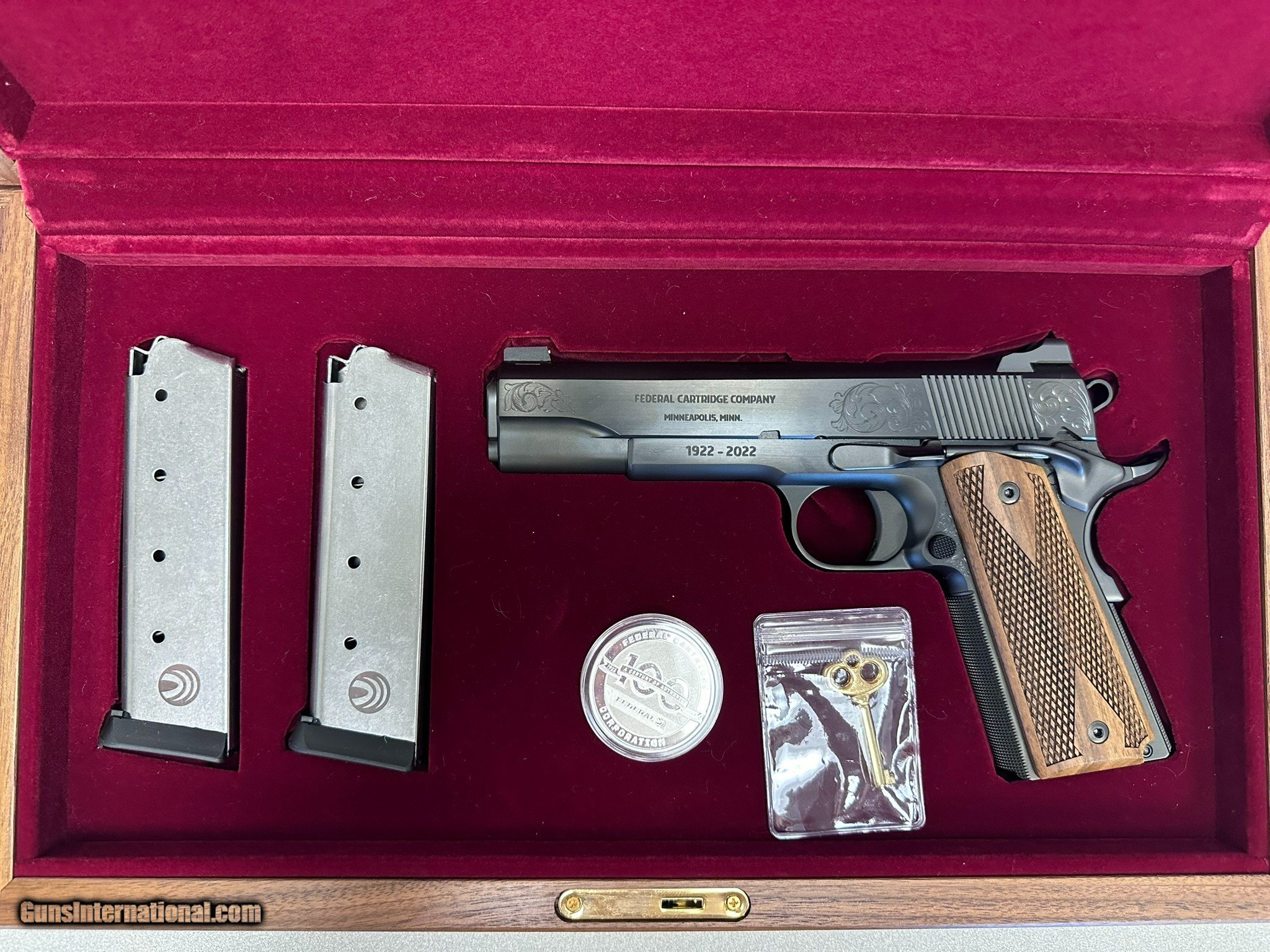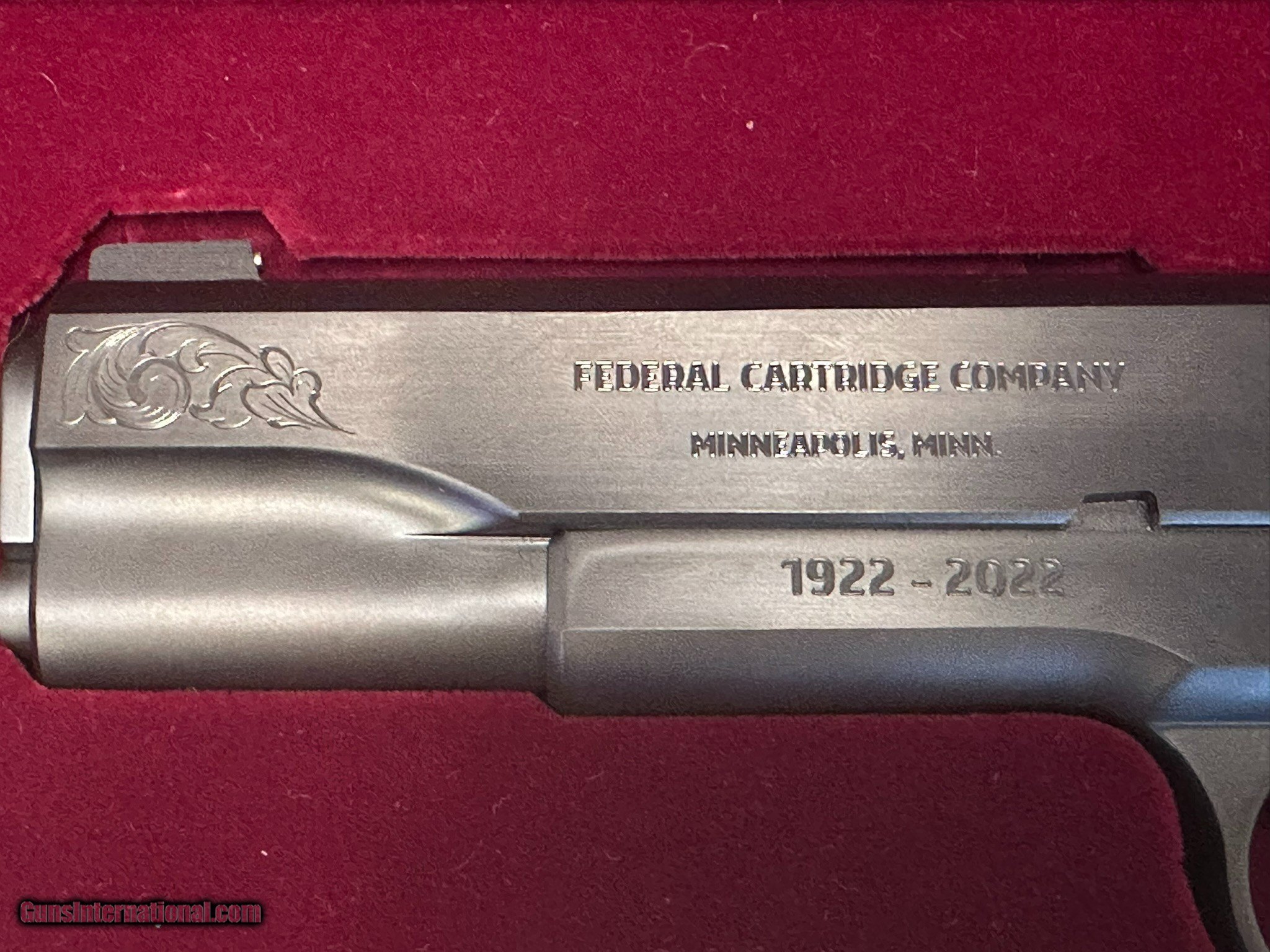 Description: Nighthawk Custom is honored to build a special limited edition 1911 to commemorate Federal Ammunition’s 100th anniversary. Federal is a manufacturer and innovator of the highest quality ammunition for more than a century now, and these commemorative pistols are a testament to the quality Federal has maintained. A limited run of 100 pistols were custom designed and hand built by Nighthawk Custom in collaboration with Federal. Each of these magnificent pistols features Federal’s laser engraving and “1922-2022” dates, and custom machine engraving to celebrate this historic milestone in Federal’s incredible legacy.