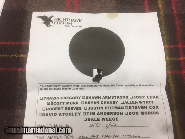 Description: 99.9% 5 INCH BARRELED 45ACP NIGHTHAWK CUSTOM PISTOL, 2 8RD NIGHTHAWK MAGS, NIGHTHAWK BUSHING WRENCH, ALL FACTORY PAPERWORK AND TARGET, FACTORY NIGHTHAWK RANGE BAG, FACTORY FIGURE 8 NIGHT SIGHTS, GUN HAS BEEN FIRED BUT DOES NOT SHOW IT AT ALL, CARDS PLEASE ADD 3% SHIPS TO FFL SOLD Handgun Caliber: .45 ACP (.45 Auto) |