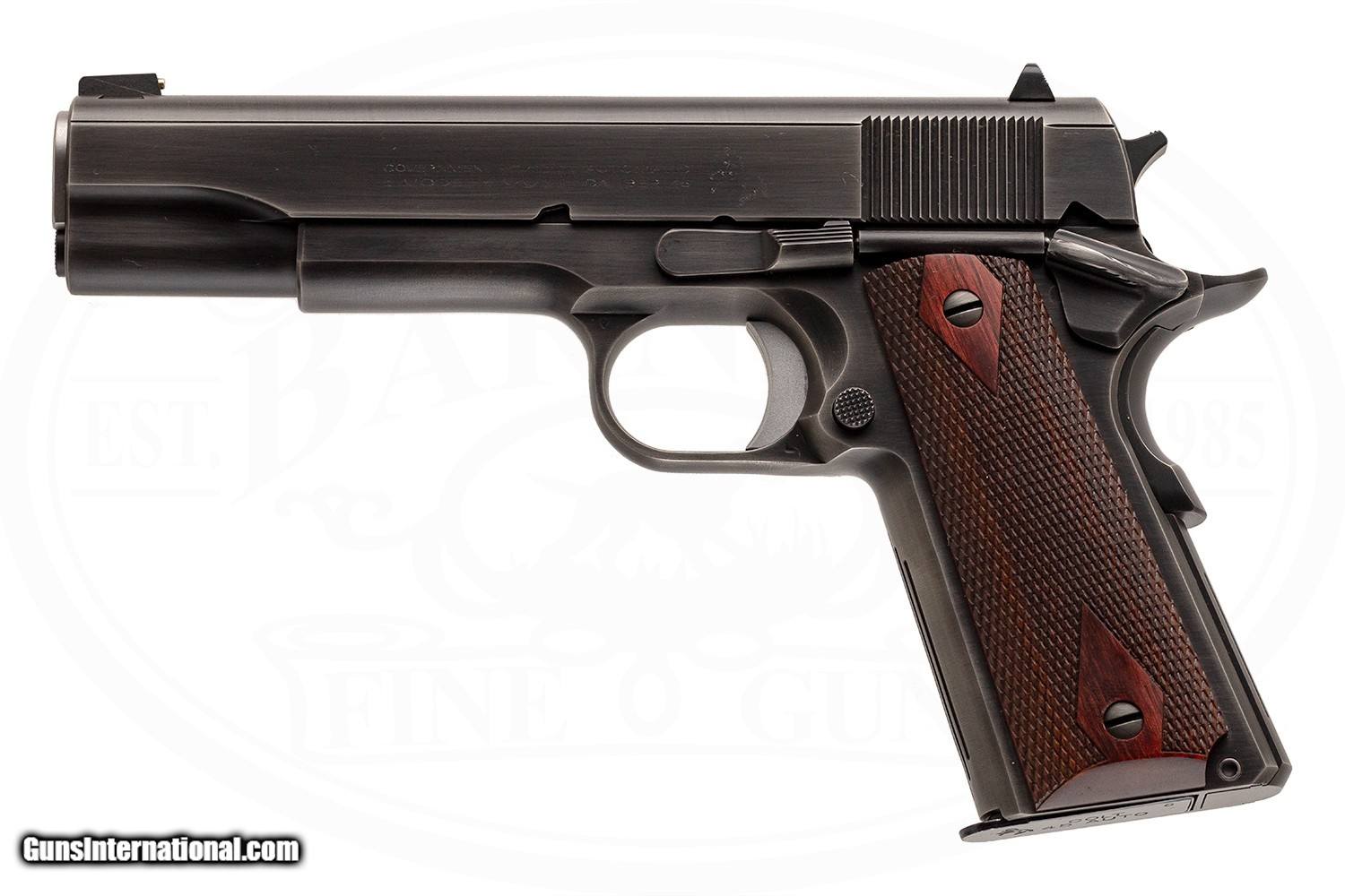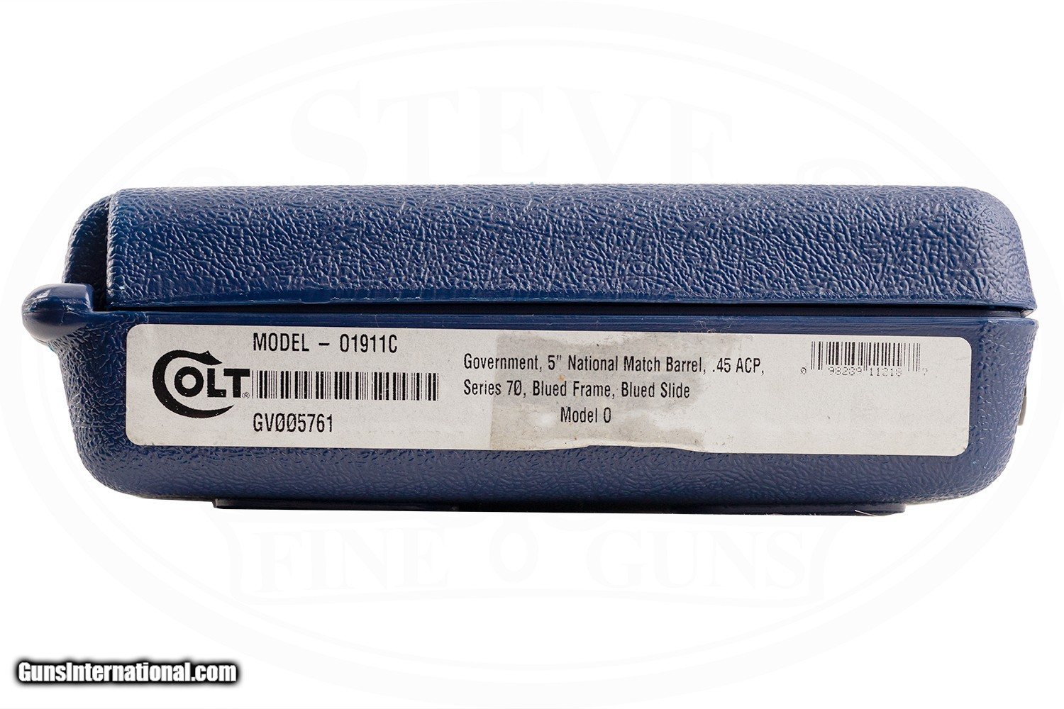 Description: SN# GV005XXX AGED WORN FINISH - DISCONTINUED 5" COLT NATIONAL MATCH BARREL GOLD DONT FRONT SIGHT VERTICAL GROOVED FRONT AND BACK STRAPS LIKE NEW CONDITION MATCHING COLT FACTORY BOX - NO PAPERWORK 2 COLT MAGAZINES SOLD |