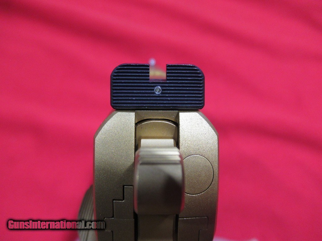 Description: Nighthawk Custom Delegate with special order Gold Nitride finish. This pistol is all steel and built on a commander frame, flush fit magwell, G10 black grips, crowned bull barrel, bull nose, single sided safety, Heini straight eight ledge night sights. Comes with the factory case and accessories. SOLD |