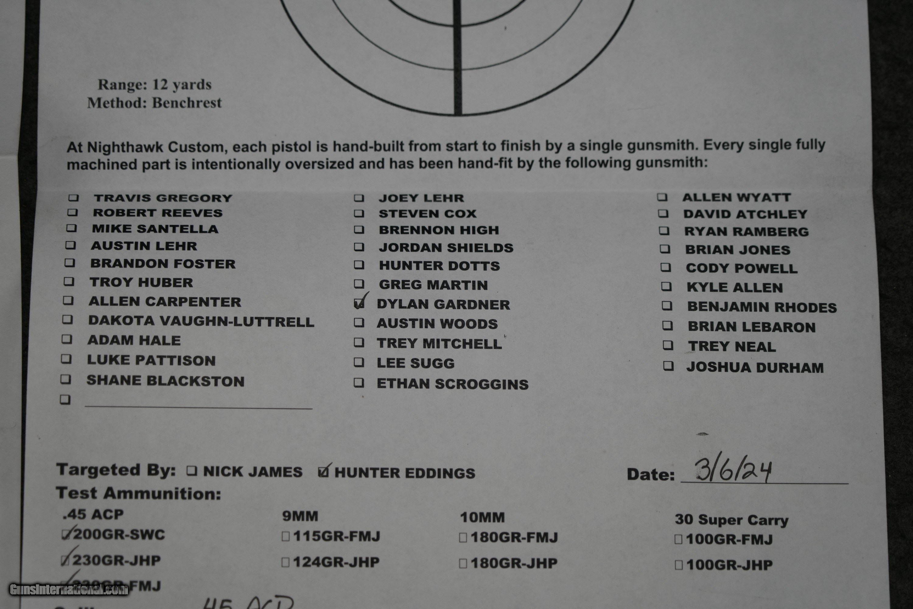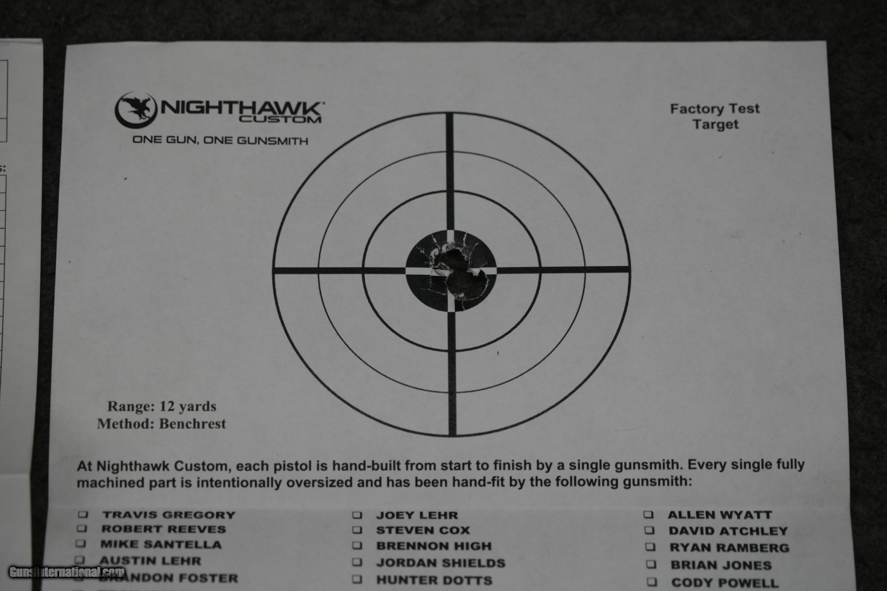 Description: *NOTE: The firearm pictured is the ACTUAL gun for sale! All images are of the ACTUAL item, unless specified otherwise. The item seen is the item you will receive. * This cutting edge offering from Nighthawk Custom is the next advancement in our long line of purpose-built innovation. By utilizing the meticulously designed single-port compensator, recoil is tamed and muzzle rise is reduced. The Fire Hawk features a bull barrel and full-length guide rod. Using a commander length spring and reverse plug, Nighthawk Custom has maintained the standard stroke of a 5-inch 1911 for reliability. The lightened slide reduces reciprocating mass and delivers flat shooting performance without increasing the size of the pistol. A French border ties together both the slide and the compensator for a seamless look, while the one-piece magwell allows for smoother reloads. The compensator is bull nosed to allow for a cleaner draw and re-holster while still maintaining an edgy, aggressive look. The traditionally styled Fire Hawk boasts an upper hand in performance, all while delivering the classic look that you have come to know and expect from Nighthawk Custom. FEATURES: Black DLC finish Forged government size frame and 5" barrel Hand fit frame and slide Hand fit match grade .45 ACP barrel Throated barrel Polished feed ramp 14k Gold bead front sight Solid black Heinie ledge rear sight One-piece magwell/mainspring housing Hand blended magwell Hand blended grip safety Coarse rear cocking serrations French border Serrated rear of slide Beveled and recessed slide stop Tuned and polished extractor Hand fit firing pin stop Medium solid curved trigger Hand polished ignition components Custom trigger job set with 3.5 to 3.75 pound trigger Railscales Ascend grips Completely dehorned for comfortable carry Hand beveled edges Ultra Hi-Cut Front Strap Includes two 8-round magazines IOS Optic System w/ RMR plate Fluted Barrel Hood CALIBER .45 ACP LIGHT RAIL NO RAIL SAFETY SINGLE HEIGHT 5.6" OVERALL LENGTH 8.47" PISTOL WIDTH 1.30" SLIDE WIDTH 0.92" GRIP THICKNESS REGULAR WEIGHT EMPTY 44.2 OZ SIGHT RADIUS 6.07" BARREL LENGTH 5" MAGAZINE CAPACITY 8 REAR SIGHT HEINIE BLACK SLANT PRO FRONT SIGHT GOLD BEAD FINISH BLACK NITRIDE FIRING PIN SIZE .38 SUPER FIRING PIN MATERIAL STAINLESS STEEL SOLD Handgun Caliber: .45 ACP (.45 Auto) Manufacturer: Nighthawk Custom Model: Firehawk Barrel Length: 5" Barrel Condition: BRAND NEW |