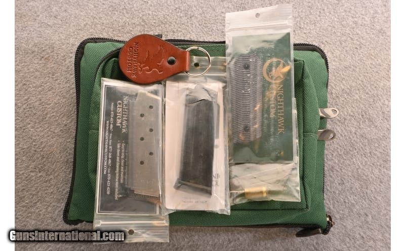 Description: A Nighthawk Custom Predator III in .45 ACP with a 4 1/4 inch bushing-less barrel, in two-tone. .45 ACP SOLD Metal Condition: Excellent with light wear Wood Condition: Excellent with light wear Bore Condition: Brigth and Shiny Barrels: 4 1/4 inch Triggers: Single action auto Weight: 2 lbs Sights: 3-dot tritium night sights Item Location: Gonzales, LA |