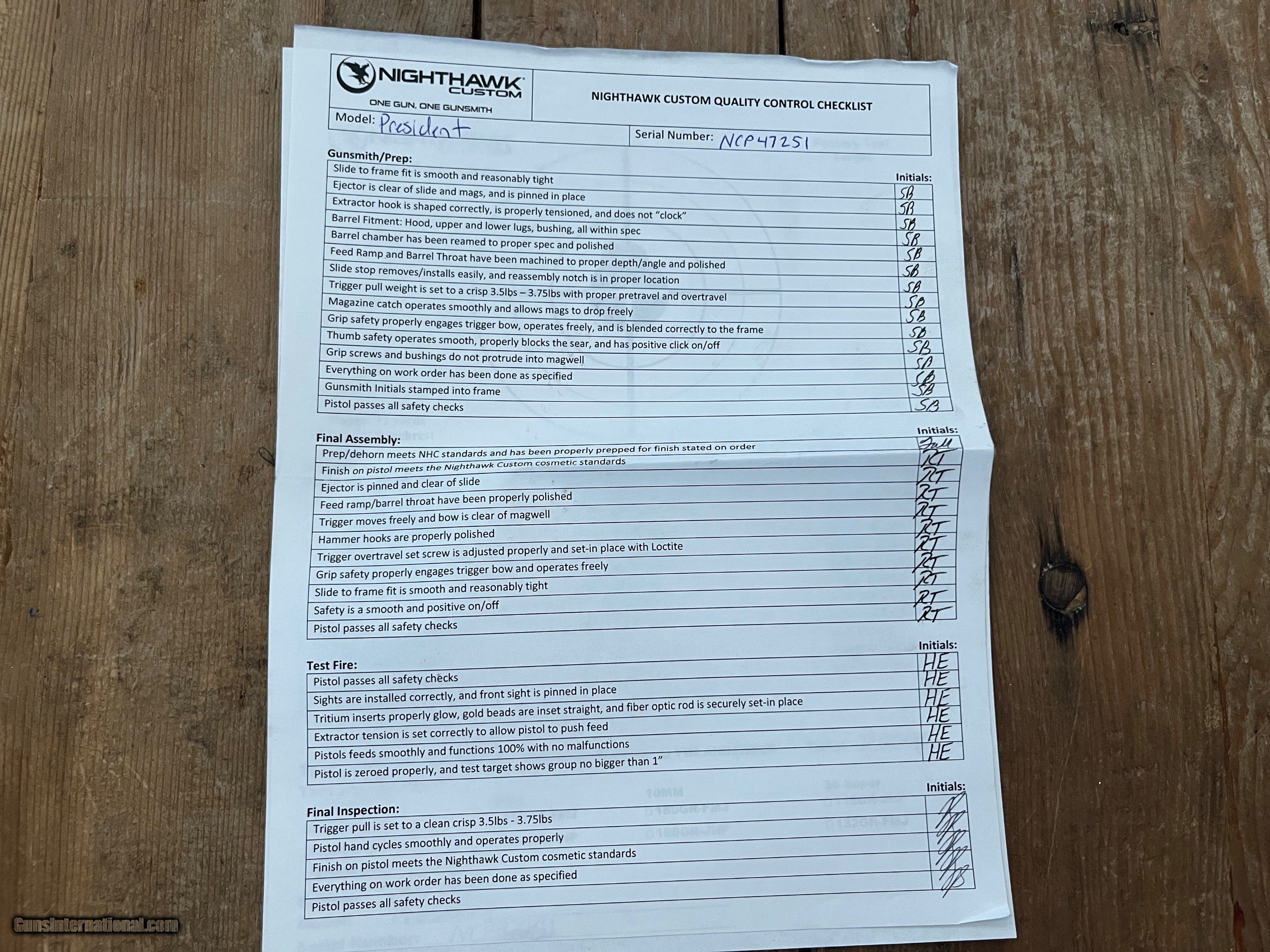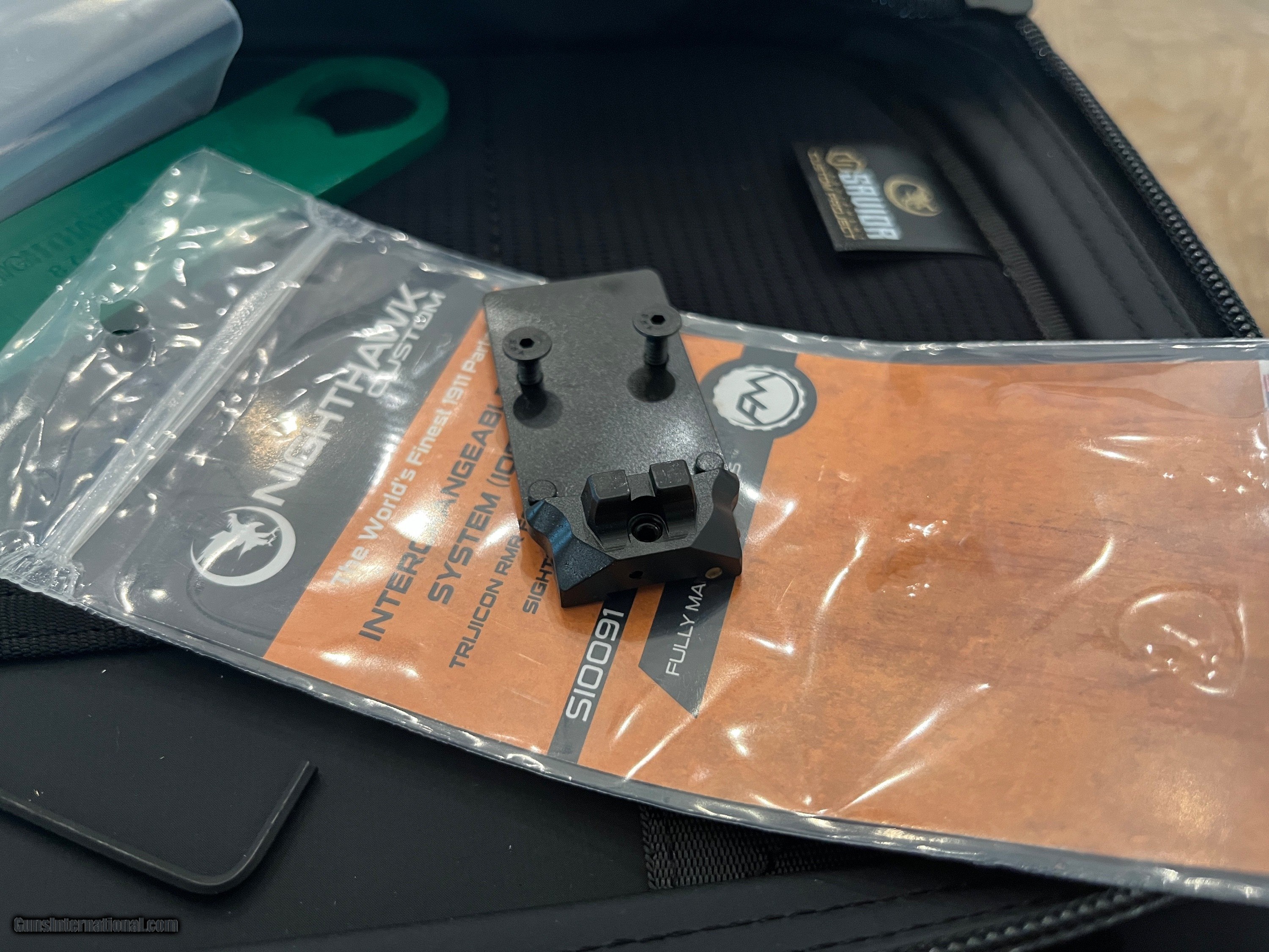 Description: For sale is a brand new Nighthawk Custom President chambered in 45 ACP. The pistol has the upgraded IOS system which allows a red dot of your choice to be put on. The pistol is also upgraded with ambi safety and Nighthawk everlast recoil system which allows the gun to be shot 15,000 plus rounds without replacing springs. Having racked the slide and dry fired the gun, this is one of the tightest crispest pistols I have felt come through the shop. Open to trades plus cash. Trades would have to be other 1911s or Colt pistols. Price is as follows: Base Pistol: $4,599 Plus IOS Sight Upgrade $500 Ambi Safety $120 Everlast Recoil System $50 Total $5,270 SOLD Handgun Caliber: .45 ACP (.45 Auto) Manufacturer: Nighthawk Custom Model: President |