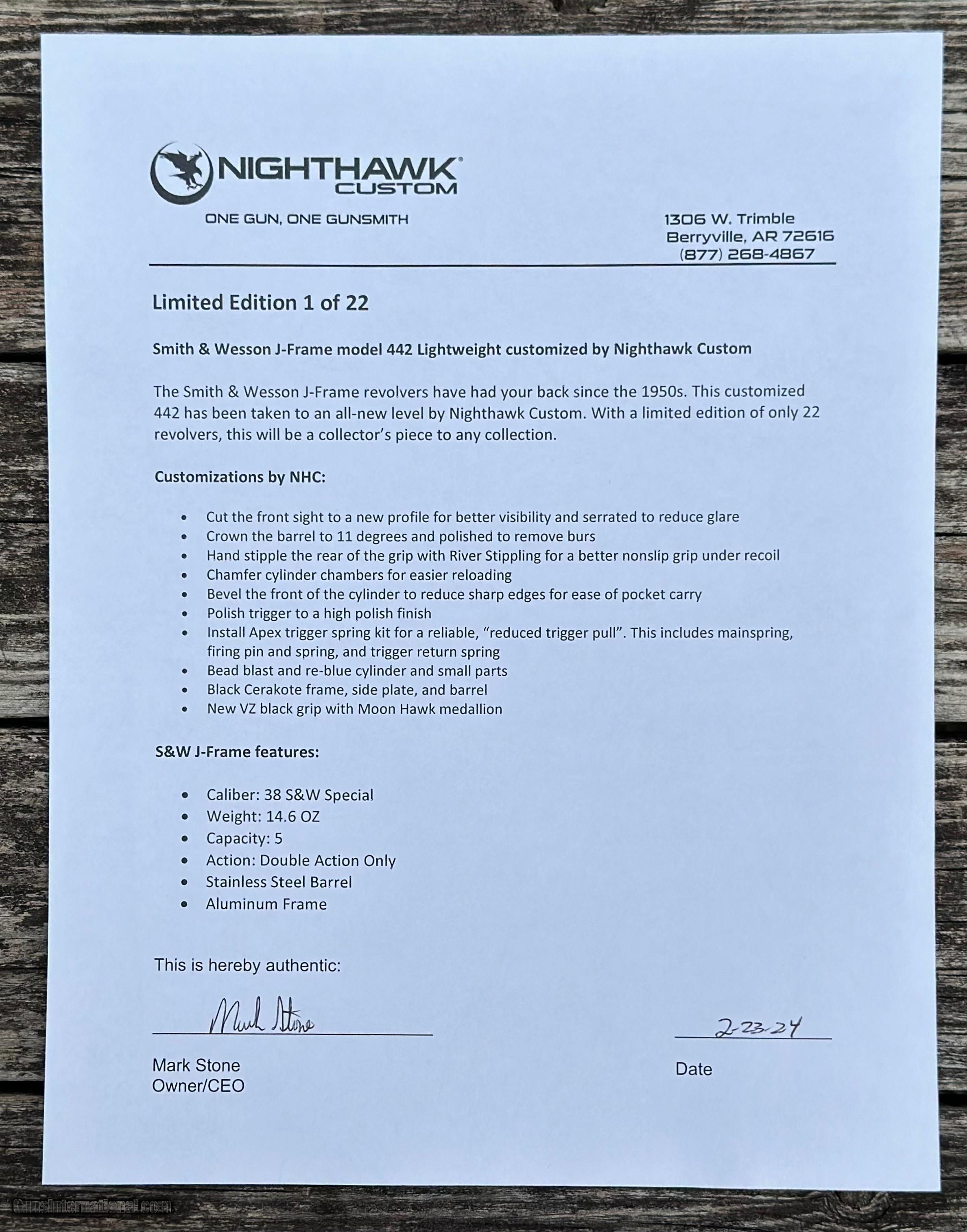 Description: Nighthawk Custom Smith & Wesson 442 38 Spl 5 Shot J-Frame Limited 1 of 22 - Factory New SOLD |