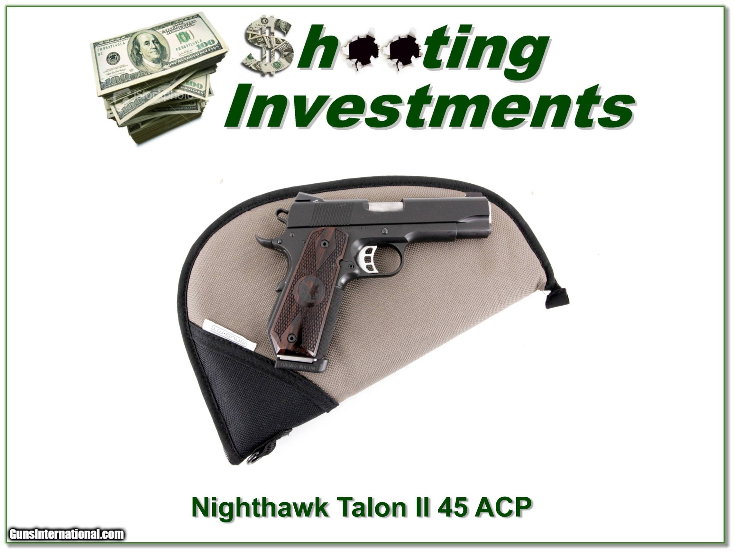 Description: This is an excellent condition NightHawk Custom Talon II in 45 ACP. It has light use from it’s one owner. I am selling this one on consignment and as such lay-a-way can’t be used. It does of course have the standard 3-day inspection. Shipping with insurance is $39. Please email me with any questions or larger pictures. (Consign your quality firearms with Shooting Investments for only 12%! Let me know if you have any you would like to sell!) 18-1235 Payment: Payment is by Money Order, Cashiers Check or Personal Check. I can now also accept MasterCard and Visa with a 3% convenience fee. PayPal can be used for some items but never firearms. Please let us know if you would like to pay via PayPal. Shipping: The shipping charge will be listed in each description. It is $39 for most long guns and $29 for most handguns. Some heavy guns or those insured for over $2000 will be higher. Shipments to Alaska and Hawaii are higher because air shipment is required. Most firearms are shipped on Tuesday and Thursday and usually in 5 days of receipt of payment. We package all shipments carefully and insure them. For long guns you can purchase a new Plano case for $19. They now cost us $22 when buying 100 at a time. Optics are shipped Priority Mail and most other non-firearm shipments are shipped First Class. Returns: Our return policy is simple. If for any reason you are not pleased with your purchase, you may return your item for a full refund of purchase price. Ammunition cannot be returned. It is important to us that you are happy. Guns cannot be fired or dissembled before returning them and they must be returned in the same condition as received. Notification of a return must occur with-in 3 days of receipt at your dealer. Shipping, convenience and dealer fees are not refundable and are the responsibility of the buyer. Lay-a-way: If needed, we offer a 60 day lay-a-way option on most firearms. It is 1/3 now, 1/3 in 30 days and 1/3 in 60 days. Lay-a-way firearm sales are final and if not completed the first payment cannot be returned. Consigning your firearms with Shooting Investments: We will help you get top dollar for your firearms. While most local guns shops charge 20% or more, our fee is only 12% with a minimum of $75. At your local gun shop it might take months to sell. Selling on-line provides instant access to thousands of interested buyers. You won’t find any other on-line dealer willing to sell your firearms for only 12% or listing every gun on 3 separate s. Selling through an House typically costs the seller 15% and the buyer an addition 15% (so 30%) and you have to wait several months to sell and longer to receive funds. If properly priced, we will sell your firearms in a few weeks. Send us an email or give us a call and we’ll explain how easy it is for you to get top dollar. Trading: Trading for use is really just buying your gun to re-sell. If you have a gun you want to trade, please email a picture and we will let you know what we can give or it. You will always get more if we sell it for you on consignment. Help for California Buyers: We are happy to ship to California. It is the buyer’s responsibility to make sure any item you buy is legal in your state. We are also happy to help with your purchase of a firearm from someone other than us. If you see a gun you would like to buy but the seller can’t or won’t ship to California they can ship to use and we’ll then ship it to your California dealer. The cost for this service is only $30 + shipping. Let us know if we can help! SOLD |