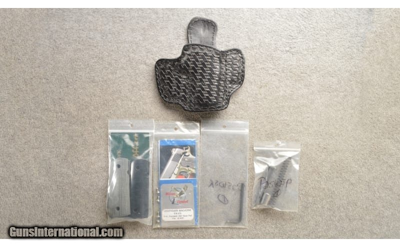 Description: Excellent condition Nighthawk Talon IV chambered in 45 ACP. This gun features a two-tone grey / black finish and a 3.5" barrel. The sights are Novak night sights. With a single tritium lamp in the front blade and two lamps in the Novak's square-notch rear sight. Both sights are dovetailed to the slide, the rear sight is screw-set. The top of the slide is serrated. The grips are checkered black metal panels. Comes with a Nighthawk soft case made by Bulldog with 6 magazines, Nighthawk leather holster, extra grip panels, extra screws, owners manual and extra recoil system parts. .45 Auto SOLD Chambers: 7+1 semi auto. Metal Condition: "Excellent, showing light exterior holster wear with normal operational wear on the barrel. Wood Condition: The metal grips attached to the gun are in near new condition. Bore Condition: Bright strong bore. Barrels: 3.5" barrel. Triggers: Single action trigger. Weight: 2.75 lbs Item Location: Owatonna, MN |