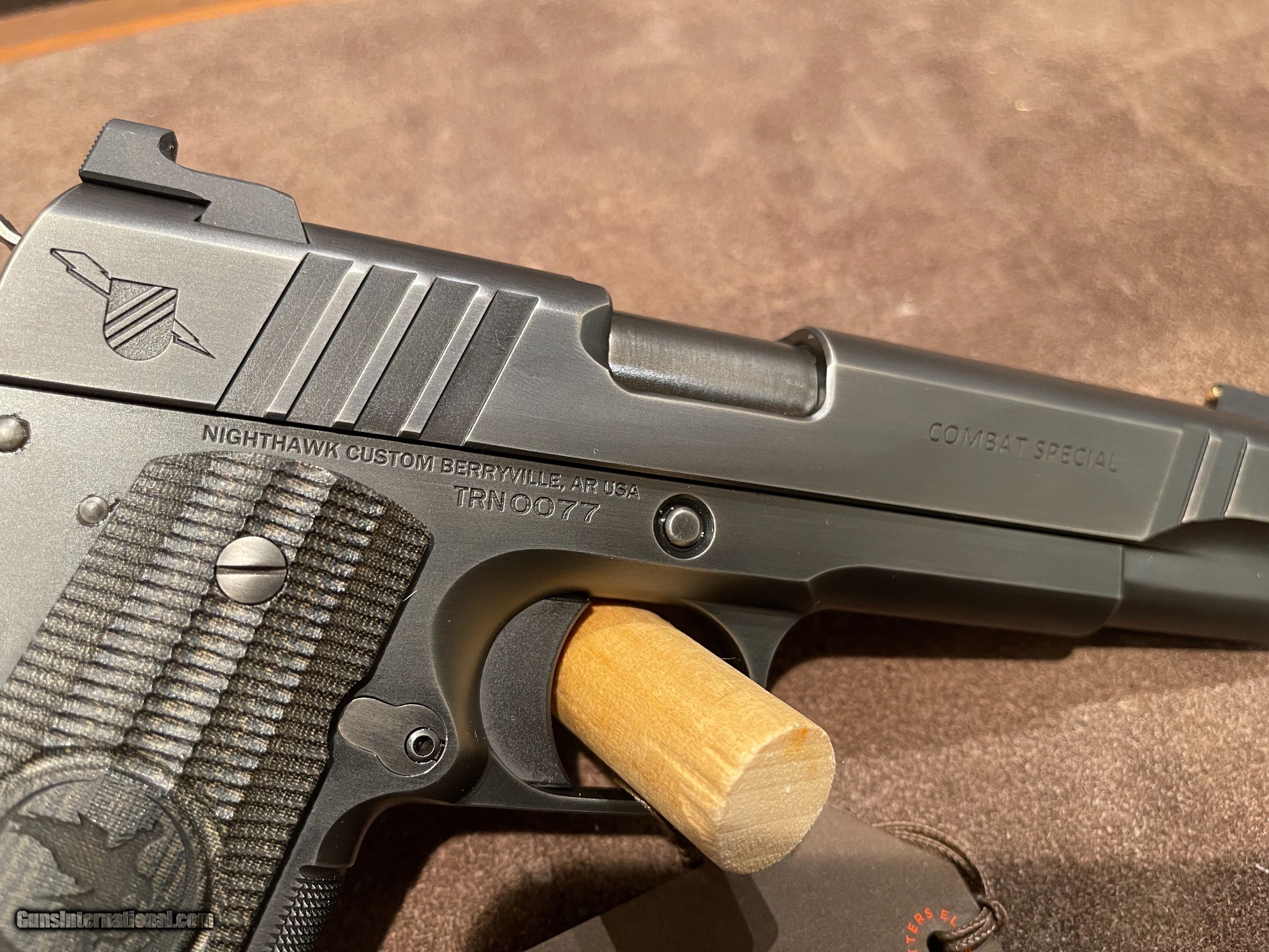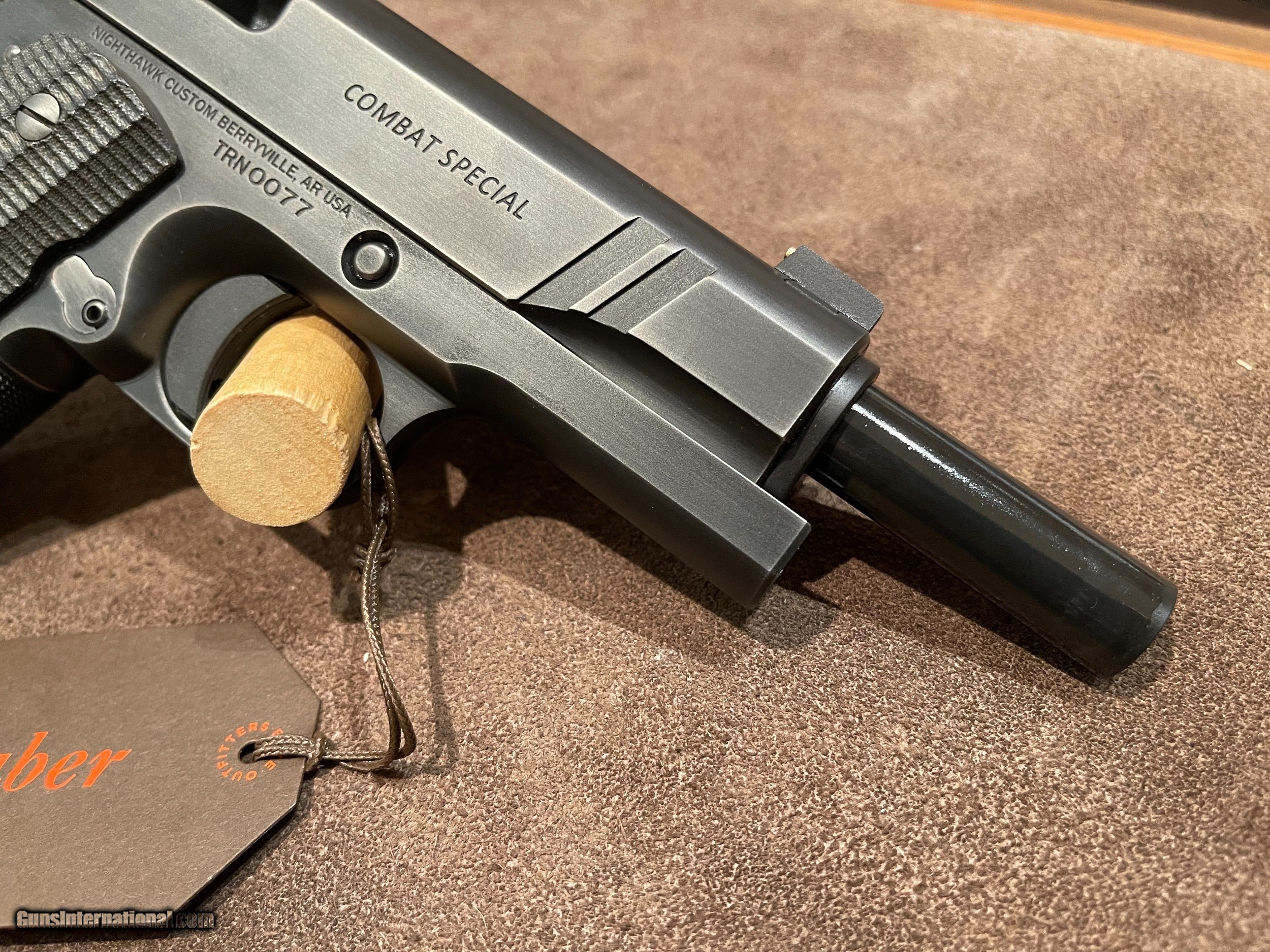 Description: The Nighthawk Custom Thunder Ranch Combat Special is a unique collaboration between two legendary companies in the firearms industry. Nighthawk Custom is well known for building the finest 1911 pistols, using our “One Gun, One Gunsmith” approach that means each gun is built start to finish by a single gunsmith. Thunder Ranch, led by Clint Smith, has been the premier facility for all types of firearms training for over 25 years. Smith, a 1911 expert, selected Nighthawk Custom to build his ideal pistol. After multiple discussions and prototypes, Smith finalized this design as his ultimate version of a handgun. This model features newly designed front and rear cocking serrations, a lanyard loop mainspring housing, a “GI-Style” nub thumb safety, custom engraving, and a gold bead front sight. The gun is finished with a unique Smoked Nitride finish and green linen/micarta scale grips. FEATURES: