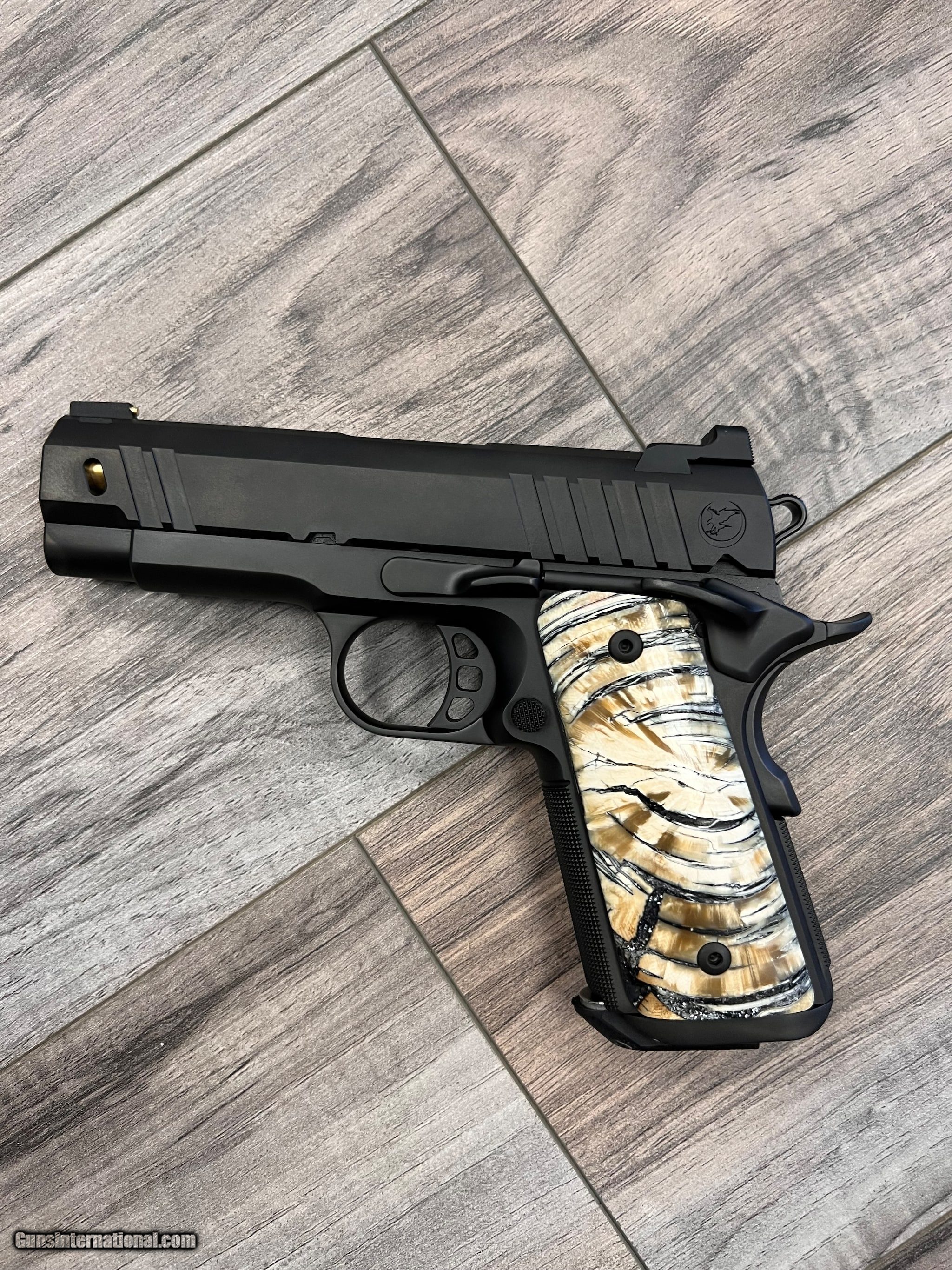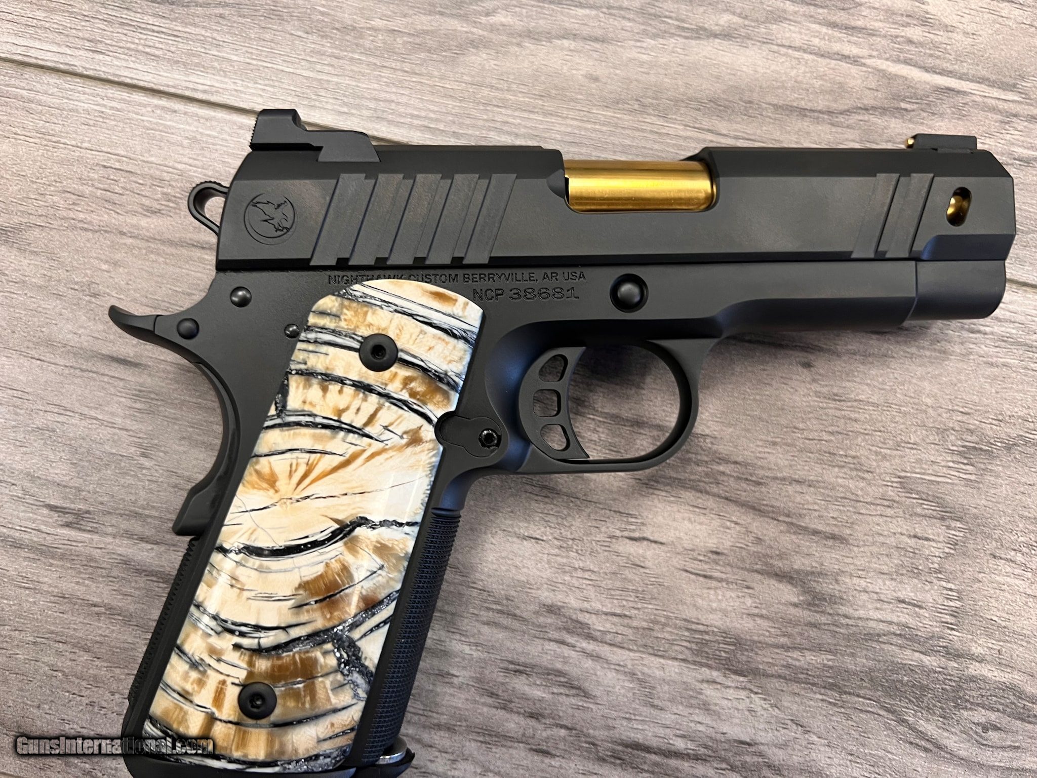 Description: Guns Listing ID: 1090820 Never Fired **Custom Mammoth Ivory Grips (1000.00 value) DLC finish with gold titanium nitride barrel Forged officer size frame and 3.8\" bull barrel Hand fit frame and slide Hand fit match grade 9mm barrel Crowned barrel flush with bushing Heinie Ledge solid black rear sight 14K solid gold bead front sight One-piece mainspring housing/magwell Railscales Ascend G10 grips Heavy angle, slide-lightening cuts 25 lines per inch checkered front strap and mainspring housing Checkered recoil spring plug Lightweight aluminum Nighthawk Custom tri-cavity trigger Everlast Recoil System Completely dehorned for comfortable carry Hand beveled edges Ultra Hi-Cut Front Strap Includes two 8-round magazines SOLD Manufacturer: NIGHTHAWK CUSTOM Model: Treasurer Caliber Info: 9MM FLOBERT (9MM RIMFIRE) Condition: Used - Non-Certified Barrels: 3.8 BARREL Finish: DLC |