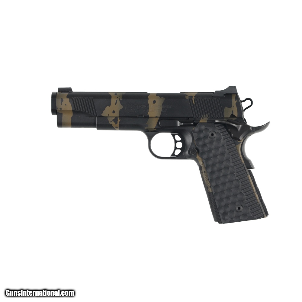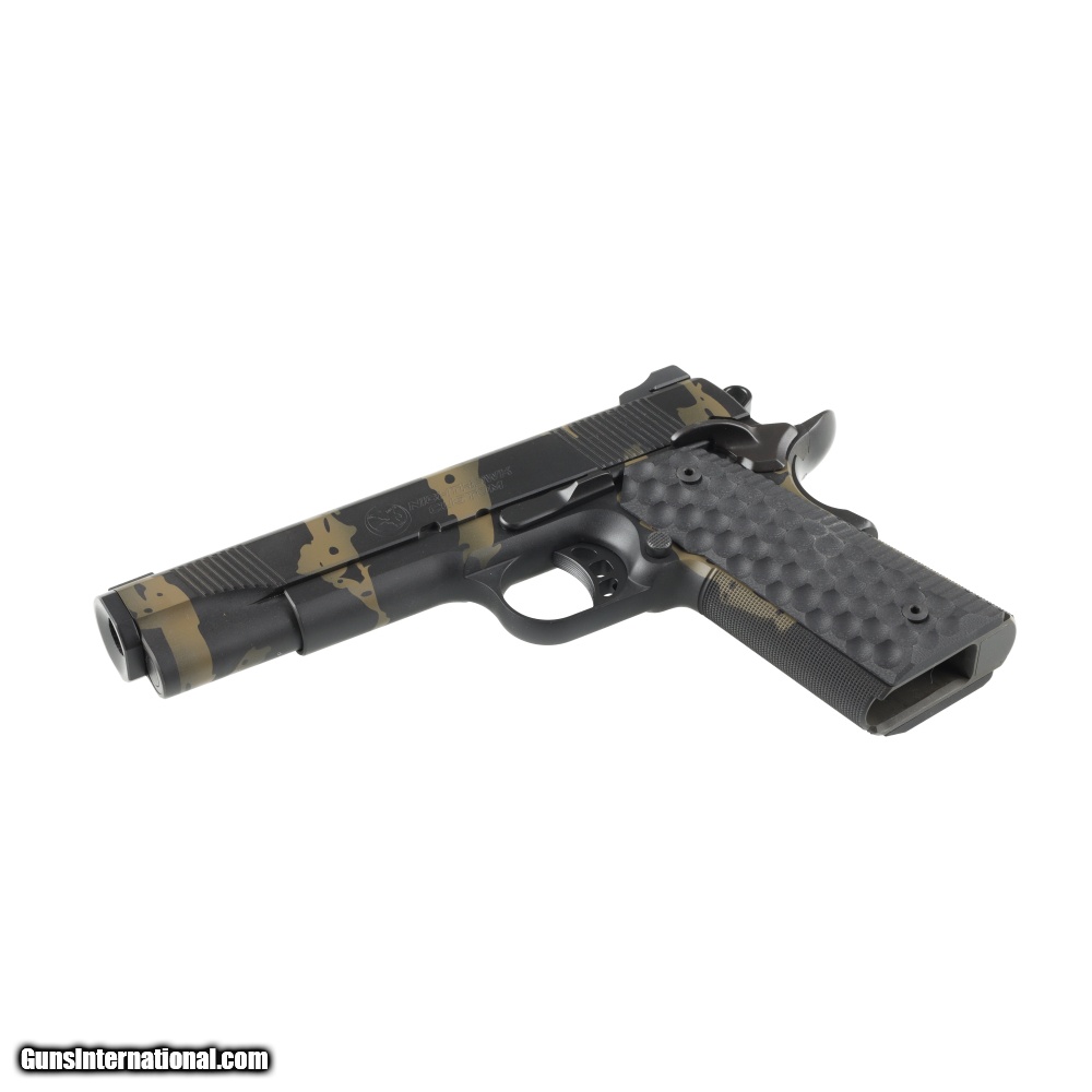Description: The Nighthawk Predator family of pistols is specifically designed to reduce felt recoil and muzzle flip. The core of the design revolves around the use of the use of a full length guide rod and coned (wafered) bull barrel. These details move the center of balance forwards in order to achieve the desired reduction of muzzle flip and recoil. This example of the Predator includes extra barrel flutes and a custom tiger stripe camouflage. Manufactured in: USA Hand: Right Hand Action Finish: Cerakote Metal Finish: Original Barrel Length: 5 Inches Barrel Condition: New Stock Finish: Original Stock Condition: New Grip: Pistol Extra Barrels: No. SOLD Manufacturer: Nighthawk Model: Predator Caliber Info: .45 ACP Condition: New Metal Condition: New Action: Semi Automatic Triggers: Single Finish: Original Weight: 2.4 lbs Extras: No. Case: Maker's Case |
