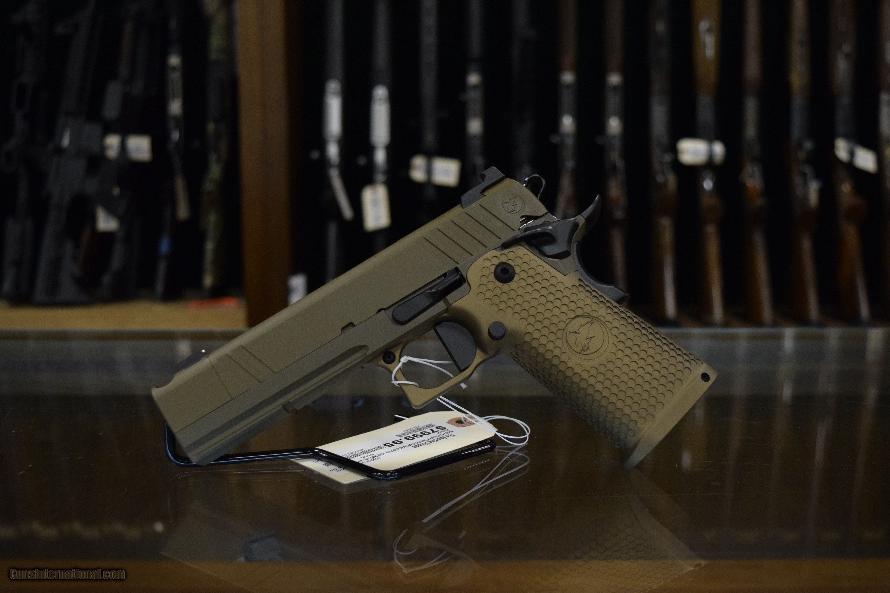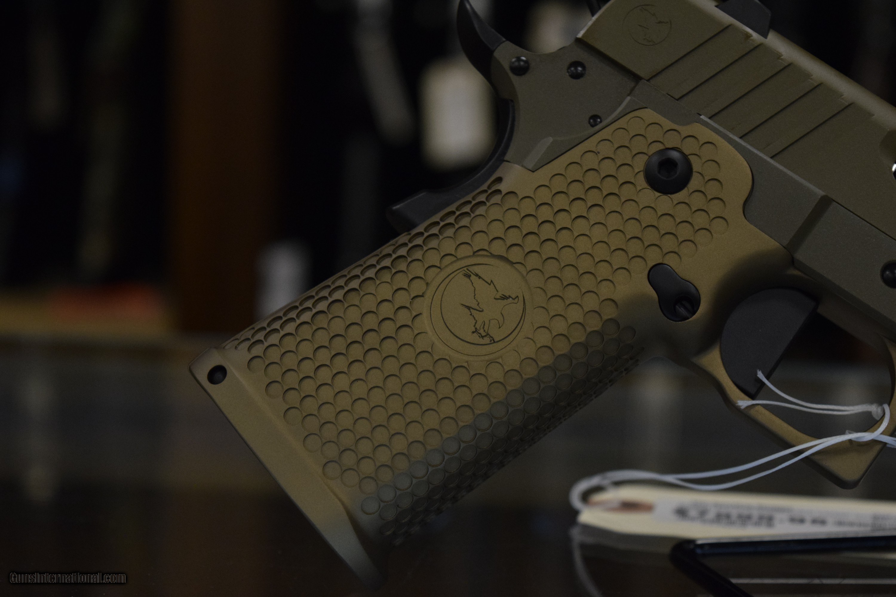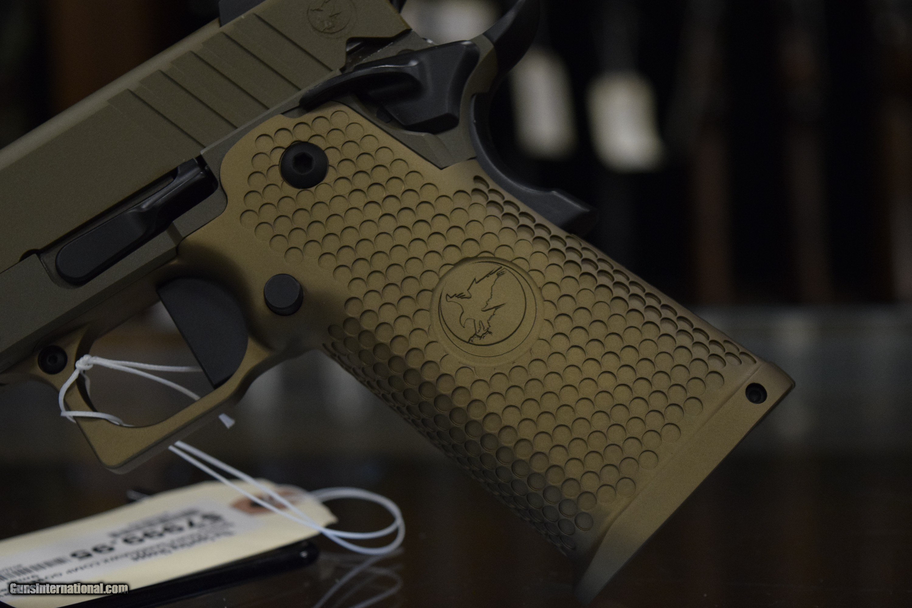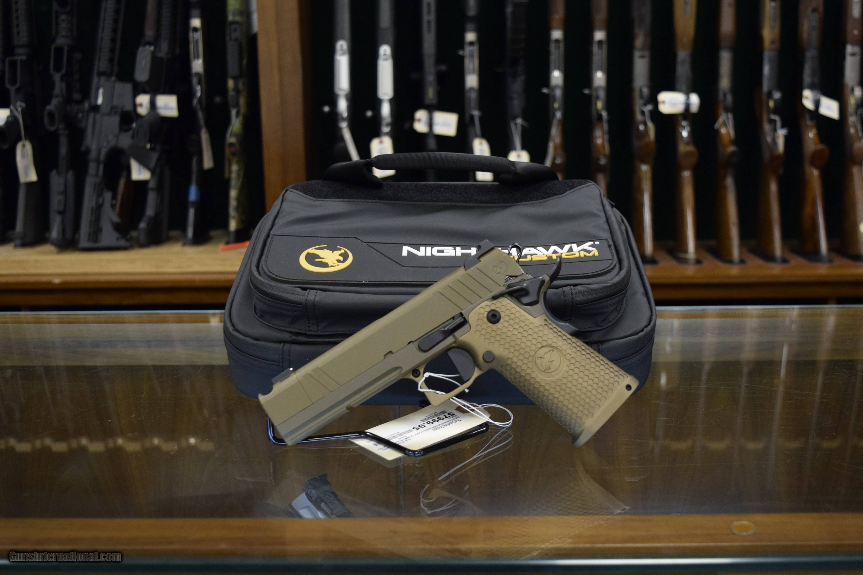 Description: The pinnacle of precision and performance: the Nighthawk Custom Sand Hawk double stack 1911. Meticulously crafted to redefine excellence in firearms, this masterpiece seamlessly blends innovation with tradition, delivering an unparalleled shooting experience. Crafted with expertise, every component of the Sand Hawk is fully machined from billet steel and meticulously hand-fit by a single gunsmith. Engineered for optimal performance, the Sand Hawk features a billet steel double stack frame and anodized aluminum grip. Designed with a custom Cerakote finish, the Sand Hawk boasts three shades of Flat Dark Earth (FDE) and tan anodize, elevating aesthetic appeal while ensuring durability in any environment. Equipped with a single port compensator, the Sand Hawk effortlessly tames recoil, providing the ultimate control and extreme accuracy with each shot. Experience the single port compensator, allowing you to maintain focus on your target without compromise. At the forefront of precision shooting is the 14k gold bead front sight, offering excellent visibility and alignment. Combined with a full-length dust cover, the Sand Hawk achieves great balance, enhancing stability and reducing muzzle flip for swift follow-up shots. With a capacity of 17+1 rounds of 9mm, the Sand Hawk ensures you're always prepared for whatever the situation demands. You can also add the Interchangeable Optic System, ambidextrous safety, aggressive grip, fluted barrel, French border, etc. Experience the pinnacle of precision with the Nighthawk Custom Sand Hawk. It’s more than a firearm, it's a legacy of hand-crafted excellence.