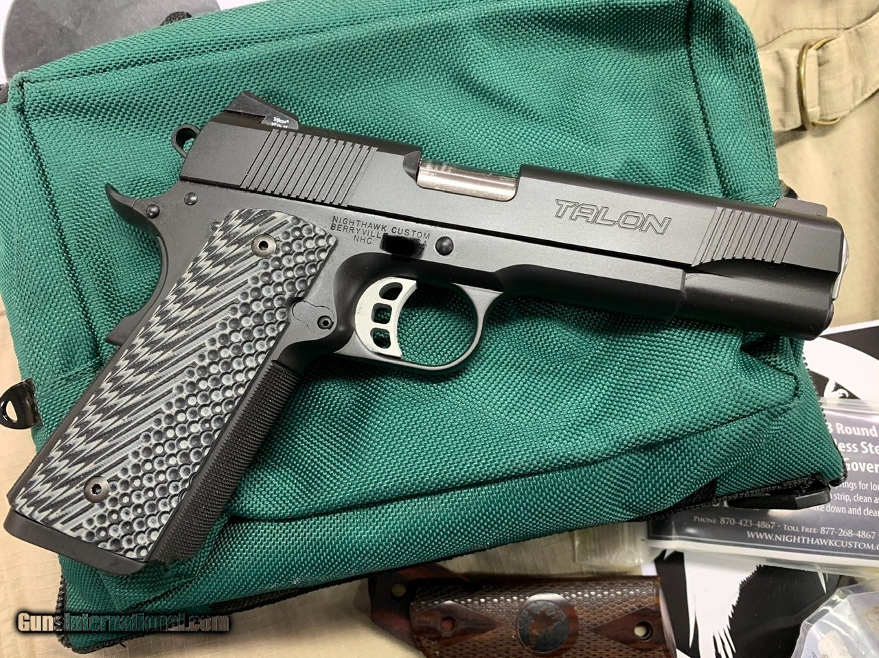 Description: Very nice Nighthawk Talon .45 acp pistol built in 2015. Pistol is in excellent shape, and has been through about 700 rounds. I am the second owner, still looks like new, it hasn’t seen any holster time. Comes with thin grips (can’t remember brand but not VZ), original grips, bushings and screws are included along with factory mag, bag, paperwork and test target. Night sights still have some glow, front sight is marked 2014. Insured shipping is $50 CONUS. SOLD Handgun Caliber: .45 ACP (.45 Auto) |