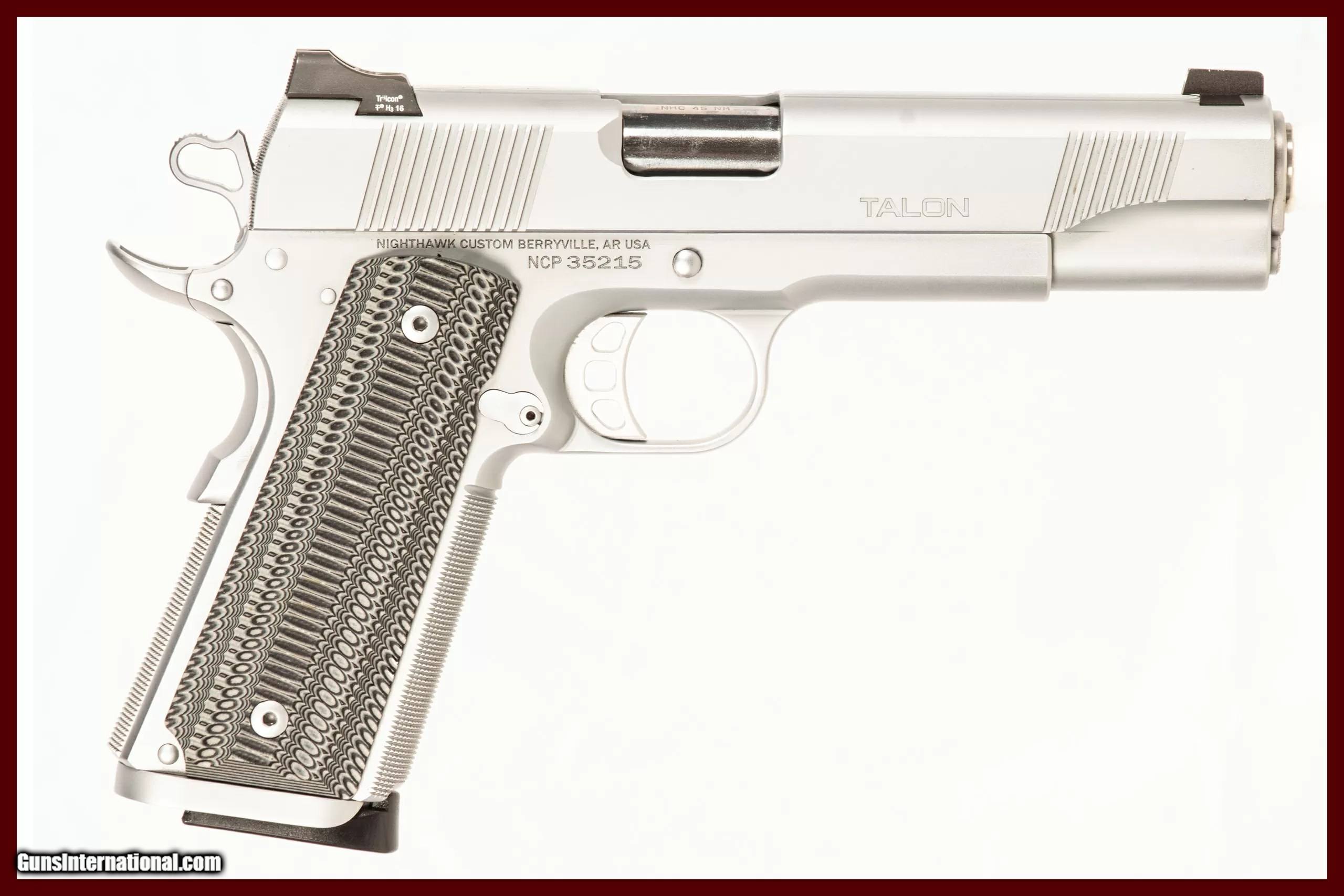 Description: Nighthawk Custom Talon chambered in 45 ACP with a 5 inch barrel, bright bore, and sharp rifling. This 1911 comes with the case and 2 extra magazines. The NRA grading condition for this USED firearm is Excellent. Dury's Lifetime Warranty: All firearms purchased from Dury’s Gun Shop, NEW or USED, are covered by a lifetime warranty. We will repair or replace, at our discretion, any firearm purchased from Dury’s Gun Shop, Inc. for as long as it is owned by the purchaser. This warranty is not transferable. WE BUY GUNS! NO COLLECTION TOO BIG OR SMALL FOR OUR GUNS INTERNATIONAL CUSTOMERS ALL OF OUR FIREARMS CAN BE PURCHASED DIRECTLY FROM OUR DURY'S GUNS SITE ! SOLD Manufacturer: NightHawk Model: Talon Caliber Info: 45 ACP Barrels: 5inches |