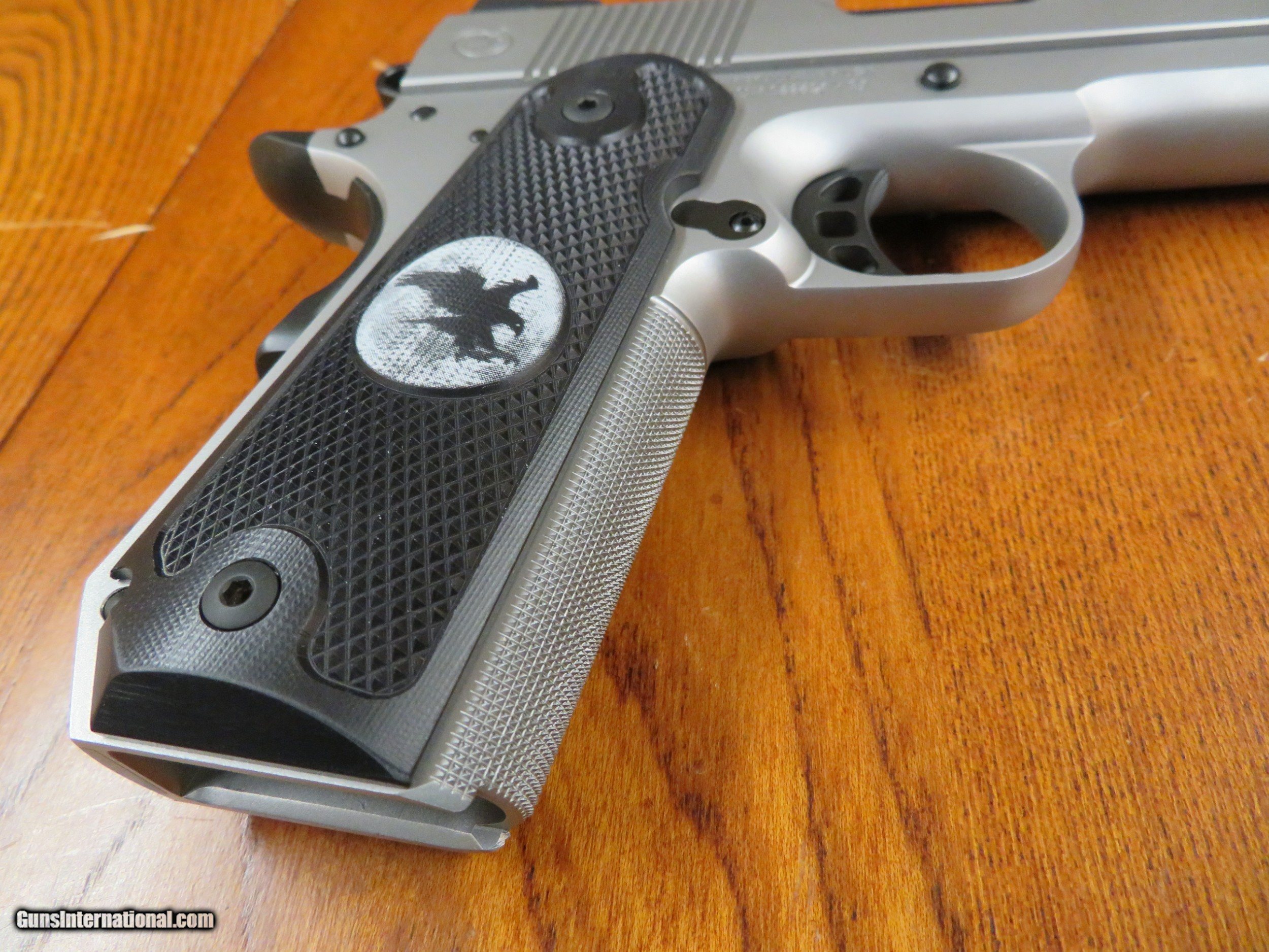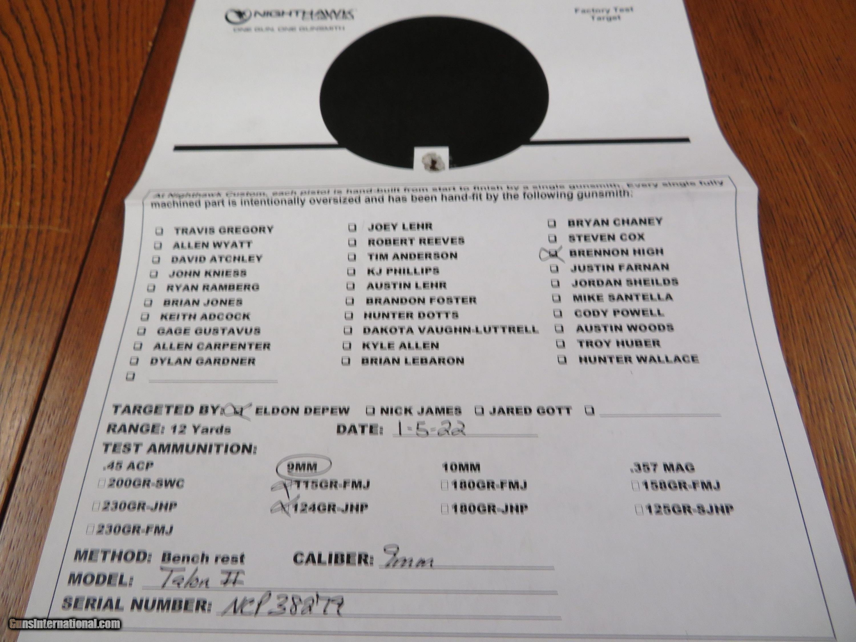 Description: 100 % NEW IN NIGHTHAWK CUSTOM CASE 9 MM TALON - II SS WITH BLACK NITRIDE ON ALL SMALL PARTS FLUTED BARREL CONTOURED CARRY CUT NO ENGRAVING ON SLIDE MOONHAWK LOGO BEHIND COCKING SERATIONS CROWNED BARREL. WITH FACTORY TEST TARGET. THIS IS A SPECIAL ORDER NIGHTHAWK. PLEASE CK PICS MORE IF NEEDED. SHIPPING TO LOWER 48 USPS PRIORITY OVER NITE WITH INS. $100.00 SOLD Rifle Caliber: 9x19mm Parabellum (9mm Luger, 9x19mm NATO) Handgun Caliber: 9x19mm Parabellum (9mm Luger, 9x19mm NATO) Manufacturer: NIGHTHAWK Model: TALON II Bore: MINT Condition: NEW IN CASE Metal Condition: EXCELLENT Wood Condition: MINT Bore Condition: MINT |