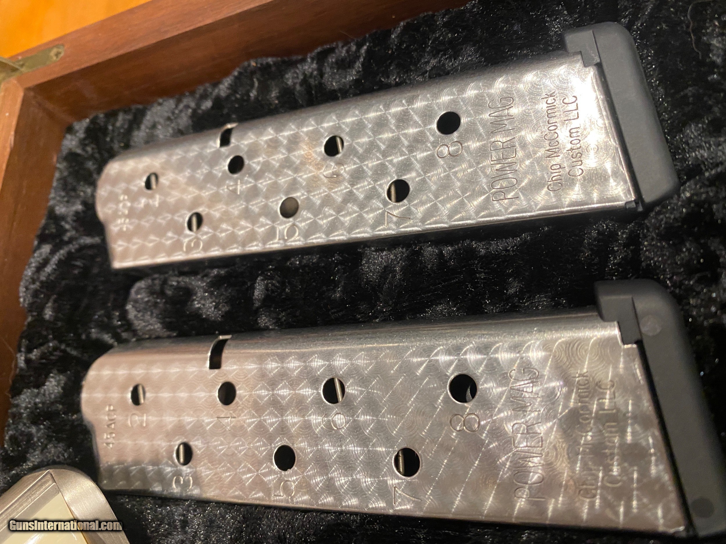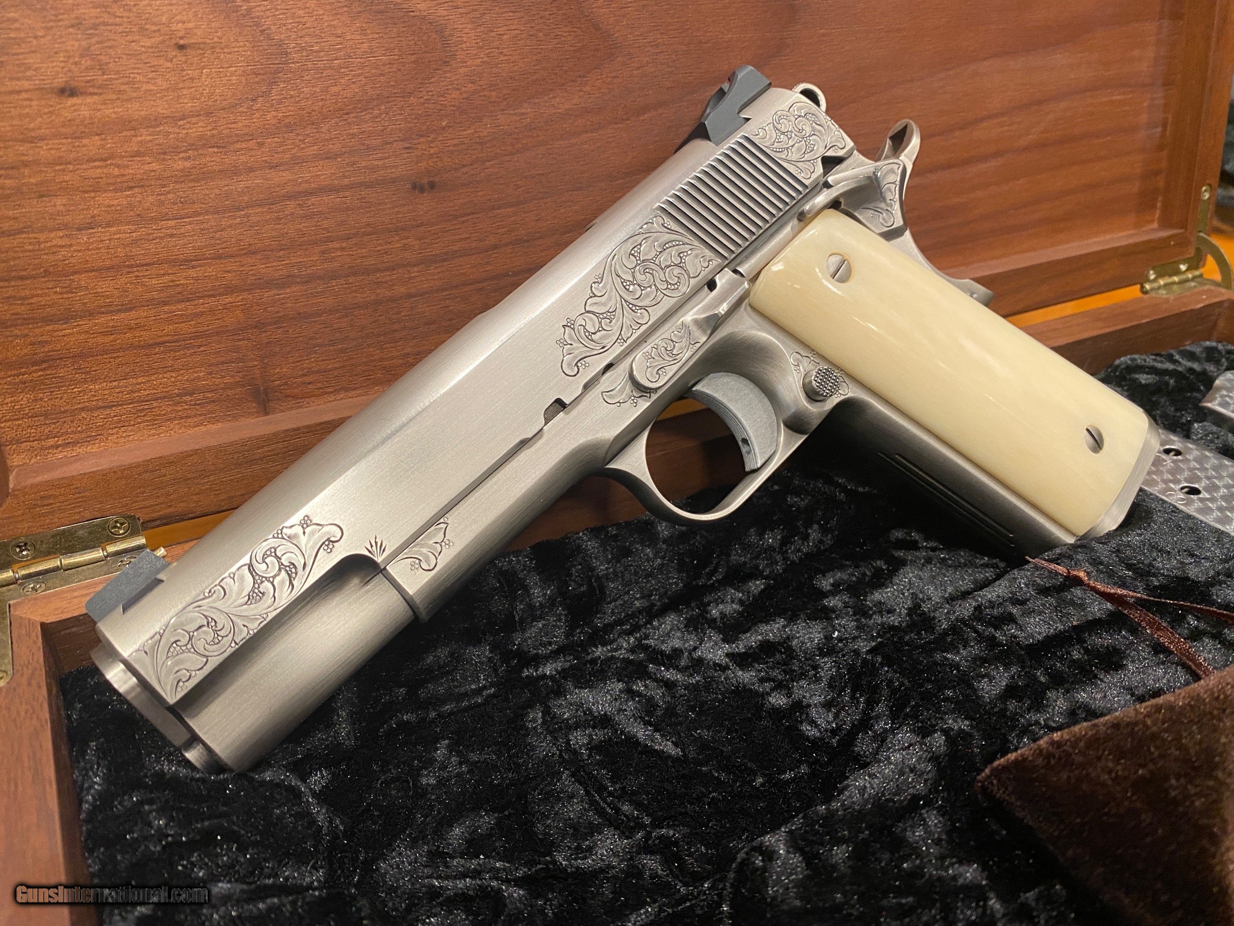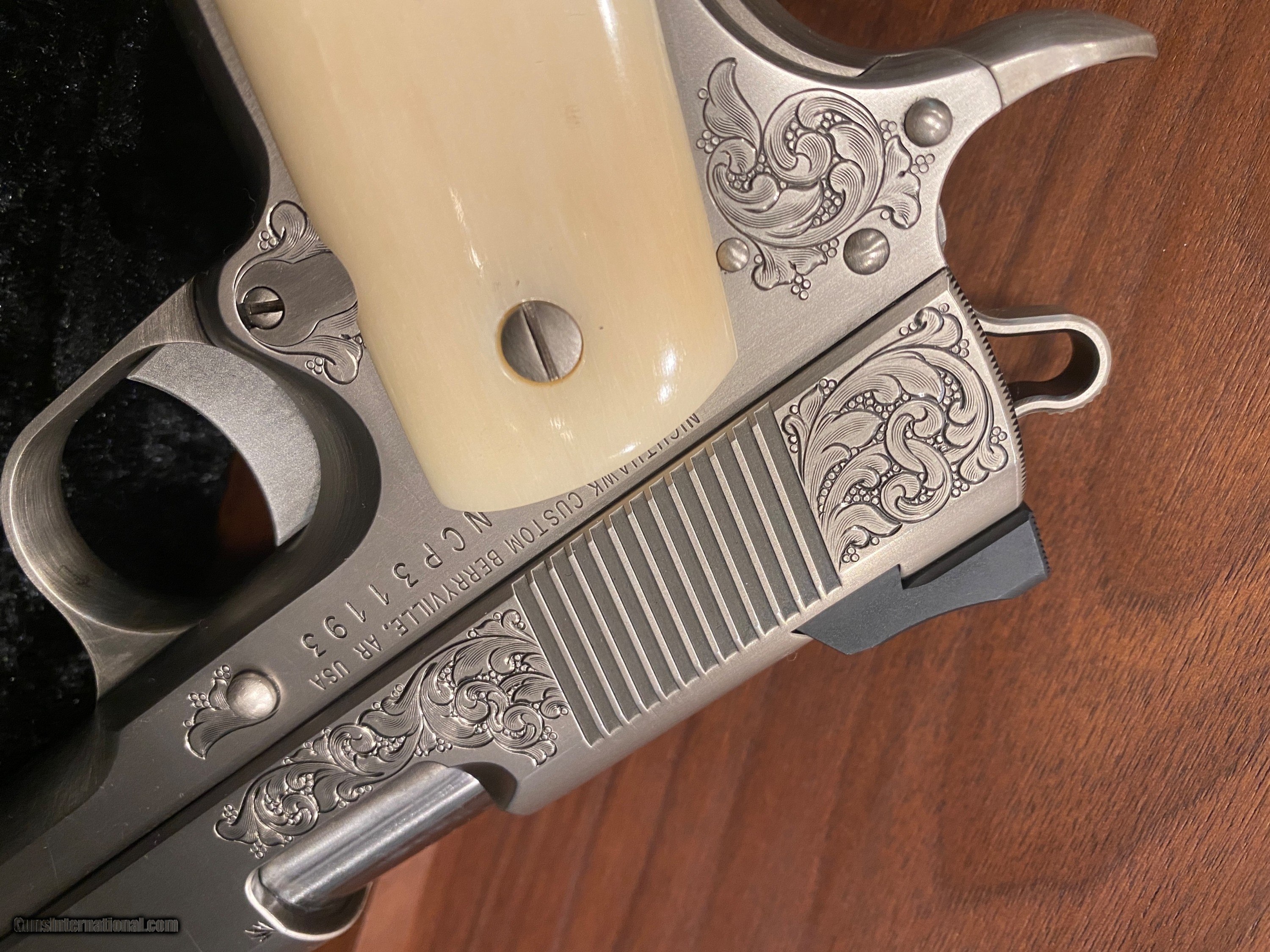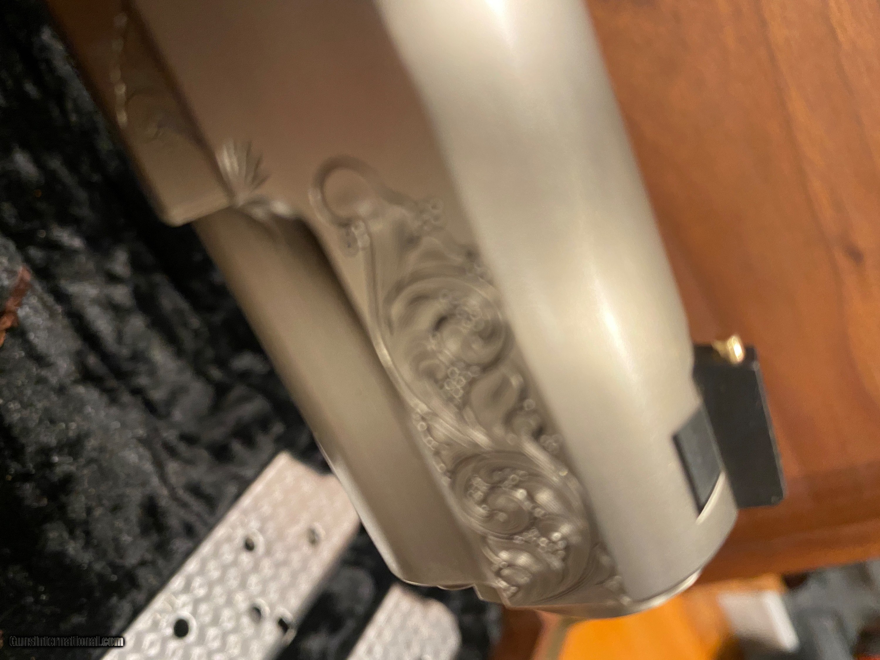 Description: This pistol in as new condition- A true collector piece. Comes with all original paperwork. Custom vertical front strap and mainspring serrations. Nighthawk fully machine one piece mainspring housing and magwell, hand serrated rear of the slide and ejector matching the heinie black rear sight. Nighthawk gold bead front sight and crowned barrel, The pistol has been tastefully deep hand engraved. A classic antique nickel finish, giraffe grips and custom display box to complete the special custom package. SOLD Handgun Caliber: .45 ACP (.45 Auto) Manufacturer: Nighthawk Custom Model: VIP Condition: Excellent Metal Condition: Excellent Bore Condition: Excellent |