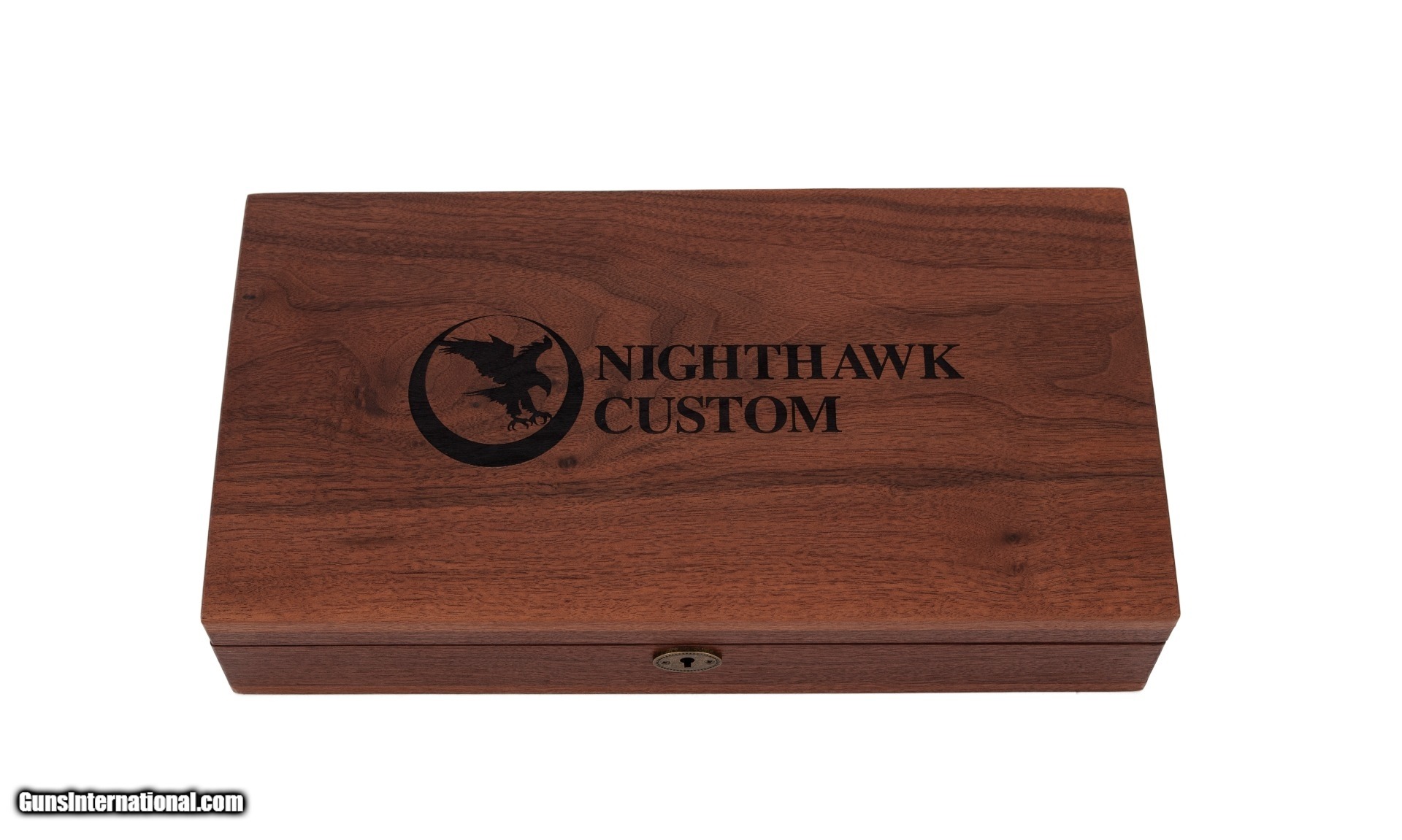 Description: VIP Comm. .45 ACP Custom Vertical Front Strap and Mainspring Serrations. Nighthawk Fully Machined One Piece Mainspring Housing and Magwell Hand Serrated Rear of the Slide and Ejector Matching the Heinie Black Rear Sight. Nighthawk Gold Bead Front Sight and Crowned Barrel The Pistol has been Tastefully Deep Hand Engraved. A Classic Antiqued Nickel Finish Giraffe Grips and Custom Display Box complete the Special Custom Package. SOLD Manufacturer: Nighthawk Model: VIP COMM Caliber Info: .45 ACP Condition: New Metal Condition: New Barrels: 4.5 Action: Semi Automatic Gauge Info: .45 ACP Case: Wood Box |