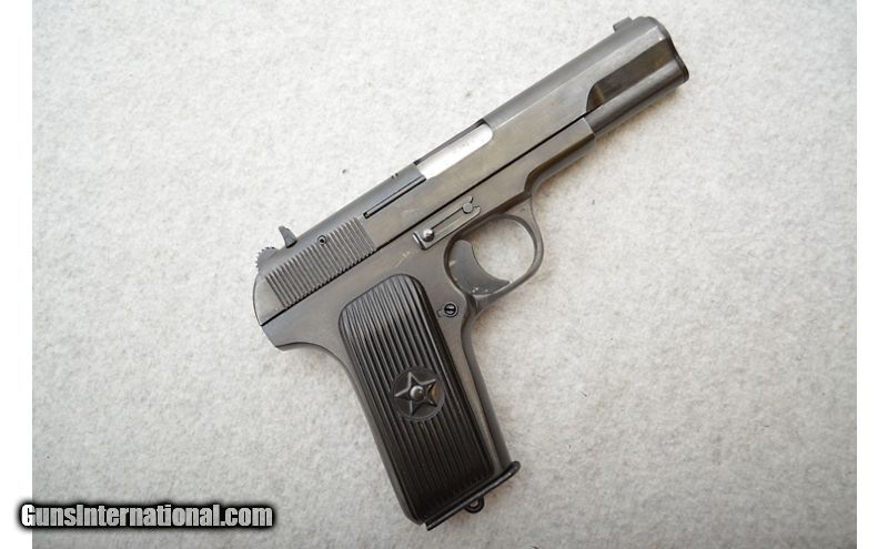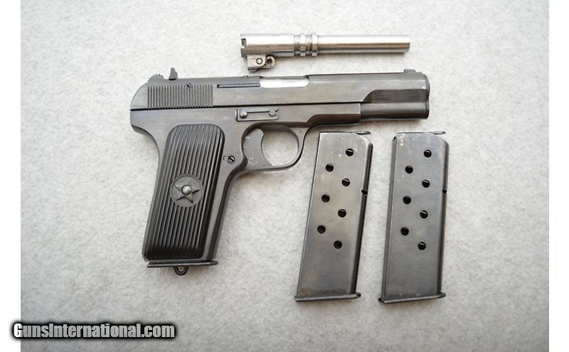 Description: Good shape overall but not perfect. The metal has a good number of handling marks. The marks are mostly on the right side of the slide in the front flat area. Some of the edges are also showing thinned bluing. Most of the marks around the ejection port area look to have been caused by disassembly with the retaining clip. Comes with a total of 3 magazines and a 9mm Luger barrel. 7.62x25mm Tokarev SOLD Chambers: Semiautomatic fed from detachable magazines. Metal Condition: Good. Wood Condition: Grips are in very good condition. Bore Condition: Bores on both barrels are in excellent condition. Barrels: 4½" Stainless. Triggers: Solid blued metal with smooth face. Stock Dimensions: N/A Fore End: N/A Butt Pad: Black plastic grip panels with communist stars. Weight: 2LBS Sights: Fixed front blade and rear notch. Chokes: N/A Item Location: Green Bay |