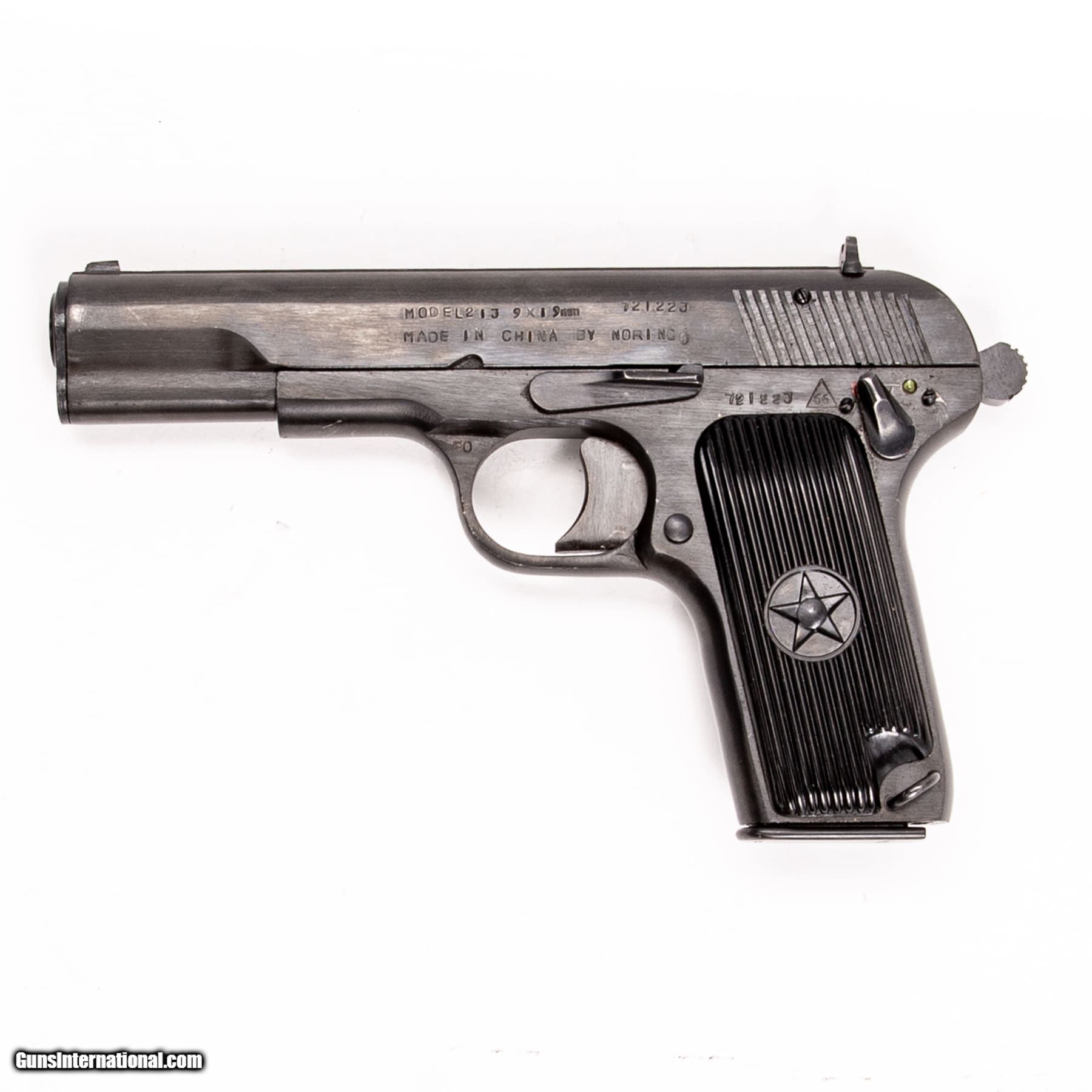 Description: The Norinco Model 213 is a Chinese Tokarev pistol in 9mm. The Tokarev was the Soviet Union's main semi-automatic handgun during WWII and at the beginning of the Cold War. This model is in very good condition and comes with one 8-round magazine. SOLD Manufacturer: NORINCO Model: MODEL 213 Caliber Info: 9MM LUGER Condition: used Barrels: 4.4 BARREL Finish: BLUE |