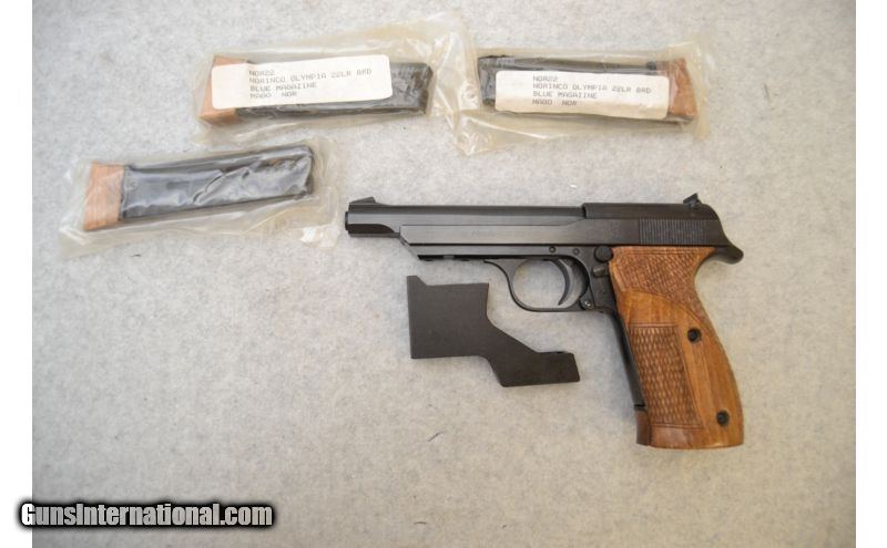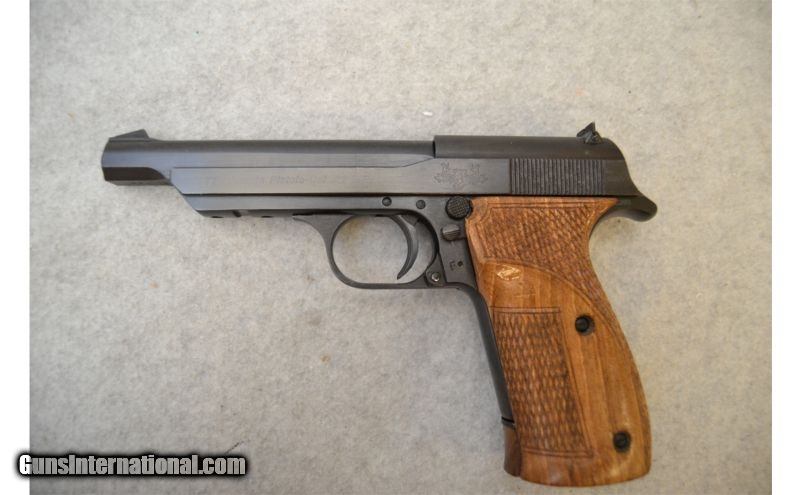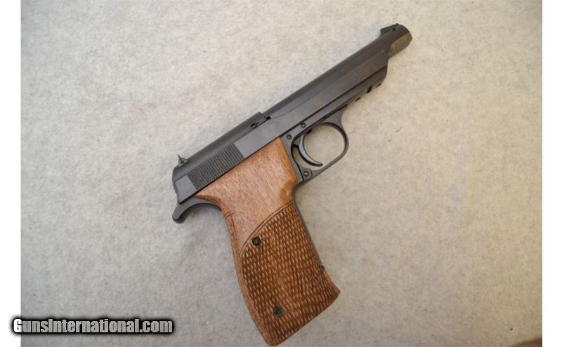 Description: Overall condition of this pistol is good. The blued finish is almost entirely intact with some minor handling and usage marks. The thumbrest grips have a small chip missing by the safety lever and a minor dent under the thumbrest. The bore is in great shape with plenty of life left in it and good shine. SOLD Caliber Info: .22 Long Rifle Chambers: Semi-automatic fed from detachable magazines. Metal Condition: Good. Wood Condition: Good. Bore Condition: Excellent. Barrels: 5" Blued. Triggers: Black metal with grooved surface. Stock: Checkered walnut thumbrest grips. Weight: 2lbs As pictured. Sights: Fixed front blade with windage adjustable notch rear. Extras: Comes with the counter weight (but no mounting screws for it sadly) and a total of 4 magazines. 3 of the magazines are still in their original packaging. Item Location: Green Bay, WI |