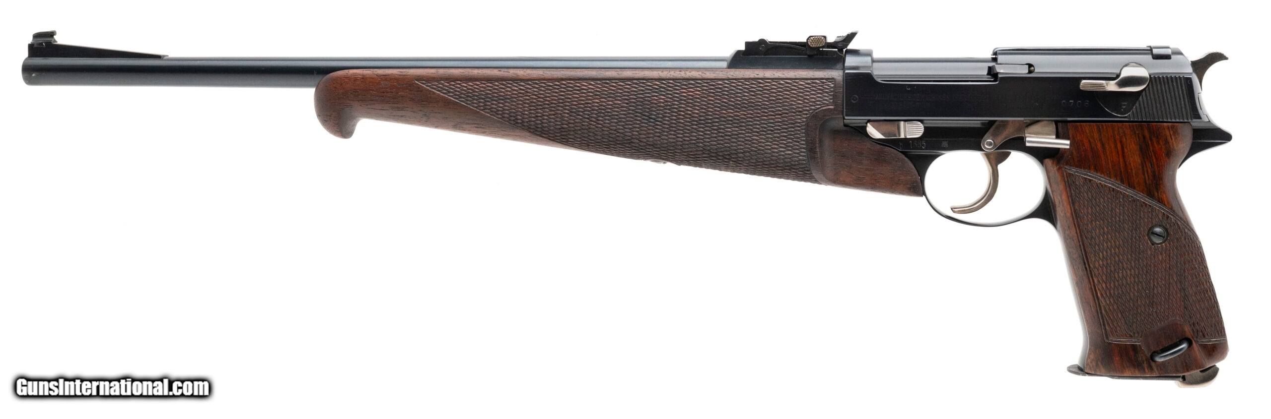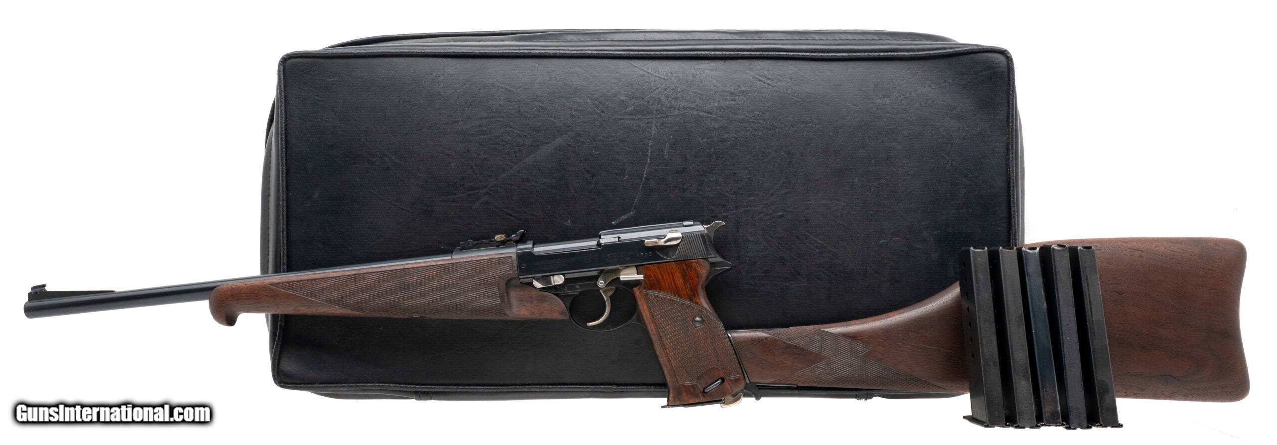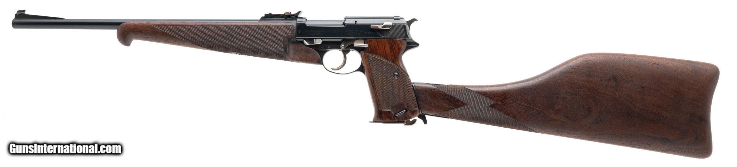Description: "Serial number B1885. Made in 1984. This gun is in 9mm (9x19) and has a 16" barrel. This gun is in like new condition as customized by legendary gunsmith John Martz. John Martz worked in the Navy and then had a job involving airplanes in the civilian world before retiring and focusing completely on restoring and modifying primarily lugers, but also P-38s. He is best know for making his baby lugers and 45 caliber conversions for lugers, but he also converted both lugers and p-38s to a myriad of different calibers. This Manurhin P1 has been converted into a carbine. Both the grips and the forum are made of Circassian Walnut. The rear sight on the barrel is off an artillery luger. This gun comes with a travel case. In the case are 5 additional magazines. In the case is a card with the original description and price tag. On the back of the card it is dated December 2, 1984. Very neat P-38 Carbine Set by a legendary gunsmith! Price: $8,950.00 Contact Seller |