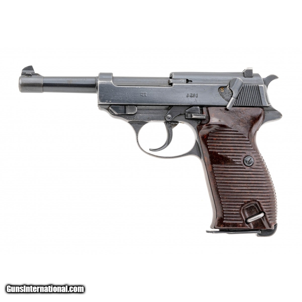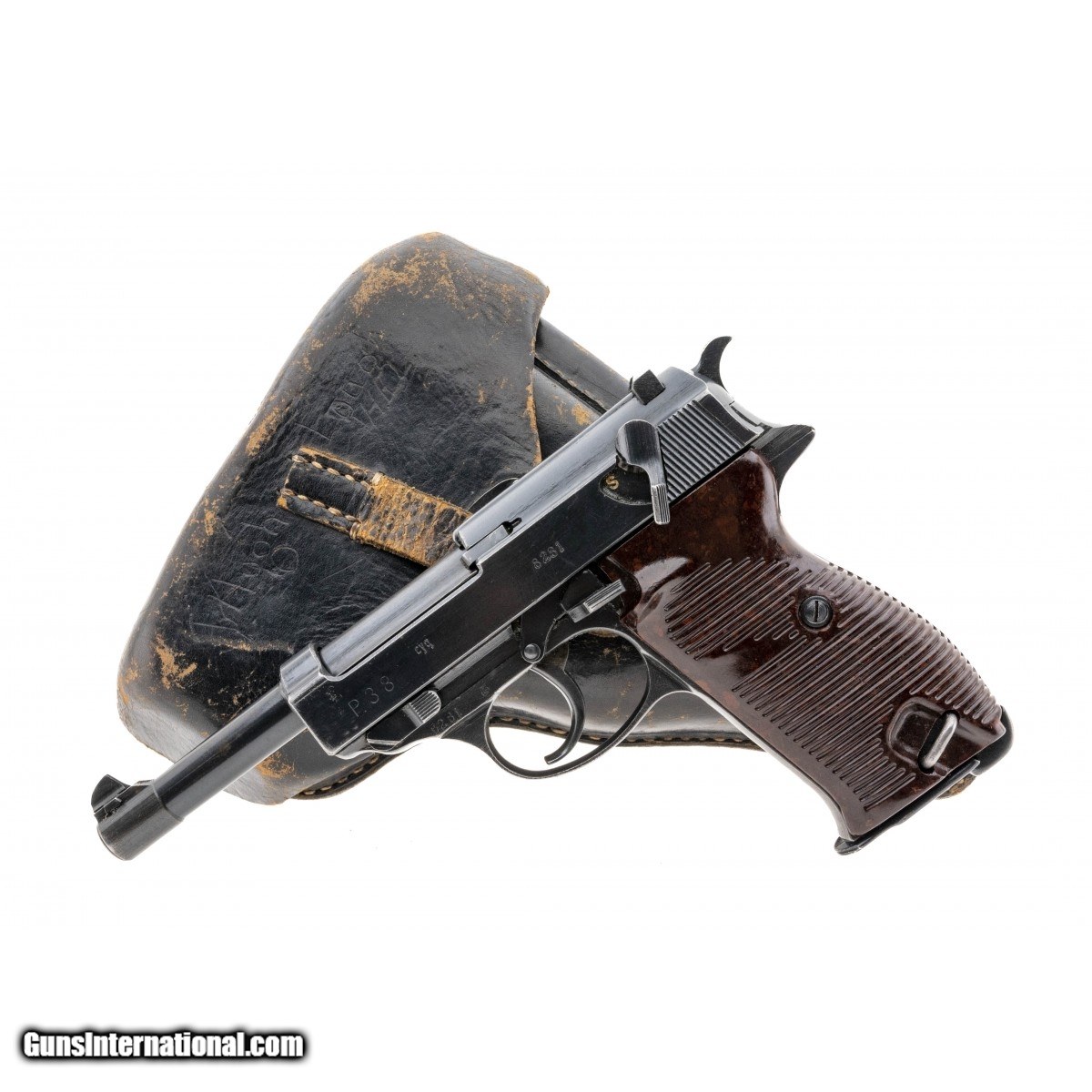 Serial No. 8281, chambered in 9mm with 5" barrel Spreewerke P38. Overall very good plus condition with 90% original blue remaining, front strap shows wear and is turning into a gun metal grey finish. Grips are good with some light scratches noted, waffenampts noted throughout. Bore is bright and shiny with strong rifling visible. Comes with Hardshell holster marked P38 gcx 1942. A soldiers name is marked on the inside and outside. Holster shows moderate scattered scuffing.