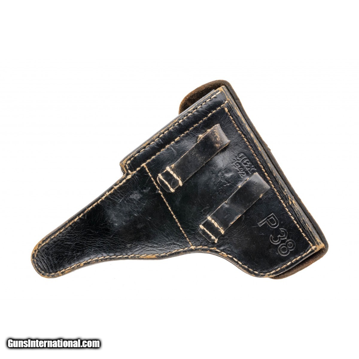 Description: " Serial No. 8281, chambered in 9mm with 5" barrel Spreewerke P38. Overall very good plus condition with 90% original blue remaining, front strap shows wear and is turning into a gun metal grey finish. Grips are good with some light scratches noted, waffenampts noted throughout. Bore is bright and shiny with strong rifling visible. Comes with Hardshell holster marked P38 gcx 1942. A soldiers name is marked on the inside and outside. Holster shows moderate scattered scuffing. SOLD Curio/Relic: Yes |