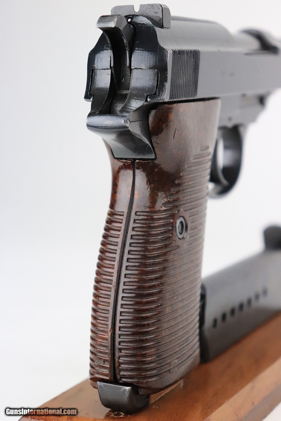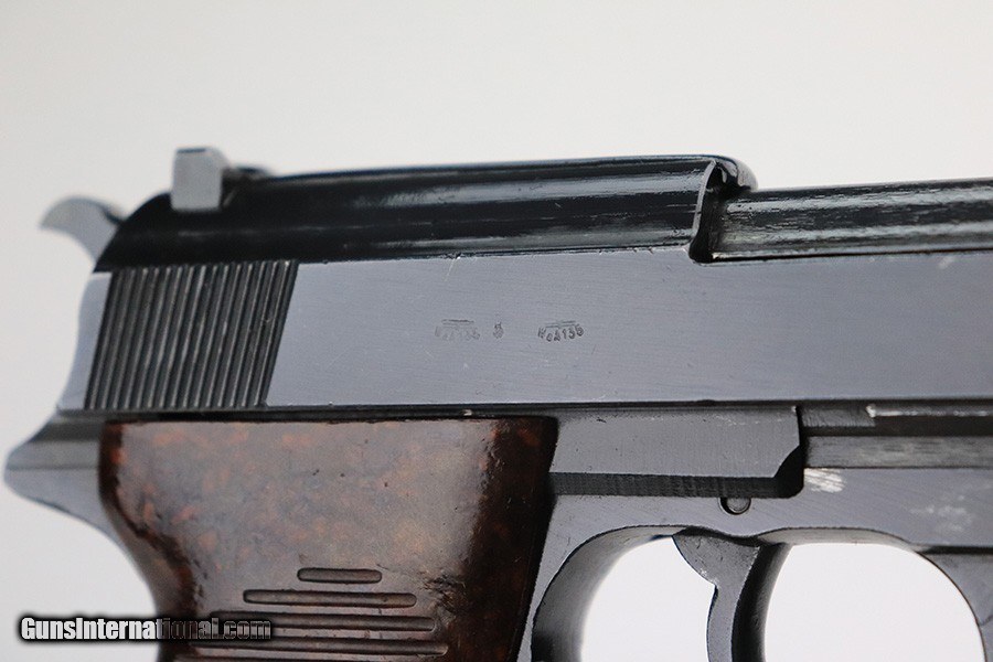 Description: This is an excellent example of a Mauser P.38 issued to the Nazi military in 1944. It is all matching and has the proper "Waffen 135" military acceptance proofs. This one also has a rare FN-made slide. We believe the gun has been refinished, but the bluing is really nice throughout. There is very little finish loss, just some tiny dots of wear on the barrel and a few very light scratches on both sides of the slide. Comes with really nice reddish grips and a period-correct Mauser magazine. Excellent bore with strong rifling. De-cocker is functional. SOLD Curio/Relic: Yes Handgun Caliber: 9x19mm Parabellum (9mm Luger, 9x19mm NATO) Bore: 9/10 Condition: Refinished |