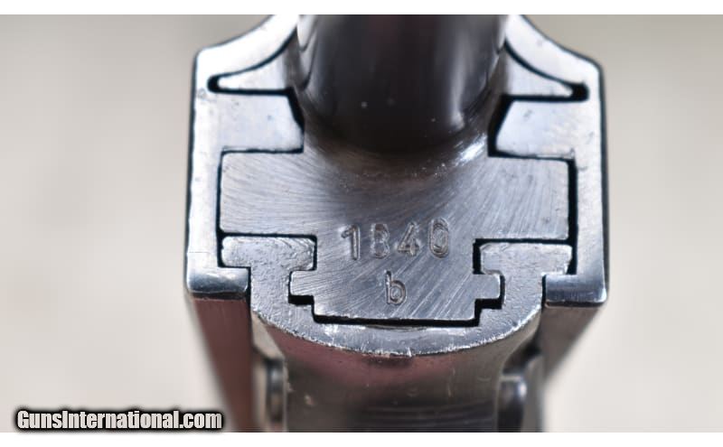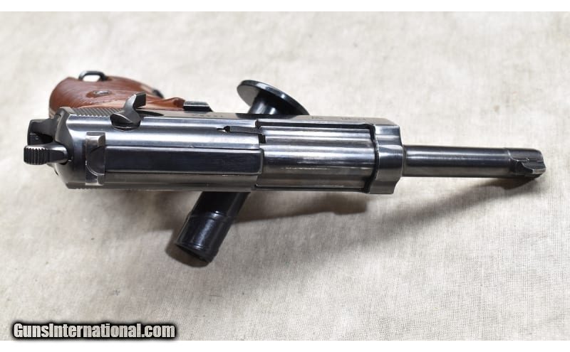 Description: Good collector piece featuring matching exposed S/N's. The barrel is a little rough but clean and good rifling. Grips have no problems. Stamps on right side of slide are a bit light but legible. 9mm Parabellum SOLD Chambers: 8 rounds Metal Condition: Good. Nice blue with wear showing at the high points and around the muzzle. Wood Condition: Very good. Bore Condition: Clean with good rifling. Seems a little rough. Barrels: 5-inch Triggers: Factory double and single action trigger with de-cocker. Butt Pad: Grooved bakelite. Weight: 33 oz. Sights: Post and notch. Item Location: Rogers |